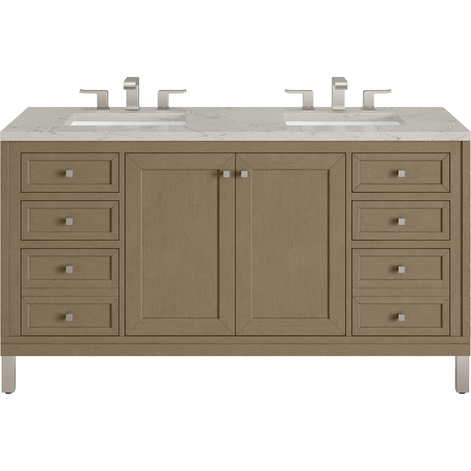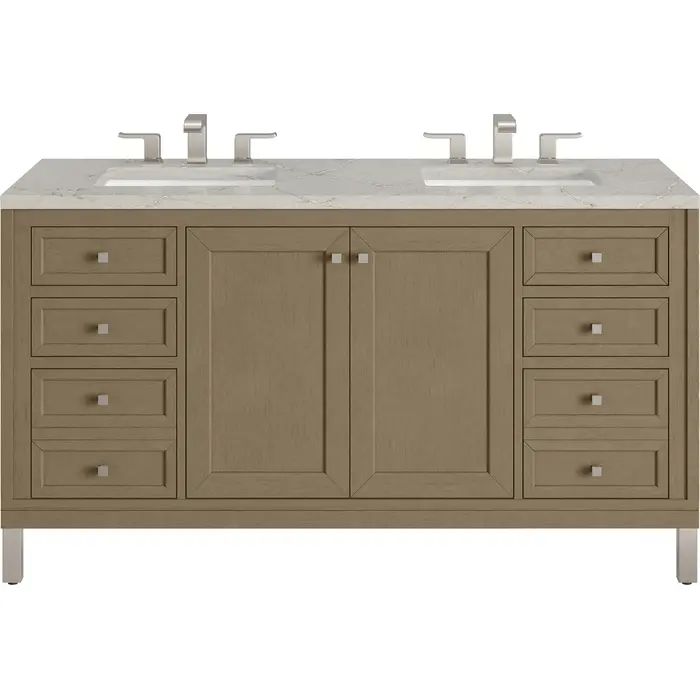 The sophisticated details and clean lines of the Chicago 60" Double Vanity by James Martin Vanities make it the perfect choice for any bathroom. Featuring a Walnut Whisper finish, this vanity offers ample storage with its double-door cabinet, adjustable interior shelves, and six drawers (two tip-outs, two standard, two double-deep). Brushed Nickel knobs and legs add a contemporary touch; or choose to forego the metal legs for a modern wall-mounted installation. The addition of a beautiful Victorian Silver Silestone® top with undermount sinks completes the look. This unit is enabled with FreePower wireless charging; featuring a single-device charger seamlessly embedded into the countertop, indicated by a light-up halo in between the sinks. Designed for modern living, FreePower offers convenient, integrated, wireless charging when and where you need it.FreePower Wireless Charging; single-device unit in between sinksTwo-door cabinet with four full-extension drawers (two double-deep) and two top-row tip-out drawersDrawer boxes feature English Dovetail joinery with premium, soft-close undermount drawer slides; doors feature soft-close, adjustable door hingesCabinet features a multi-stage premium finish coat to offer UV and moisture resistanceWalnut Whisper finish with Brushed Nickel hardwareCountertop is pre-drilled for 8" widespread faucet(s); our 3cm eased edge countertops come with white porcelain rectangular sink(s) that ship separately and include mounting brackets for easy installationFaucet sold separatelyDrawers lined with our signature brushed aluminum laminate for easy cleaningTop-row tip-out drawersMatching stone backsplash available as add-on purchaseDual-mounted: can be installed freestanding or floating with included French Cleat hardwareFaucet sold separatelyThe Chicago Collection is distinctly contemporary, bringing both form and function to your bathroom with clean lines and ample storage. With three available finishes and multiple hardware options, the Chicago collection can be customized to your preferences by choosing to install as a freestanding or floating vanity.1 year warranty against manufacturer's defects. We will repair or replace any defective product, if the product is defective in material or workmanship at our discretion. No warranty is expressed or implied regarding damages resulting from consumer misuse.