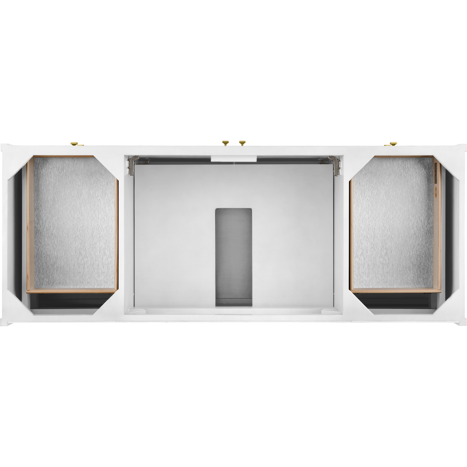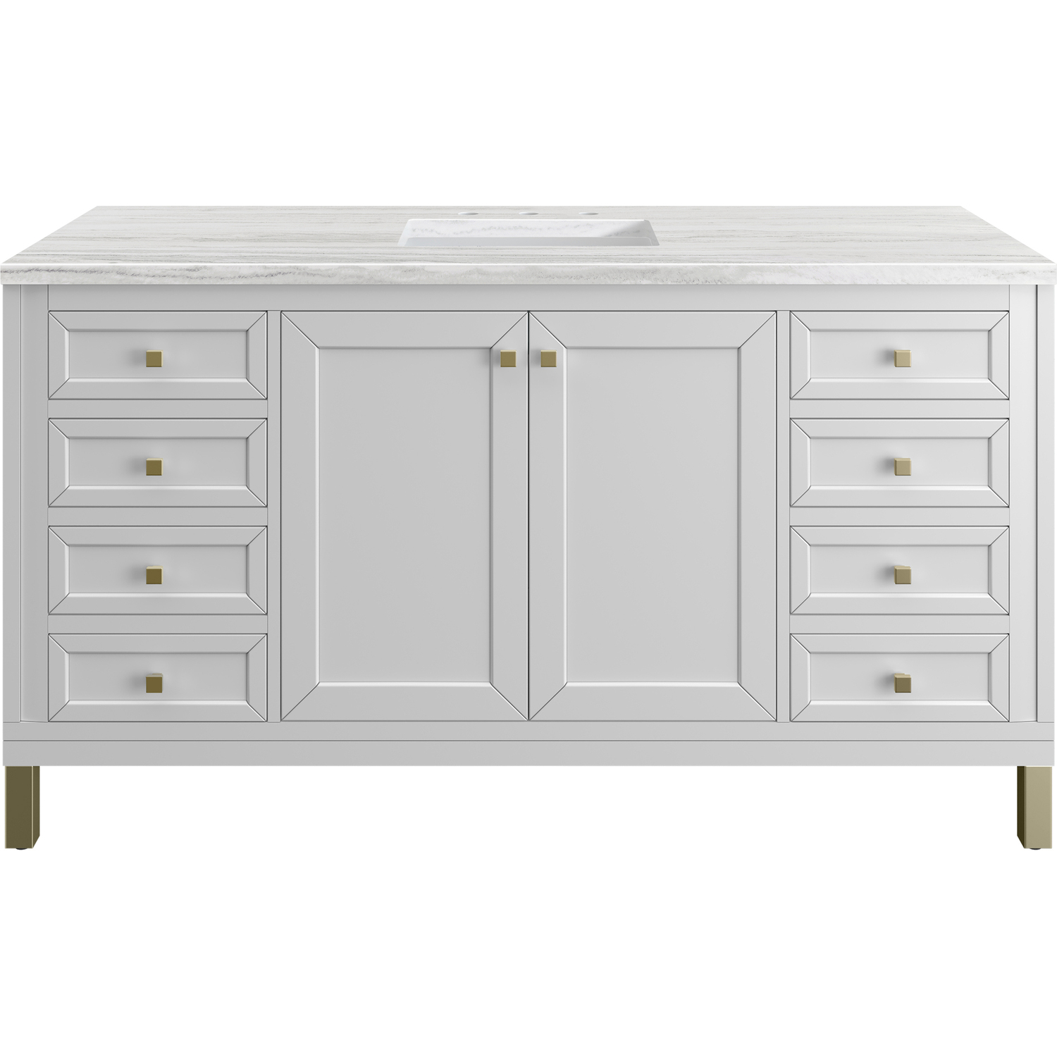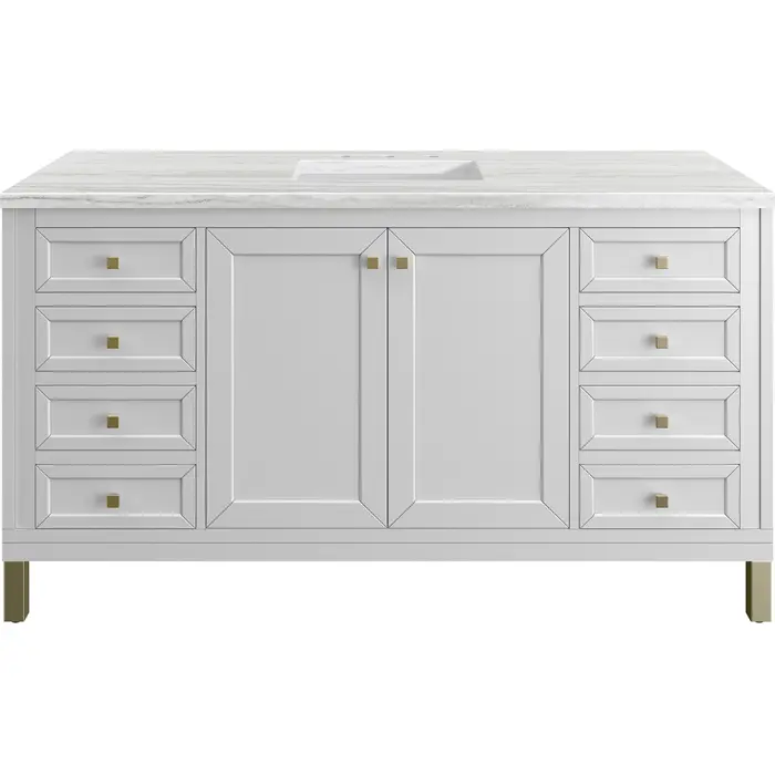 The sophisticated details and clean lines of the Chicago 60" Single Vanity by James Martin Vanities make it the perfect choice for any bathroom. Featuring a Glossy White finish, this vanity offers ample storage with its double-door cabinet, adjustable interior shelves, and six drawers (four standard; two double-deep). Champagne Brass knobs and legs add a contemporary touch; or choose to forego the metal legs for a modern wall-mounted installation. The addition of a modern Arctic Fall Solid Surface top with undermount sink completes the look.Double-door cabinet with adjustable interior shelf; six drawers (four standard drawers and two double-deep drawers on bottom row)Drawer boxes feature English Dovetail joinery with premium, soft-close undermount drawer slides; doors feature soft-close, adjustable door hingesCabinet features a multi-stage premium finish coat to offer UV and moisture resistanceGlossy White finish with Champagne Brass hardwareCountertop is pre-drilled for an 8" widespread faucet; our 3cm eased edge countertops come with white porcelain rectangular sink(s) that ship separately and include mounting brackets for easy installationCrafted from solid kiln-dried PoplarDrawers lined with our signature brushed aluminum laminate for easy cleaningDual-mounted: can be installed freestanding or floatingFaucet sold separatelyJames Martin Vanities top-selling Chicago Collection is distinctly contemporary, bringing both form and function to your bathroom with clean lines and ample storage. With three available finishes and multiple hardware options, the Chicago collection can be customized to your preferences by choosing to install as a freestanding or floating vanity.1 year warranty against manufacturer's defects. We will repair or replace any defective product, if the product is defective in material or workmanship at our discretion. No warranty is expressed or implied regarding damages resulting from consumer misuse.