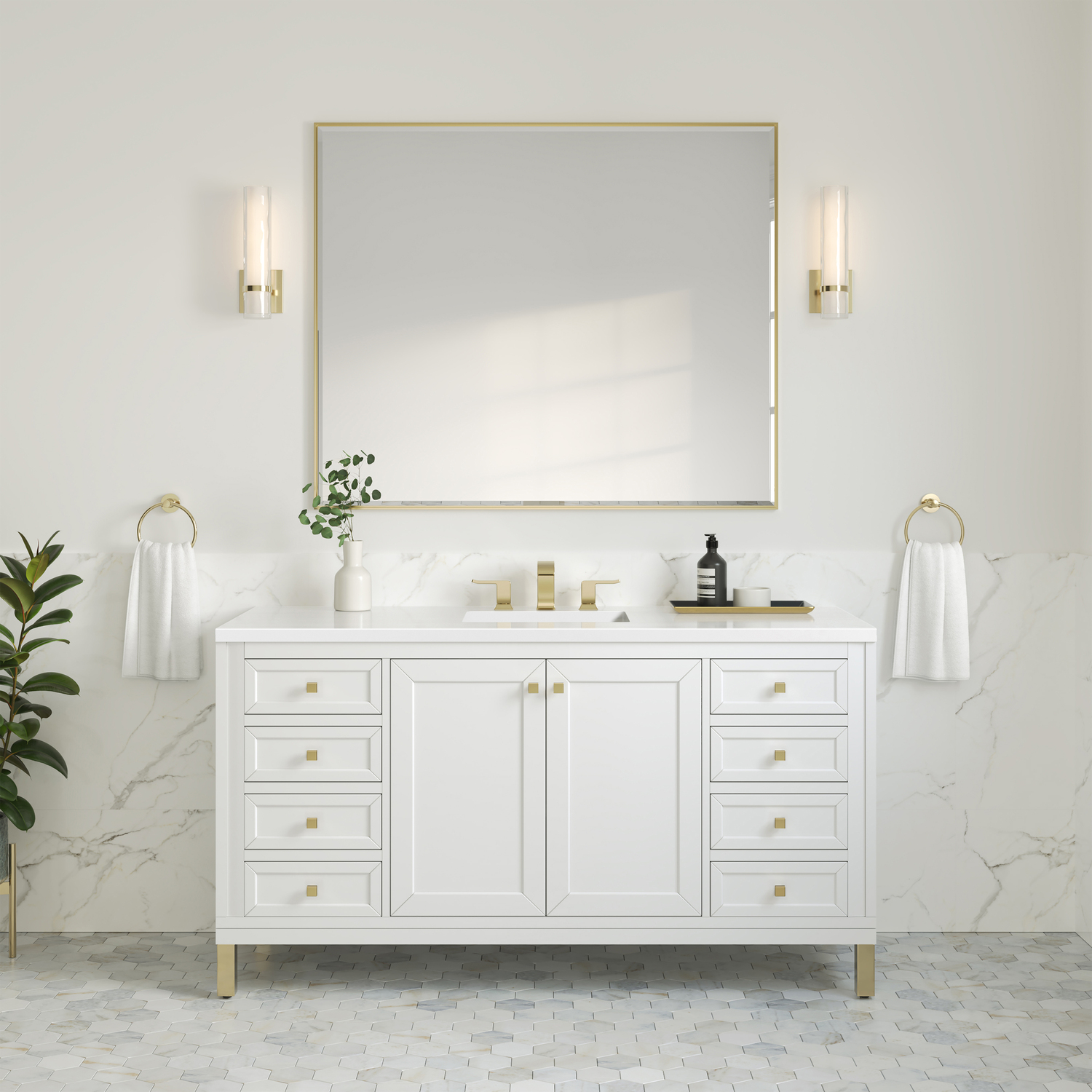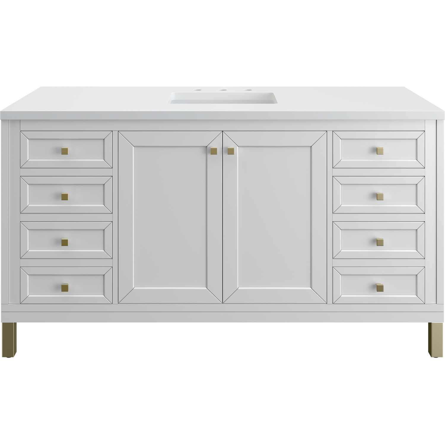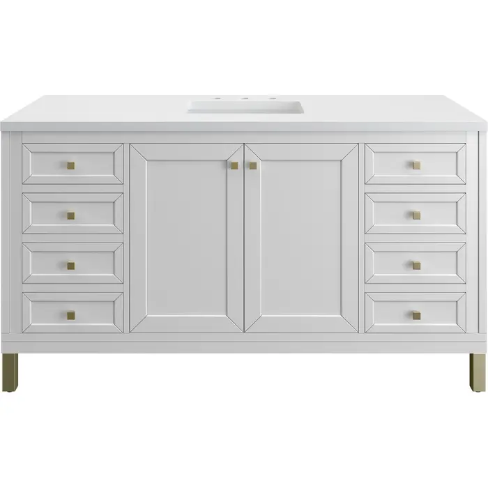 The sophisticated details and clean lines of the Chicago 60" Single Vanity by James Martin Vanities make it the perfect choice for any bathroom. Featuring a Glossy White finish, this vanity offers ample storage with its double-door cabinet, adjustable interior shelves, and six drawers (four standard; two double-deep). Champagne Brass knobs and legs add a contemporary touch; or choose to forego the metal legs for a modern wall-mounted installation. The addition of a classic White Zeus Silestone® top with undermount sink completes the look.Double-door cabinet with adjustable interior shelf; six drawers (four standard drawers and two double-deep drawers on bottom row)Drawer boxes feature English Dovetail joinery with premium, soft-close undermount drawer slides; doors feature soft-close, adjustable door hingesCabinet features a multi-stage premium finish coat to offer UV and moisture resistanceGlossy White finish with Champagne Brass hardwareCountertop is pre-drilled for an 8" widespread faucet; our 3cm eased edge countertops come with white porcelain rectangular sink(s) that ship separately and include mounting brackets for easy installationCrafted from solid kiln-dried PoplarDrawers lined with our signature brushed aluminum laminate for easy cleaningDual-mounted: can be installed freestanding or floatingFaucet sold separatelyJames Martin Vanities top-selling Chicago Collection is distinctly contemporary, bringing both form and function to your bathroom with clean lines and ample storage. With three available finishes and multiple hardware options, the Chicago collection can be customized to your preferences by choosing to install as a freestanding or floating vanity.1 year warranty against manufacturer's defects. We will repair or replace any defective product, if the product is defective in material or workmanship at our discretion. No warranty is expressed or implied regarding damages resulting from consumer misuse.