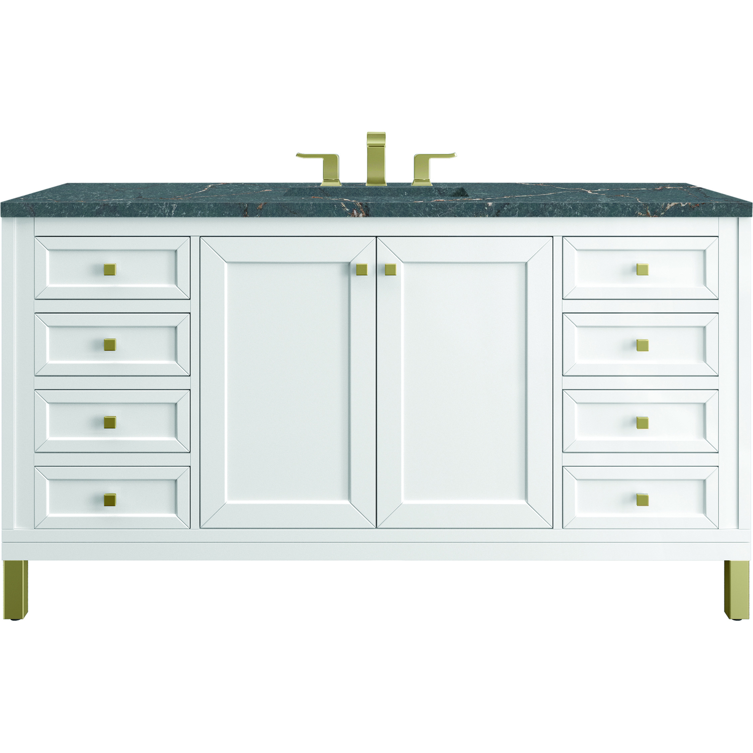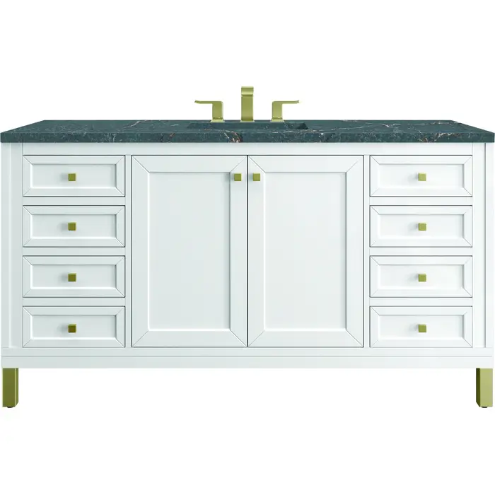 The sophisticated details and clean lines of the Chicago 60" Single Vanity by James Martin Vanities make it the perfect choice for any bathroom. Featuring a Glossy White finish, this vanity offers ample storage with its double-door cabinet, adjustable interior shelves, and six drawers (four standard; two double-deep). Champagne Brass knobs and legs add a contemporary touch; or choose to forego the metal legs for a modern wall-mounted installation. The addition of a stunning Parisien Bleu Silestone® top with undermount sink completes the look. This unit is enabled with FreePower wireless charging; featuring a single-device charger seamlessly embedded into the countertop, indicated by a light-up halo to the left of the sink. Designed for modern living, FreePower offers convenient, integrated, wireless charging when and where you need it.FreePower Wireless Charging; single-device unit left of sinkTwo-door cabinet with adjustable interior shelf; six full-extension drawers (four standard drawers and two double-deep drawers on bottom row)Drawer boxes feature English Dovetail joinery with premium, soft-close undermount drawer slides; doors feature soft-close, adjustable door hingesCabinet features a multi-stage premium finish coat to offer UV and moisture resistanceGlossy White finish with Champagne Brass hardwareCountertop is pre-drilled for an 8" widespread faucet; our 3cm eased edge countertops come with white porcelain rectangular sink(s) that ship separately and include mounting brackets for easy installationFaucet sold separatelyDrawers lined with our signature brushed aluminum laminate for easy cleaningDual-mounted: can be installed freestanding or floatingMatching stone backsplash available as add-on purchaseThe Chicago Collection is distinctly contemporary, bringing both form and function to your bathroom with clean lines and ample storage. With three available finishes and multiple hardware options, the Chicago collection can be customized to your preferences by choosing to install as a freestanding or floating vanity.1 year warranty against manufacturer's defects. We will repair or replace any defective product, if the product is defective in material or workmanship at our discretion. No warranty is expressed or implied regarding damages resulting from consumer misuse.