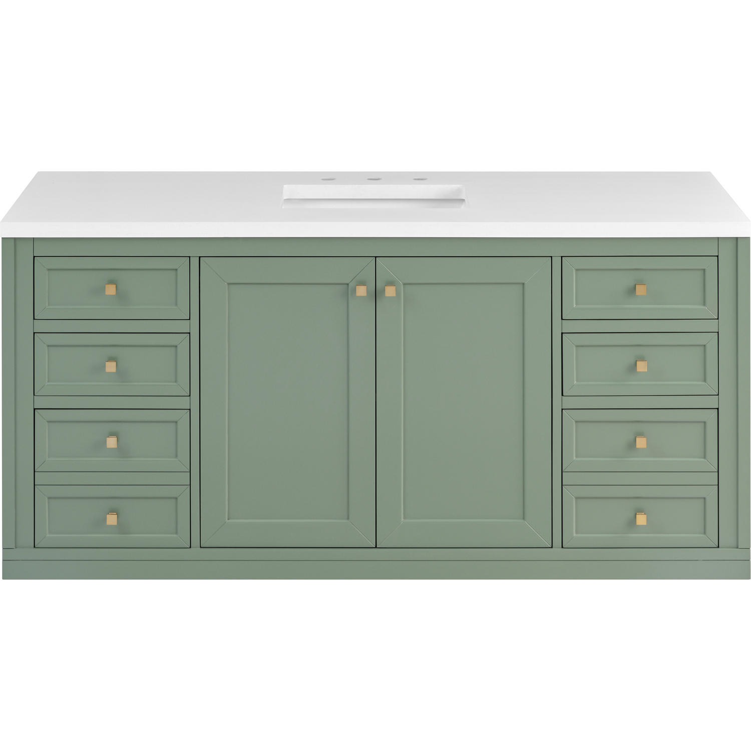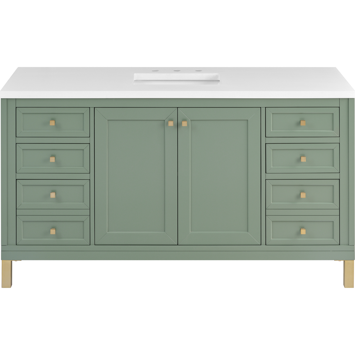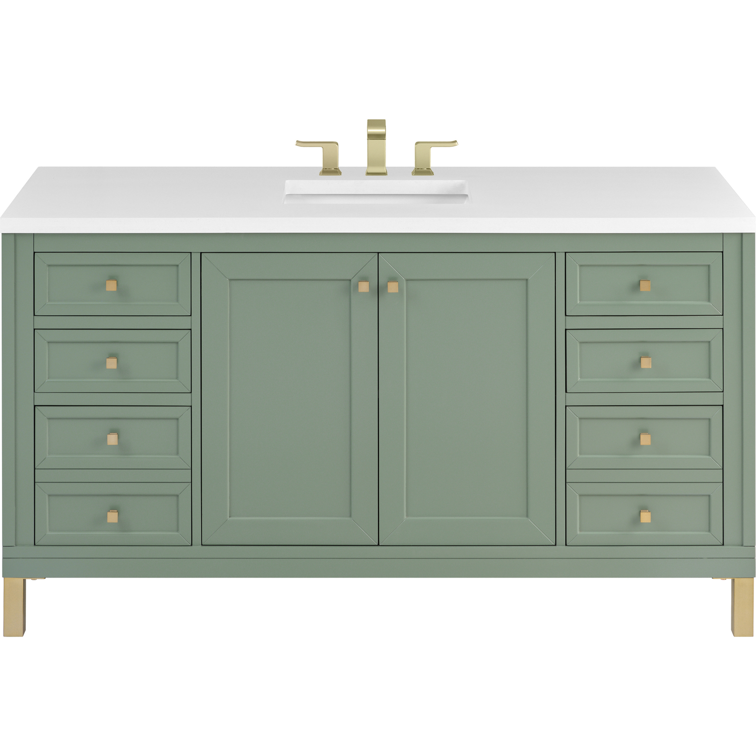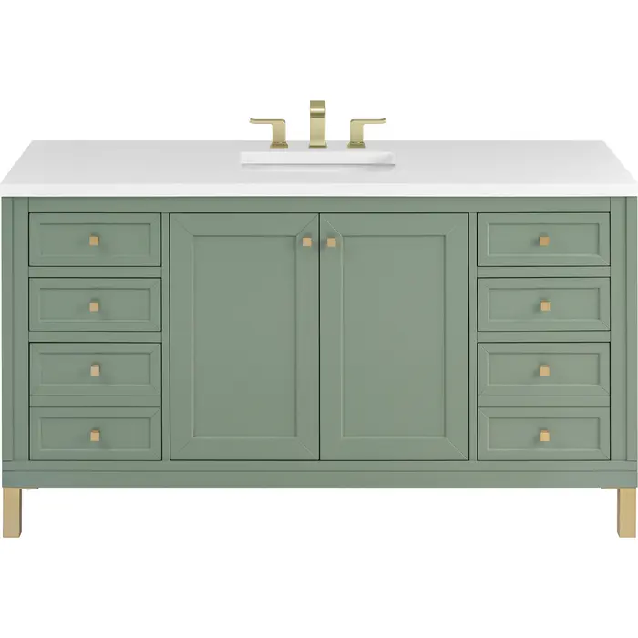 The sophisticated details and clean lines of the Chicago 60" Single Vanity by James Martin Vanities make it the perfect choice for any bathroom. Featuring a Smokey Celadon finish, this vanity offers ample storage with its double-door cabinet, adjustable interior shelves, and six drawers (four standard; two double-deep). Champagne Brass knobs and legs add a contemporary touch; or choose to forego the metal legs for a modern wall-mounted installation. The addition of a classic White Zeus Silestone® top with undermount sink completes the look.Double-door cabinet with adjustable interior shelf; six drawers (four standard drawers and two double-deep drawers on bottom row)Drawer boxes feature English Dovetail joinery with premium, soft-close undermount drawer slides; doors feature soft-close, adjustable door hingesCabinet features a multi-stage premium finish coat to offer UV and moisture resistanceSmokey Celadon finish with Champagne Brass hardwareCountertop is pre-drilled for an 8" widespread faucet; our 3cm eased edge countertops come with white porcelain rectangular sink(s) that ship separately and include mounting brackets for easy installationCrafted from solid kiln-dried PoplarDrawers lined with our signature brushed aluminum laminate for easy cleaningDual-mounted: can be installed freestanding or floatingFaucet sold separatelyJames Martin Vanities top-selling Chicago Collection is distinctly contemporary, bringing both form and function to your bathroom with clean lines and ample storage. With three available finishes and multiple hardware options, the Chicago collection can be customized to your preferences by choosing to install as a freestanding or floating vanity.1 year warranty against manufacturer's defects. We will repair or replace any defective product, if the product is defective in material or workmanship at our discretion. No warranty is expressed or implied regarding damages resulting from consumer misuse.