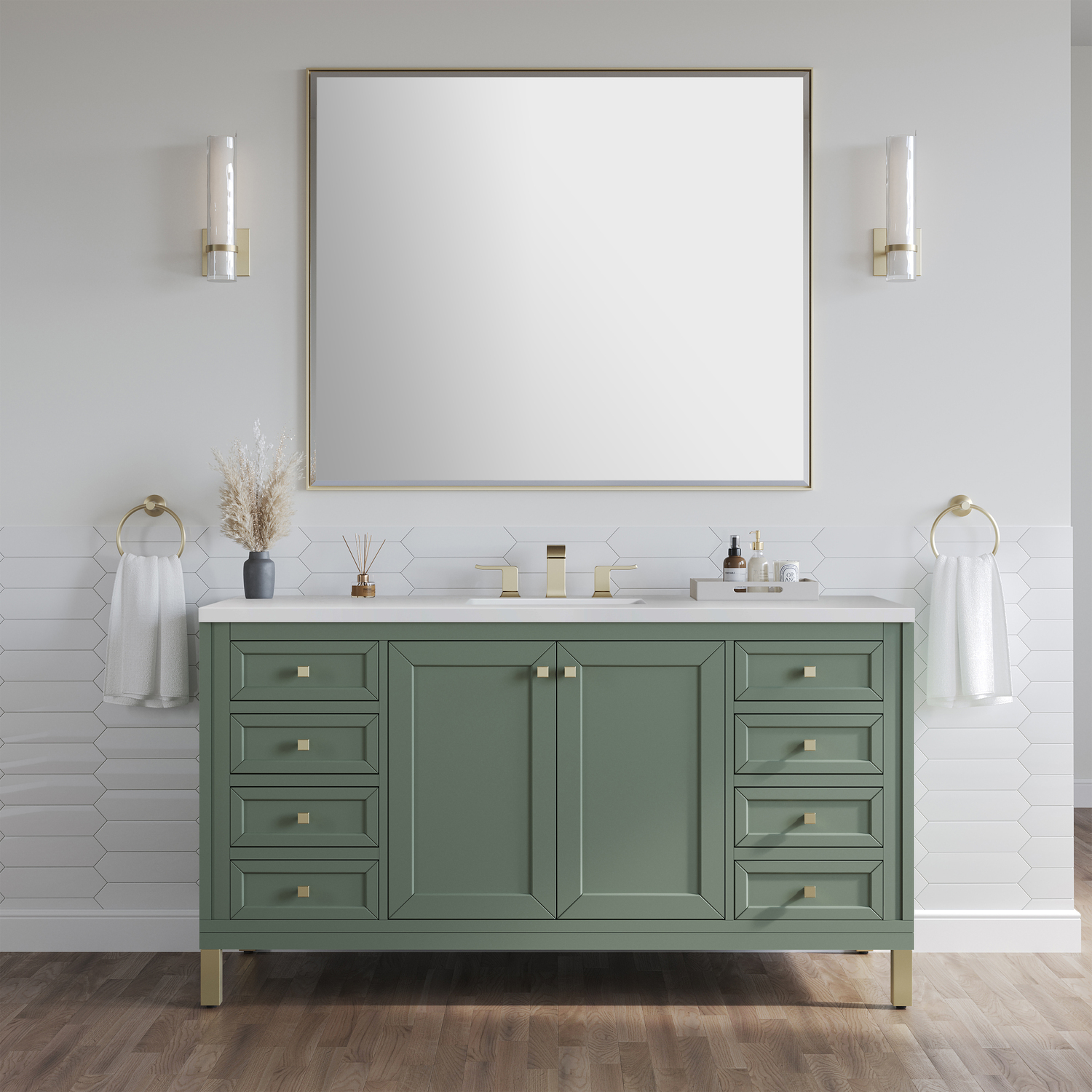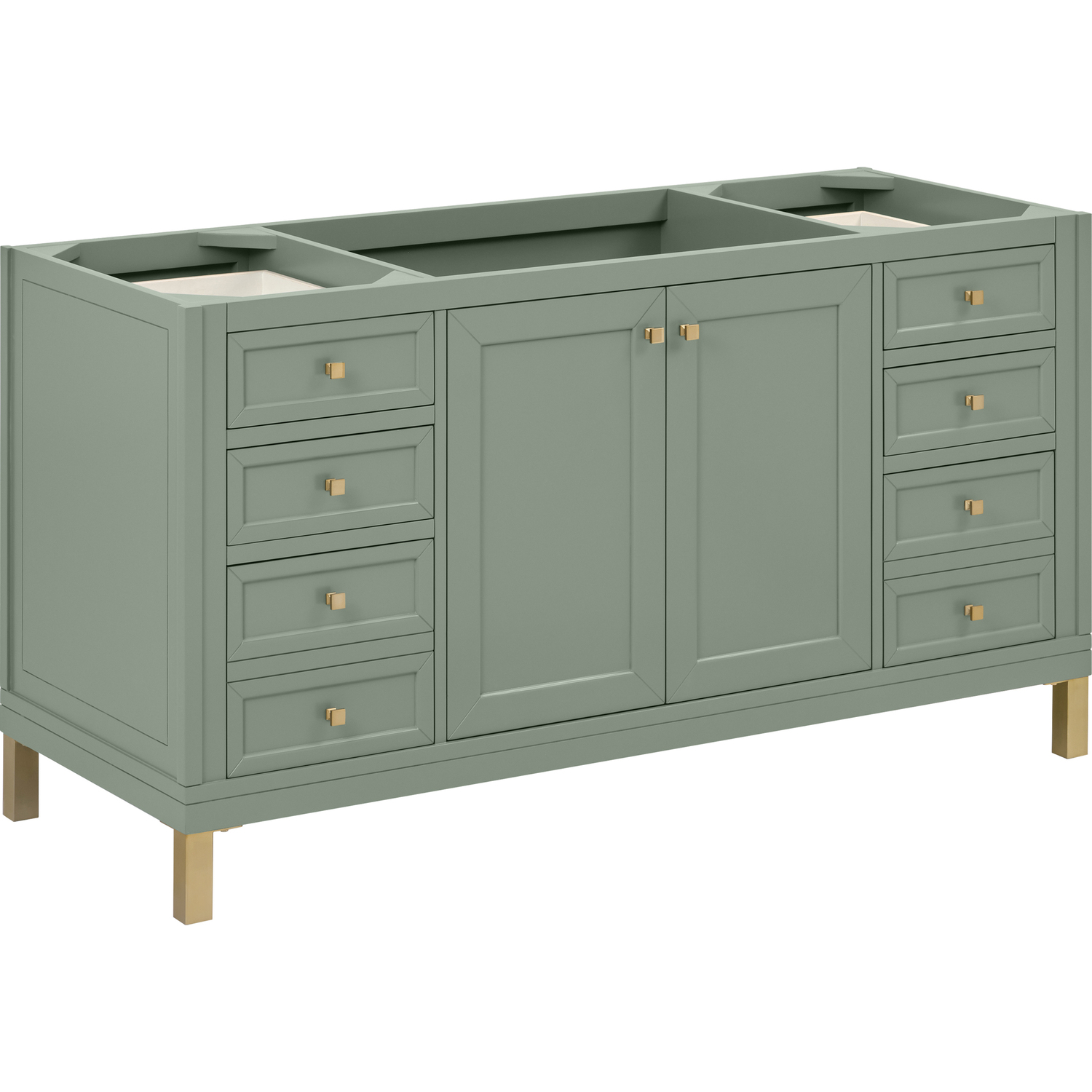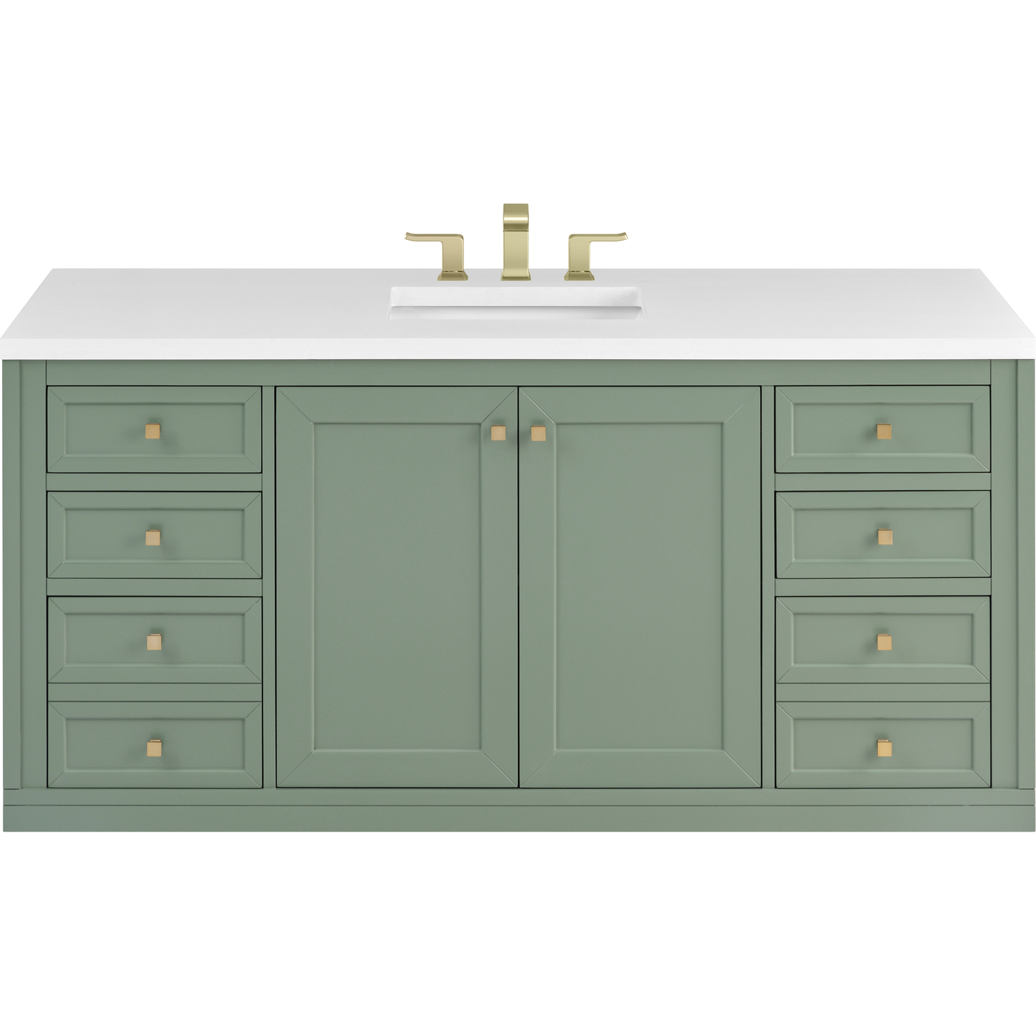 The sophisticated details and clean lines of the Chicago 60" Single Vanity by James Martin Vanities make it the perfect choice for any bathroom. Featuring a Smokey Celadon finish, this vanity offers ample storage with its double-door cabinet, adjustable interior shelves, and six drawers (four standard; two double-deep). Champagne Brass knobs and legs add a contemporary touch; or choose to forego the metal legs for a modern wall-mounted installation. The addition of a classic White Zeus Silestone® top with undermount sink completes the look.Double-door cabinet with adjustable interior shelf; six drawers (four standard drawers and two double-deep drawers on bottom row)Drawer boxes feature English Dovetail joinery with premium, soft-close undermount drawer slides; doors feature soft-close, adjustable door hingesCabinet features a multi-stage premium finish coat to offer UV and moisture resistanceSmokey Celadon finish with Champagne Brass hardwareCountertop is pre-drilled for an 8" widespread faucet; our 3cm eased edge countertops come with white porcelain rectangular sink(s) that ship separately and include mounting brackets for easy installationCrafted from solid kiln-dried PoplarDrawers lined with our signature brushed aluminum laminate for easy cleaningDual-mounted: can be installed freestanding or floatingFaucet sold separatelyJames Martin Vanities top-selling Chicago Collection is distinctly contemporary, bringing both form and function to your bathroom with clean lines and ample storage. With three available finishes and multiple hardware options, the Chicago collection can be customized to your preferences by choosing to install as a freestanding or floating vanity.1 year warranty against manufacturer's defects. We will repair or replace any defective product, if the product is defective in material or workmanship at our discretion. No warranty is expressed or implied regarding damages resulting from consumer misuse.