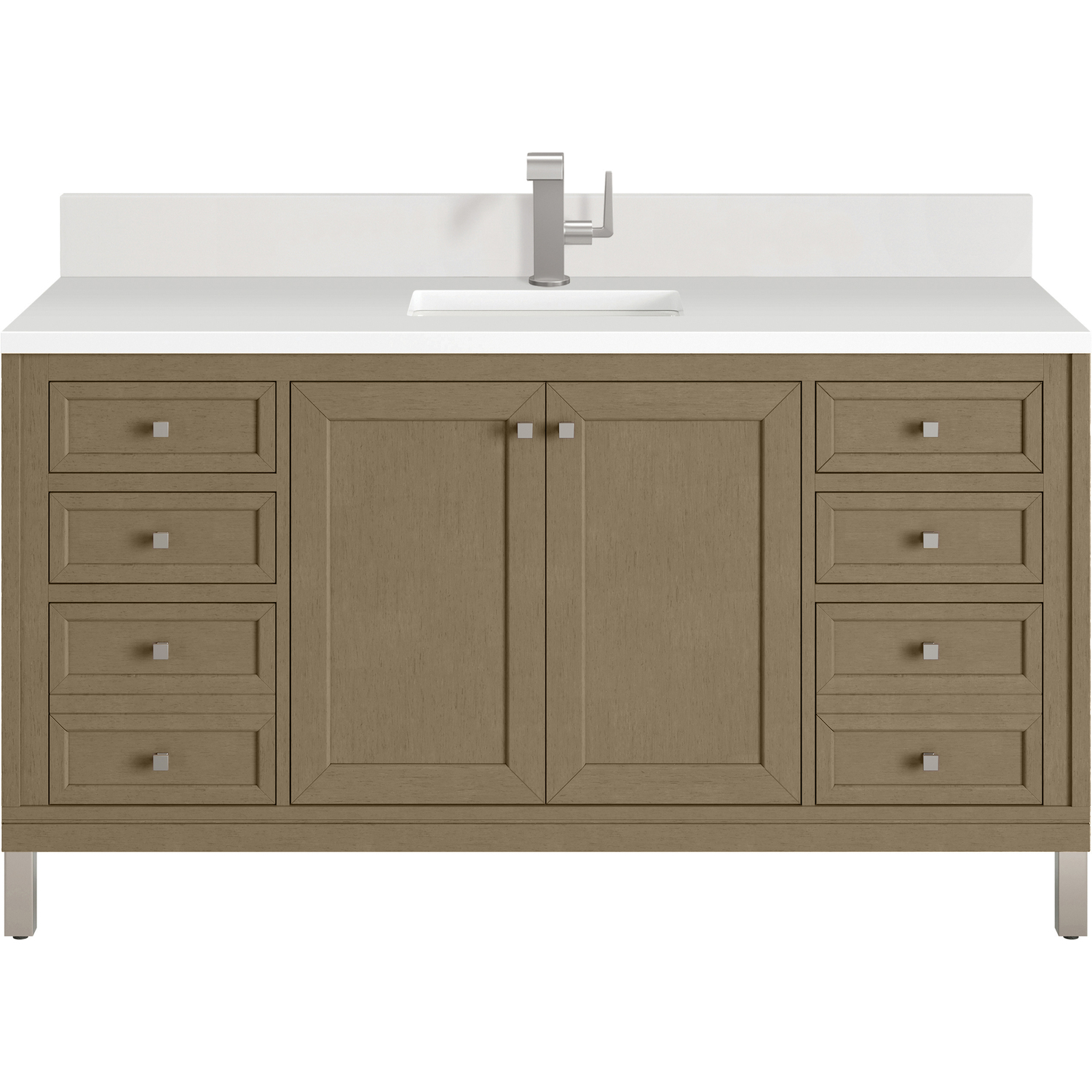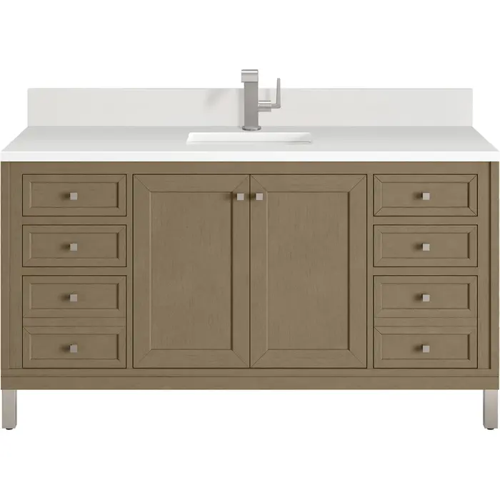 The sophisticated details and clean lines of the Chicago 60" Single Vanity by James Martin Vanities make it the perfect choice for any bathroom. Featuring a Walnut Whisper finish, this vanity offers ample storage with its double-door cabinet, adjustable interior shelves, and six drawers (four standard; two double-deep). Brushed Nickel knobs and legs add a contemporary touch; or choose to forego the metal legs for a modern wall-mounted installation. A classic White Zeus Silestone® top and backsplash with undermount sink completes the look with a contemporary touch.Double-door cabinet with adjustable interior shelf; six drawers (four standard drawers and two double-deep drawers on bottom row)Drawer boxes feature English Dovetail joinery with premium, soft-close undermount drawer slides; doors feature soft-close, adjustable door hingesCabinet features a multi-stage premium finish coat to offer UV and moisture resistanceWalnut Whisper finish with Brushed Nickel hardwareCountertop is pre-drilled for a single-hole faucet; our 3cm eased edge countertops come with white porcelain rectangular sink(s) that ship separately and include mounting brackets for easy installationCrafted from solid kiln-dried PoplarDrawers lined with our signature brushed aluminum laminate for easy cleaningDual-mounted: can be installed freestanding or floatingFaucet sold separatelyJames Martin Vanities top-selling Chicago Collection is distinctly contemporary, bringing both form and function to your bathroom with clean lines and ample storage. With three available finishes and multiple hardware options, the Chicago collection can be customized to your preferences by choosing to install as a freestanding or floating vanity.1 year warranty against manufacturer's defects. We will repair or replace any defective product, if the product is defective in material or workmanship at our discretion. No warranty is expressed or implied regarding damages resulting from consumer misuse.