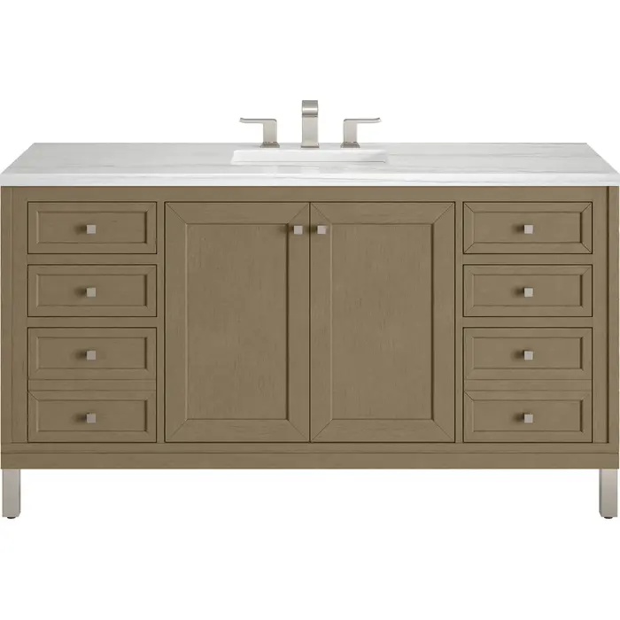 The sophisticated details and clean lines of the Chicago 60" Single Vanity by James Martin Vanities make it the perfect choice for any bathroom. Featuring a Walnut Whisper finish, this vanity offers ample storage with its double-door cabinet, adjustable interior shelves, and six drawers (four standard; two double-deep). Brushed Nickel knobs and legs add a contemporary touch; or choose to forego the metal legs for a modern wall-mounted installation. The addition of a modern Arctic Fall Solid Surface top with undermount sink completes the look.Double-door cabinet with adjustable interior shelf; six drawers (four standard drawers and two double-deep drawers on bottom row)Drawer boxes feature English Dovetail joinery with premium, soft-close undermount drawer slides; doors feature soft-close, adjustable door hingesCabinet features a multi-stage premium finish coat to offer UV and moisture resistanceWalnut Whisper finish with Brushed Nickel hardwareCountertop is pre-drilled for an 8" widespread faucet; our 3cm eased edge countertops come with white porcelain rectangular sink(s) that ship separately and include mounting brackets for easy installationCrafted from solid kiln-dried PoplarDrawers lined with our signature brushed aluminum laminate for easy cleaningDual-mounted: can be installed freestanding or floatingFaucet sold separatelyJames Martin Vanities top-selling Chicago Collection is distinctly contemporary, bringing both form and function to your bathroom with clean lines and ample storage. With three available finishes and multiple hardware options, the Chicago collection can be customized to your preferences by choosing to install as a freestanding or floating vanity.1 year warranty against manufacturer's defects. We will repair or replace any defective product, if the product is defective in material or workmanship at our discretion. No warranty is expressed or implied regarding damages resulting from consumer misuse.