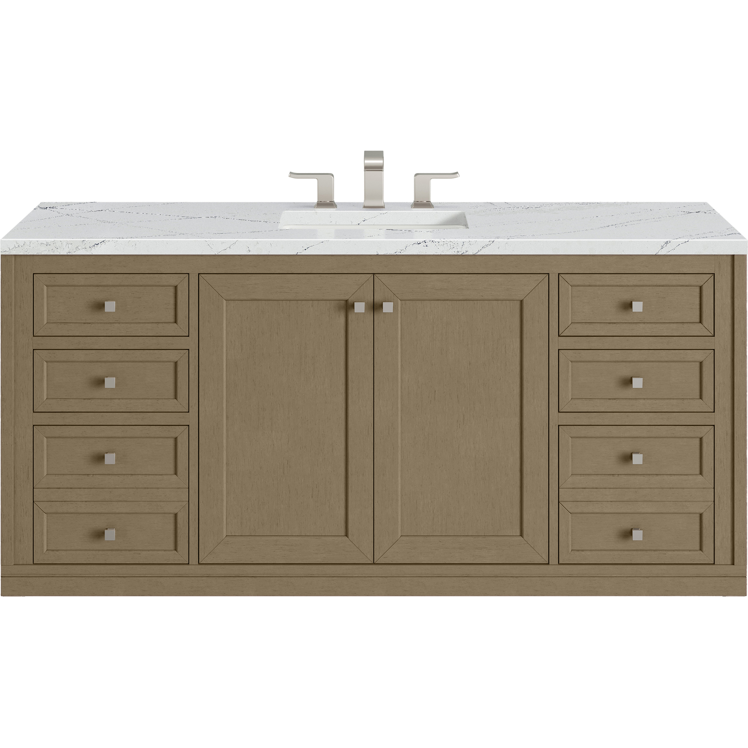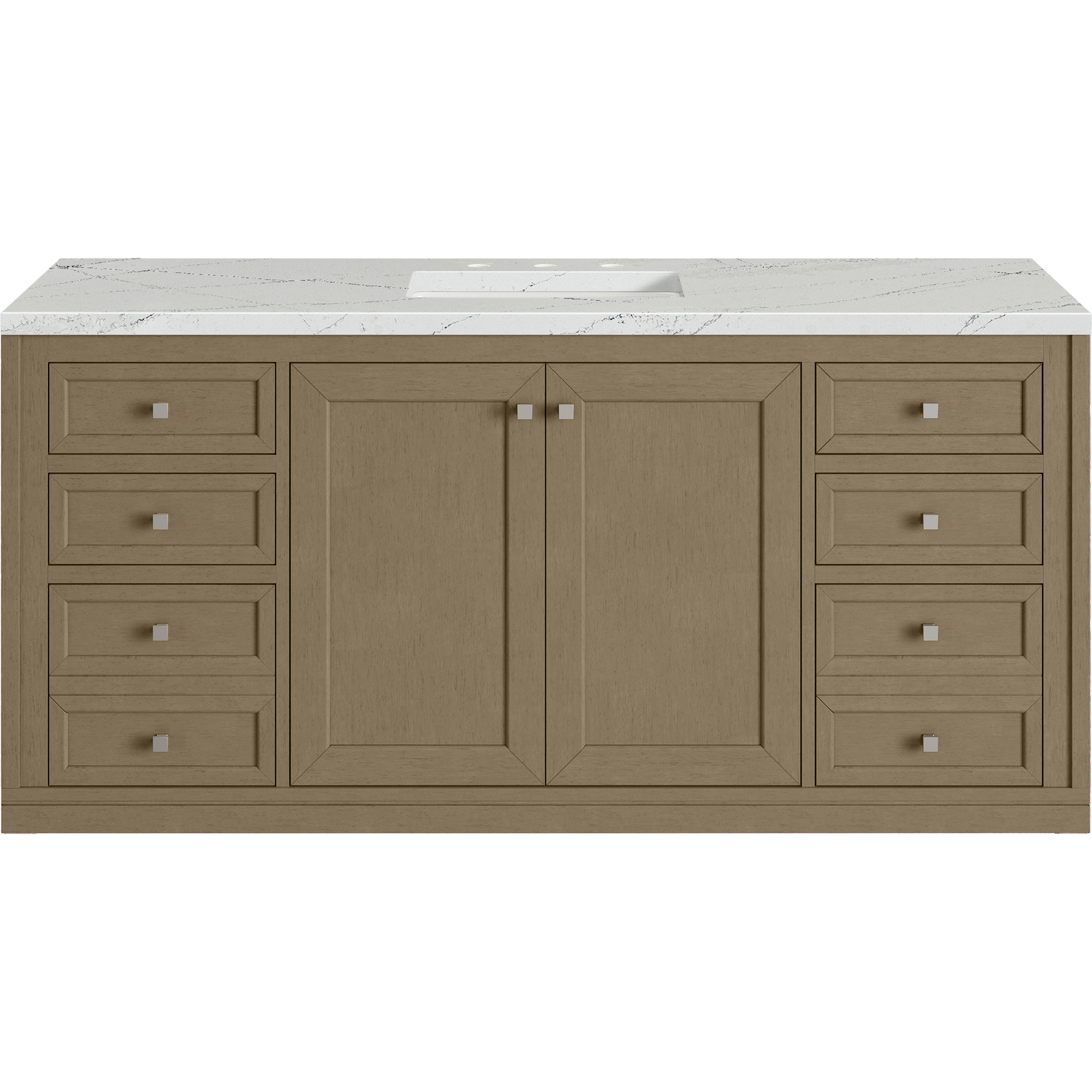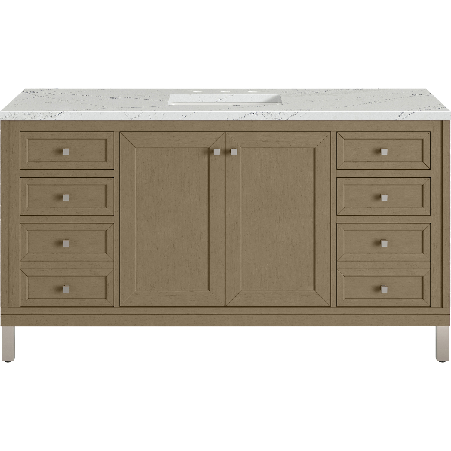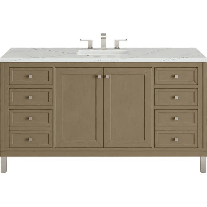 The sophisticated details and clean lines of the Chicago 60" Single Vanity by James Martin Vanities make it the perfect choice for any bathroom. Featuring a Walnut Whisper finish, this vanity offers ample storage with its double-door cabinet, adjustable interior shelves, and six drawers (four standard; two double-deep). Brushed Nickel knobs and legs add a contemporary touch; or choose to forego the metal legs for a modern wall-mounted installation. The addition of a stunning Ethereal Noctis Silestone® top with undermount sink completes the look.Double-door cabinet with adjustable interior shelf; six drawers (four standard drawers and two double-deep drawers on bottom row)Drawer boxes feature English Dovetail joinery with premium, soft-close undermount drawer slides; doors feature soft-close, adjustable door hingesCabinet features a multi-stage premium finish coat to offer UV and moisture resistanceWalnut Whisper finish with Brushed Nickel hardwareCountertop is pre-drilled for an 8" widespread faucet; our 3cm eased edge countertops come with white porcelain rectangular sink(s) that ship separately and include mounting brackets for easy installationCrafted from solid kiln-dried PoplarDrawers lined with our signature brushed aluminum laminate for easy cleaningDual-mounted: can be installed freestanding or floatingFaucet sold separatelyJames Martin Vanities top-selling Chicago Collection is distinctly contemporary, bringing both form and function to your bathroom with clean lines and ample storage. With three available finishes and multiple hardware options, the Chicago collection can be customized to your preferences by choosing to install as a freestanding or floating vanity.1 year warranty against manufacturer's defects. We will repair or replace any defective product, if the product is defective in material or workmanship at our discretion. No warranty is expressed or implied regarding damages resulting from consumer misuse.