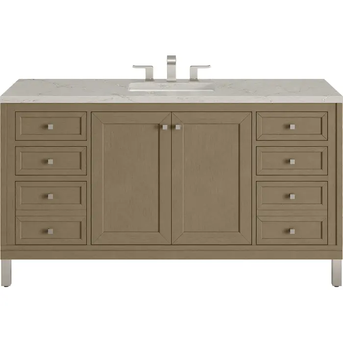 The sophisticated details and clean lines of the Chicago 60" Single Vanity by James Martin Vanities make it the perfect choice for any bathroom. Featuring a Walnut Whisper finish, this vanity offers ample storage with its double-door cabinet, adjustable interior shelves, and six drawers (four standard; two double-deep). Brushed Nickel knobs and legs add a contemporary touch; or choose to forego the metal legs for a modern wall-mounted installation. The addition of a beautiful Victorian Silver Silestone® top with undermount sink completes the look. This unit is enabled with FreePower wireless charging; featuring a single-device charger seamlessly embedded into the countertop, indicated by a light-up halo to the left of the sink. Designed for modern living, FreePower offers convenient, integrated, wireless charging when and where you need it.Double-door cabinet with adjustable interior shelf; six drawers (four standard drawers and two double-deep drawers on bottom row)Drawer boxes feature English Dovetail joinery with premium, soft-close undermount drawer slides; doors feature soft-close, adjustable door hingesCabinet features a multi-stage premium finish coat to offer UV and moisture resistanceWalnut Whisper finish with Brushed Nickel hardwareCountertop is pre-drilled for an 8" widespread faucet; our 3cm eased edge countertops come with white porcelain rectangular sink(s) that ship separately and include mounting brackets for easy installationCrafted from solid kiln-dried PoplarDrawers lined with our signature brushed aluminum laminate for easy cleaningDual-mounted: can be installed freestanding or floating with included French Cleat hardwareFaucet sold separatelyMatching stone backsplash available as add-on purchaseFreePower Wireless Charging; single-device unit left of sinkJames Martin Vanities top-selling Chicago Collection is distinctly contemporary, bringing both form and function to your bathroom with clean lines and ample storage. With three available finishes and multiple hardware options, the Chicago collection can be customized to your preferences by choosing to install as a freestanding or floating vanity.1 year warranty against manufacturer's defects. We will repair or replace any defective product, if the product is defective in material or workmanship at our discretion. No warranty is expressed or implied regarding damages resulting from consumer misuse.