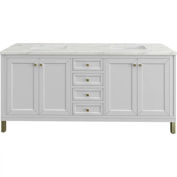 The sophisticated details and clean lines of the Chicago 72" Double Vanity by James Martin Vanities make it the perfect choice for any bathroom. Featuring a Glossy White finish, this vanity offers ample storage with its two double-door cabinets, adjustable interior shelves, and three drawers (two standard; one double-deep). Champagne Brass knobs and legs add a contemporary touch; or choose to forego the metal legs for a modern wall-mounted installation. The addition of a stunning Ethereal Noctis Silestone® top with undermount sinks completes the look. This unit is enabled with FreePower wireless charging; featuring a two-device charger seamlessly embedded into the countertop, indicated by a light-up halo in between the sinks. Designed for modern living, FreePower offers convenient, integrated, wireless charging when and where you need it.Two double-door cabinets with adjustable interior shelves and three drawers (two standard drawers and one double-deep drawer on bottom row)Drawer boxes feature English Dovetail joinery with premium, soft-close undermount drawer slides; doors feature soft-close, adjustable door hingesCabinet features a multi-stage premium finish coat to offer UV and moisture resistanceGlossy White finish with Champagne Brass hardwareCountertop is pre-drilled for 8" widespread faucets; our 3cm eased edge countertops come with white porcelain rectangular sink(s) that ship separately and include mounting brackets for easy installationCrafted from solid kiln-dried PoplarDrawers lined with our signature brushed aluminum laminate for easy cleaningDual-mounted: can be installed freestanding or floating with included French Cleat hardwareFaucet sold separatelyMatching stone backsplash available as add-on purchaseFreePower Wireless Charging; two-device unit in between sinksJames Martin Vanities top-selling Chicago Collection is distinctly contemporary, bringing both form and function to your bathroom with clean lines and ample storage. With three available finishes and multiple hardware options, the Chicago collection can be customized to your preferences by choosing to install as a freestanding or floating vanity.1 year warranty against manufacturer's defects. We will repair or replace any defective product, if the product is defective in material or workmanship at our discretion. No warranty is expressed or implied regarding damages resulting from consumer misuse.