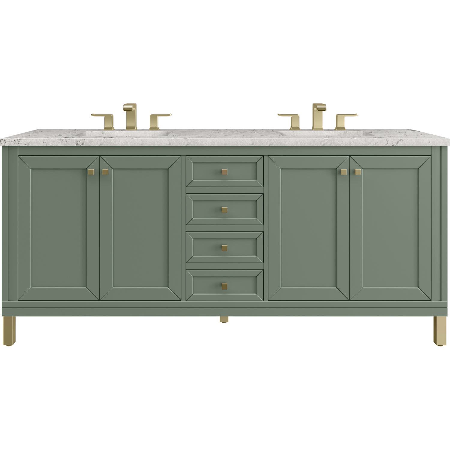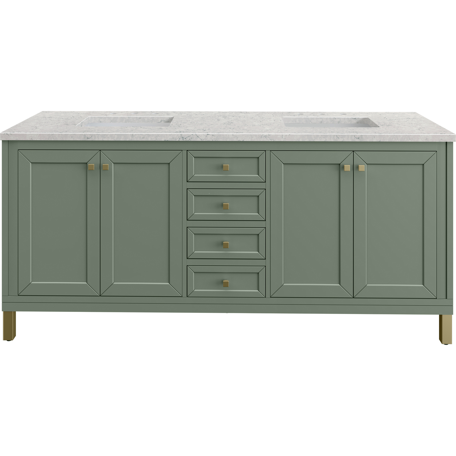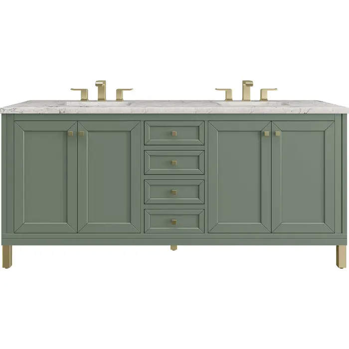 The sophisticated details and clean lines of the Chicago 72" Double Vanity by James Martin Vanities make it the perfect choice for any bathroom. Featuring a Smokey Celadon finish, this vanity offers ample storage with its two double-door cabinets, adjustable interior shelves, and three drawers (two standard; one double-deep). Champagne Brass knobs and legs add a contemporary touch; or choose to forego the metal legs for a modern wall-mounted installation. The addition of a beautiful Eternal Jasmine Pearl Silestone® top with undermount sinks completes the look.Two double-door cabinets with adjustable interior shelves and three drawers (two standard drawers and one double-deep drawer on bottom row)Drawer boxes feature English Dovetail joinery with premium, soft-close undermount drawer slides; doors feature soft-close, adjustable door hingesCabinet features a multi-stage premium finish coat to offer UV and moisture resistanceSmokey Celadon finish with Champagne Brass hardwareCountertop is pre-drilled for 8" widespread faucets; our 3cm eased edge countertops come with white porcelain rectangular sink(s) that ship separately and include mounting brackets for easy installationCrafted from solid kiln-dried PoplarDrawers lined with our signature brushed aluminum laminate for easy cleaningDual-mounted: can be installed freestanding or floatingFaucet sold separatelyJames Martin Vanities top-selling Chicago Collection is distinctly contemporary, bringing both form and function to your bathroom with clean lines and ample storage. With three available finishes and multiple hardware options, the Chicago collection can be customized to your preferences by choosing to install as a freestanding or floating vanity.1 year warranty against manufacturer's defects. We will repair or replace any defective product, if the product is defective in material or workmanship at our discretion. No warranty is expressed or implied regarding damages resulting from consumer misuse.