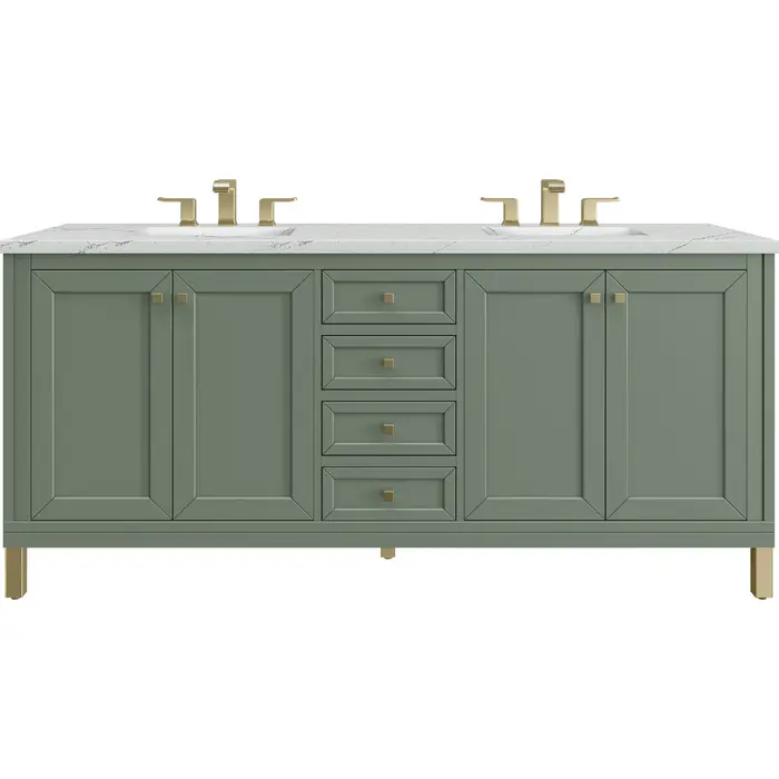 The sophisticated details and clean lines of the Chicago 72" Double Vanity by James Martin Vanities make it the perfect choice for any bathroom. Featuring a Smokey Celadon finish, this vanity offers ample storage with its two double-door cabinets, adjustable interior shelves, and three drawers (two standard; one double-deep). Champagne Brass knobs and legs add a contemporary touch; or choose to forego the metal legs for a modern wall-mounted installation. The addition of a stunning Ethereal Noctis Silestone® top with undermount sinks completes the look. This unit is enabled with FreePower wireless charging; featuring a two-device charger seamlessly embedded into the countertop, indicated by a light-up halo in between the sinks. Designed for modern living, FreePower offers convenient, integrated, wireless charging when and where you need it.Two double-door cabinets with adjustable interior shelves and three drawers (two standard drawers and one double-deep drawer on bottom row)Drawer boxes feature English Dovetail joinery with premium, soft-close undermount drawer slides; doors feature soft-close, adjustable door hingesCabinet features a multi-stage premium finish coat to offer UV and moisture resistanceSmokey Celadon finish with Champagne Brass hardwareCountertop is pre-drilled for 8" widespread faucets; our 3cm eased edge countertops come with white porcelain rectangular sink(s) that ship separately and include mounting brackets for easy installationCrafted from solid kiln-dried PoplarDrawers lined with our signature brushed aluminum laminate for easy cleaningDual-mounted: can be installed freestanding or floating with included French Cleat hardwareFaucet sold separatelyMatching stone backsplash available as add-on purchaseFreePower Wireless Charging; two-device unit in between sinksJames Martin Vanities top-selling Chicago Collection is distinctly contemporary, bringing both form and function to your bathroom with clean lines and ample storage. With three available finishes and multiple hardware options, the Chicago collection can be customized to your preferences by choosing to install as a freestanding or floating vanity.1 year warranty against manufacturer's defects. We will repair or replace any defective product, if the product is defective in material or workmanship at our discretion. No warranty is expressed or implied regarding damages resulting from consumer misuse.