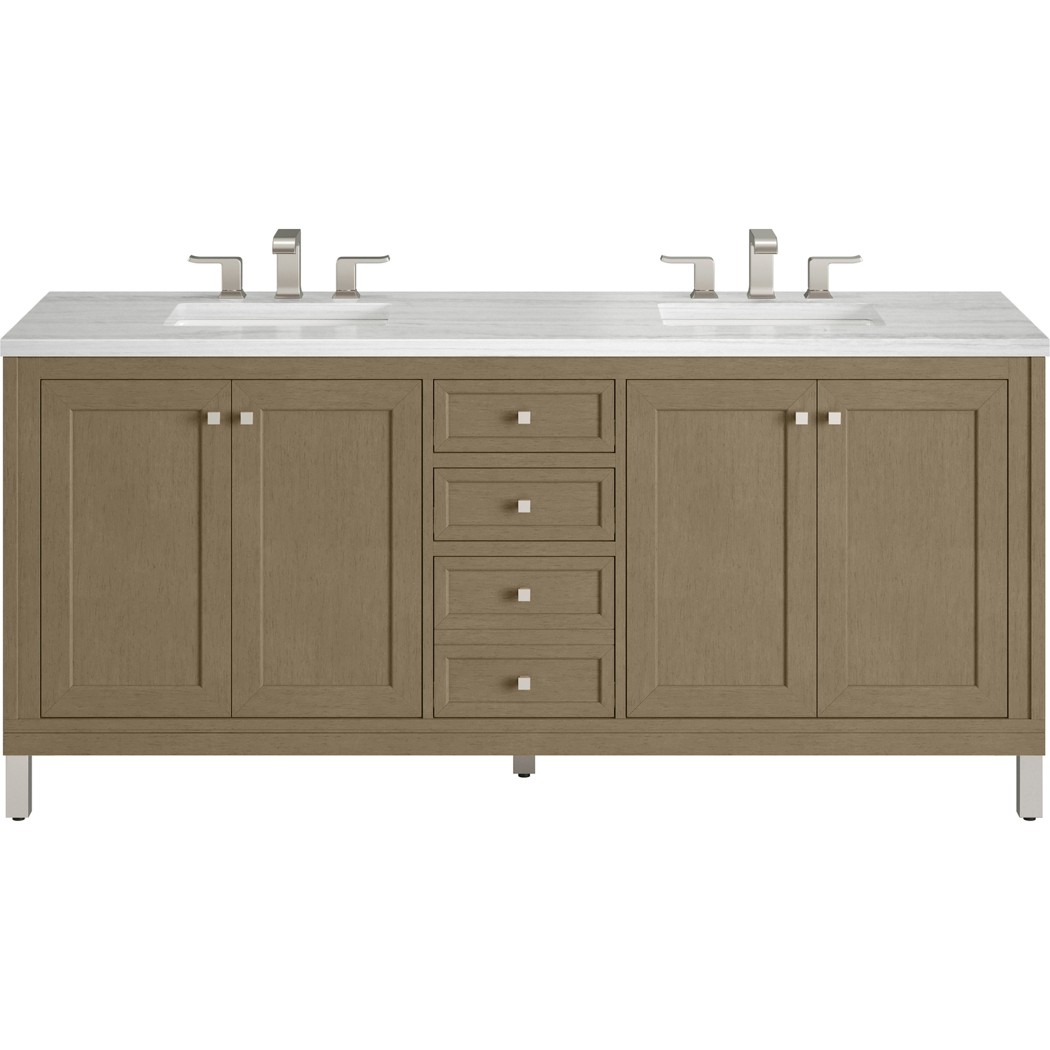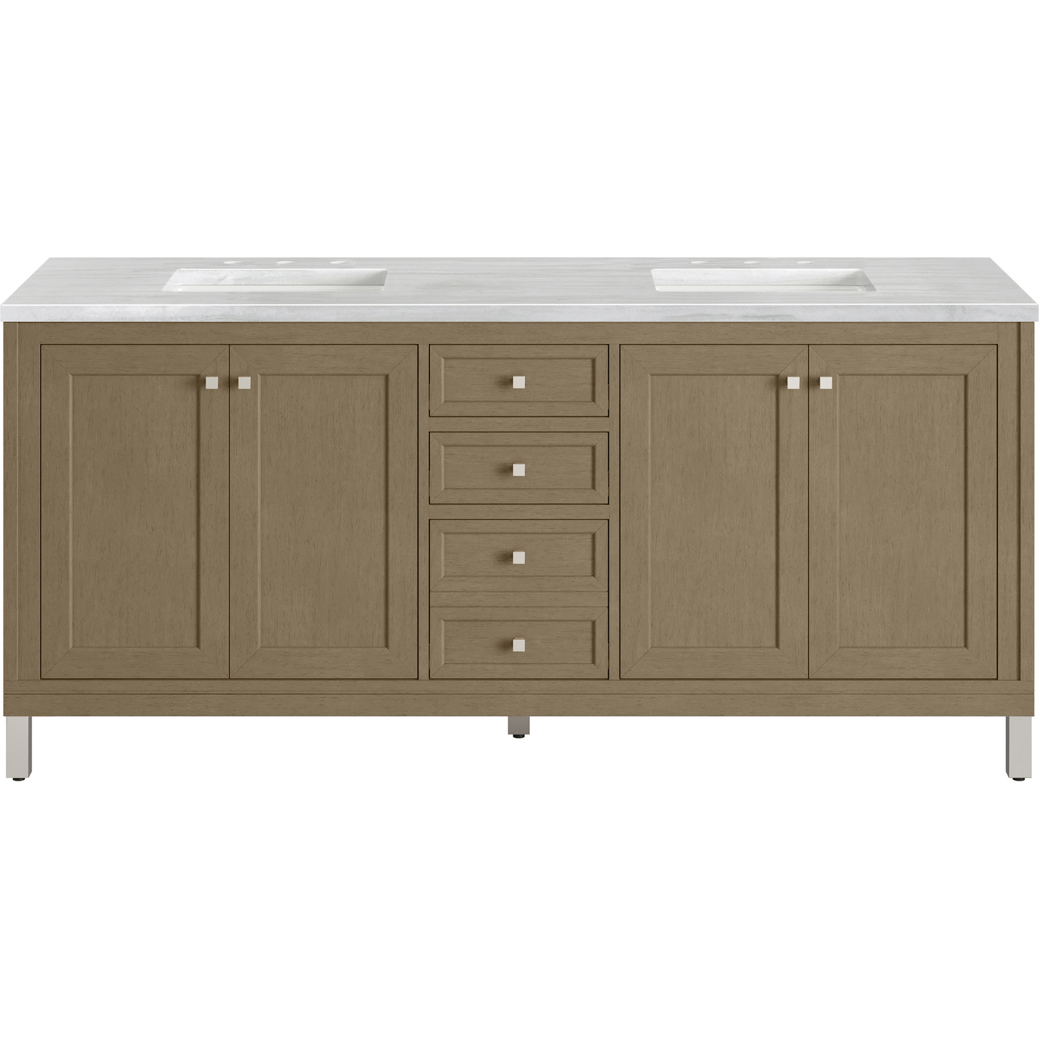 The sophisticated details and clean lines of the Chicago 72" Double Vanity by James Martin Vanities make it the perfect choice for any bathroom. Featuring a Walnut Whisper finish, this vanity offers ample storage with its two double-door cabinets, adjustable interior shelves, and three drawers (two standard; one double-deep). Brushed Nickel knobs and legs add a contemporary touch; or choose to forego the metal legs for a modern wall-mounted installation. The addition of a modern Arctic Fall Solid Surface top with undermount sinks completes the look.Two double-door cabinets with adjustable interior shelves and three drawers (two standard drawers and one double-deep drawer on bottom row)Drawer boxes feature English Dovetail joinery with premium, soft-close undermount drawer slides; doors feature soft-close, adjustable door hingesCabinet features a multi-stage premium finish coat to offer UV and moisture resistanceWalnut Whisper finish with Satin Nickel hardwareCountertop is pre-drilled for an 8" widespread faucet; our 3cm eased edge countertops come with white porcelain rectangular sink(s) that ship separately and include mounting brackets for easy installationCrafted from solid kiln-dried PoplarDrawers lined with our signature brushed aluminum laminate for easy cleaningDual-mounted: can be installed freestanding or floatingFaucet sold separatelyJames Martin Vanities top-selling Chicago Collection is distinctly contemporary, bringing both form and function to your bathroom with clean lines and ample storage. With three available finishes and multiple hardware options, the Chicago collection can be customized to your preferences by choosing to install as a freestanding or floating vanity.1 year warranty against manufacturer's defects. We will repair or replace any defective product, if the product is defective in material or workmanship at our discretion. No warranty is expressed or implied regarding damages resulting from consumer misuse.