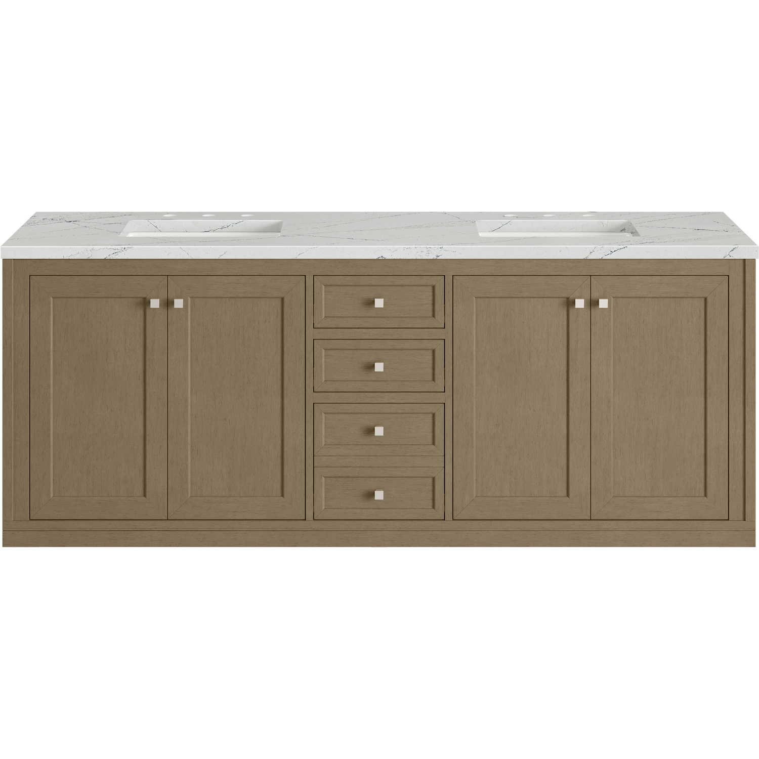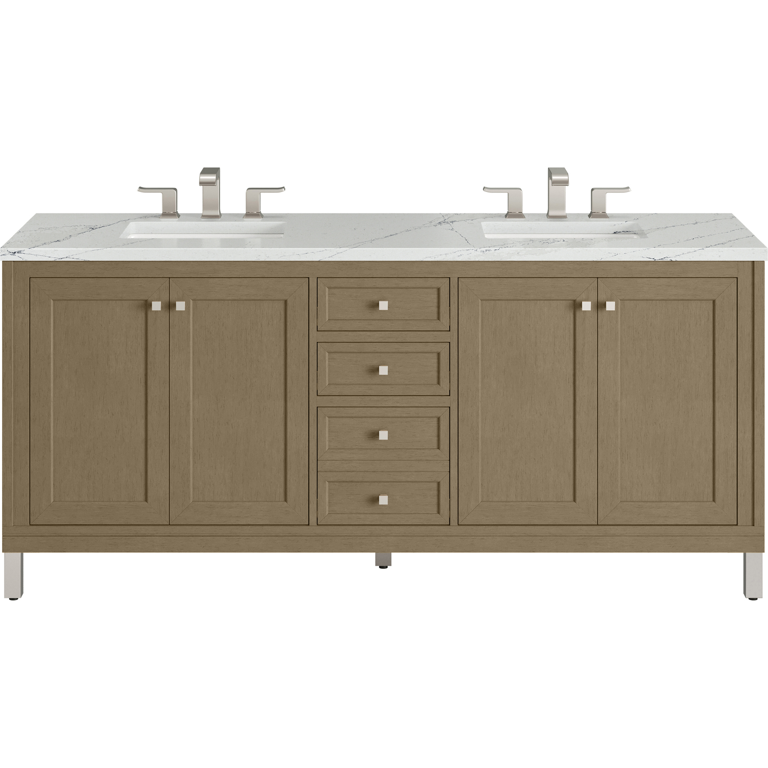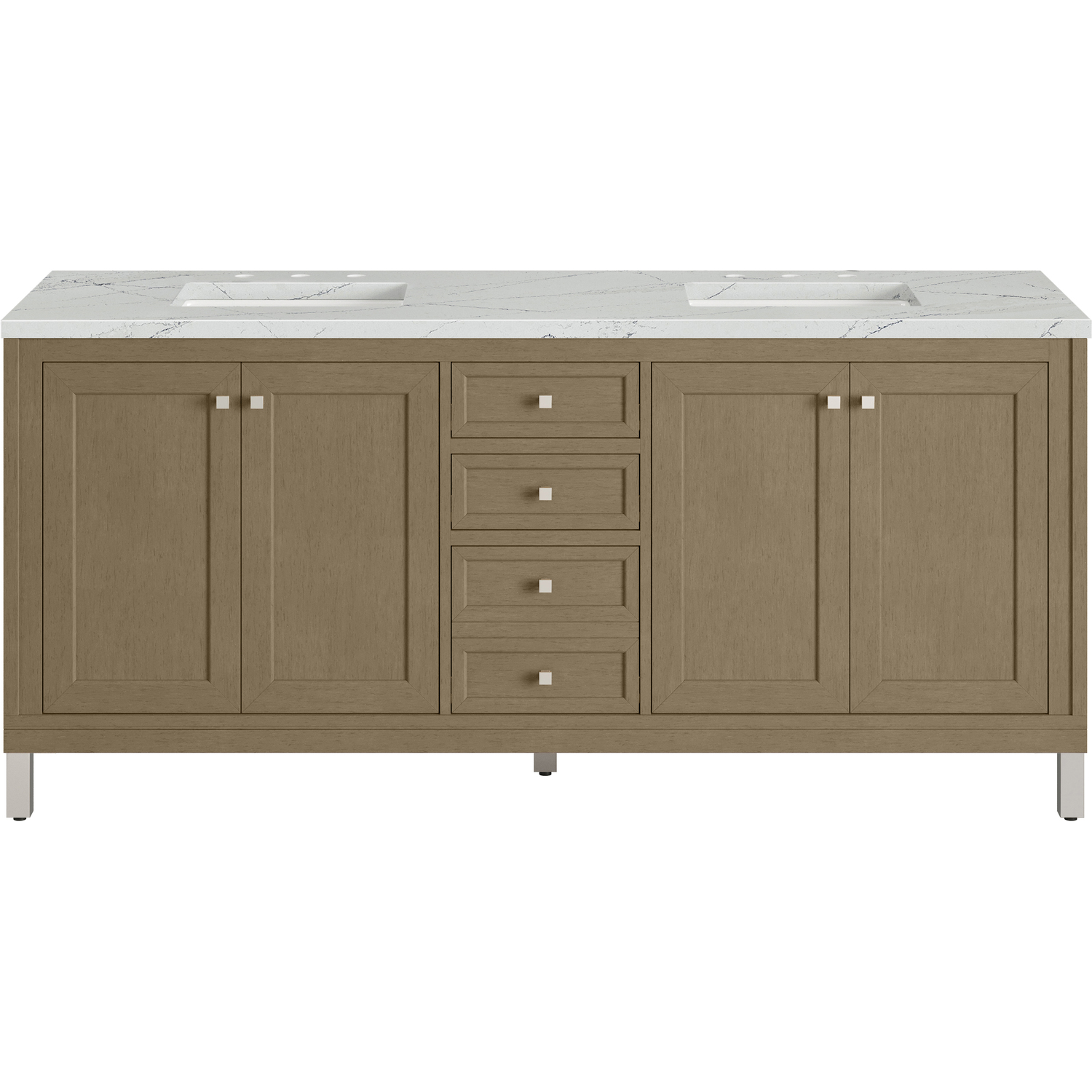 The sophisticated details and clean lines of the Chicago 72" Double Vanity by James Martin Vanities make it the perfect choice for any bathroom. Featuring a Walnut Whisper finish, this vanity offers ample storage with its two double-door cabinets, adjustable interior shelves, and three drawers (two standard; one double-deep). Brushed Nickel knobs and legs add a contemporary touch; or choose to forego the metal legs for a modern wall-mounted installation. The addition of a stunning Ethereal Noctis Silestone® top with undermount sinks completes the look.Two double-door cabinets with adjustable interior shelves and three drawers (two standard drawers and one double-deep drawer on bottom row)Drawer boxes feature English Dovetail joinery with premium, soft-close undermount drawer slides; doors feature soft-close, adjustable door hingesCabinet features a multi-stage premium finish coat to offer UV and moisture resistanceWalnut Whisper finish with Satin Nickel hardwareCountertop is pre-drilled for 8" widespread faucets; our 3cm eased edge countertops come with white porcelain rectangular sink(s) that ship separately and include mounting brackets for easy installationCrafted from solid kiln-dried PoplarDrawers lined with our signature brushed aluminum laminate for easy cleaningDual-mounted: can be installed freestanding or floatingFaucet sold separatelyJames Martin Vanities top-selling Chicago Collection is distinctly contemporary, bringing both form and function to your bathroom with clean lines and ample storage. With three available finishes and multiple hardware options, the Chicago collection can be customized to your preferences by choosing to install as a freestanding or floating vanity.1 year warranty against manufacturer's defects. We will repair or replace any defective product, if the product is defective in material or workmanship at our discretion. No warranty is expressed or implied regarding damages resulting from consumer misuse.