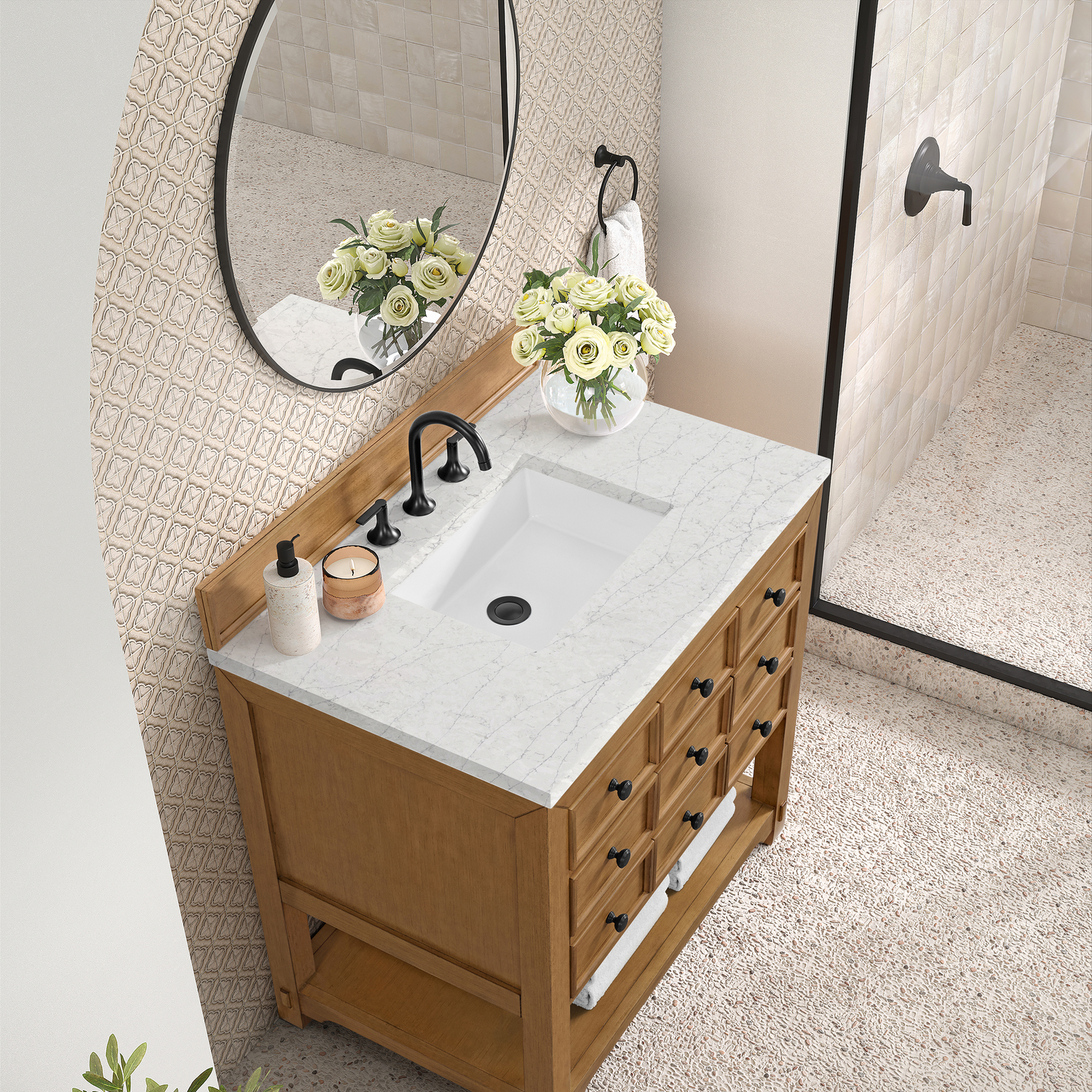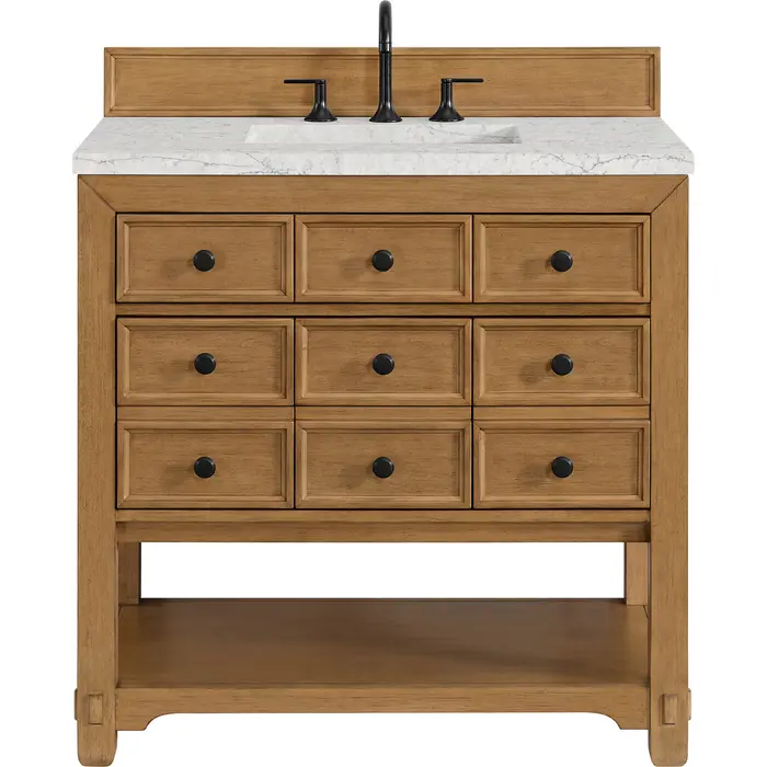The Malibu 36" Single Vanity by James Martin Vanities features a warm Amber Birch finish and contemporary Matte Black hardware. Made from solid poplar with birch veneers, this vanity features three double-height drawers, one top-row tip-out drawer, and a bottom shelf for additional storage. A matching decorative wooden backsplash is included. The look is completed with a 3cm eased-edge Eternal Jasmine Pearl Silestone top with 8" widespread faucet holes.Single vanity with three double-height drawers and one tip-out drawer; open bottom shelf for extra storageDrawer boxes feature English Dovetail joinery with premium, soft-close undermount drawer slidesCabinet is finished inside and out with a premium undercoat finish for superior moisture and UV resistanceAmber Birch finish with Matte Black hardwareCountertop is pre-drilled for an 8" widespread faucetOur 3cm eased edge countertops come with white porcelain rectangular sink(s) that ship separately and include mounting brackets for easy installationDrawers lined with our signature brushed aluminum laminate for easy cleaningFreestanding console-style vanityMatching decorative wood backsplash is includedFaucet sold separatelyThe Malibu Collection effortlessly fuses classic charm with ample storage in the California Mission style. The warm wood tones of the Amber Birch finish create a timeless aesthetic, while the Modern Matte Black hardware complements the design and accentuates the practicality within its thoughtfully crafted drawers and an open shelf.1 year warranty against manufacturer's defects. We will repair or replace any defective product, if the product is defective in material or workmanship at our discretion. No warranty is expressed or implied regarding damages resulting from consumer misuse.