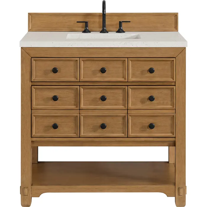 The Malibu 36" Single Vanity by James Martin Vanities features a warm Amber Birch finish and contemporary Matte Black hardware. Made from solid poplar with birch veneers, this vanity features three double-height drawers, one top-row tip-out drawer, and a bottom shelf for additional storage. A matching decorative wooden backsplash is included. The look is completed with a 3cm eased-edge Lime Delight Silestone top with 8" widespread faucet holes.Single vanity with three double-height drawers and one tip-out drawer; open bottom shelf for extra storageDrawer boxes feature English Dovetail joinery with premium, soft-close undermount drawer slidesCabinet is finished inside and out with a premium undercoat finish for superior moisture and UV resistanceAmber Birch finish with Matte Black hardwareCountertop is pre-drilled for an 8" widespread faucetOur 3cm eased edge countertops come with white porcelain rectangular sink(s) that ship separately and include mounting brackets for easy installationDrawers lined with our signature brushed aluminum laminate for easy cleaningFreestanding console-style vanityMatching decorative wood backsplash is includedFaucet sold separatelyThe Malibu Collection effortlessly fuses classic charm with ample storage in the California Mission style. The warm wood tones of the Amber Birch finish create a timeless aesthetic, while the Modern Matte Black hardware complements the design and accentuates the practicality within its thoughtfully crafted drawers and an open shelf.1 year warranty against manufacturer's defects. We will repair or replace any defective product, if the product is defective in material or workmanship at our discretion. No warranty is expressed or implied regarding damages resulting from consumer misuse.