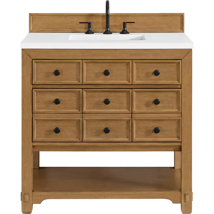 The Malibu 36" Single Vanity by James Martin Vanities features a warm Amber Birch finish and contemporary Matte Black hardware. Made from solid poplar with birch veneers, this vanity features three double-height drawers, one top-row tip-out drawer, and a bottom shelf for additional storage. A matching decorative wooden backsplash is included. The look is completed with a 3cm eased-edge White Zeus Silestone top with 8" widespread faucet holes.Single vanity with three double-height drawers and one tip-out drawer; open bottom shelf for extra storageDrawer boxes feature English Dovetail joinery with premium, soft-close undermount drawer slidesCabinet is finished inside and out with a premium undercoat finish for superior moisture and UV resistanceAmber Birch finish with Matte Black hardwareCountertop is pre-drilled for an 8" widespread faucetOur 3cm eased edge countertops come with white porcelain rectangular sink(s) that ship separately and include mounting brackets for easy installationDrawers lined with our signature brushed aluminum laminate for easy cleaningFreestanding console-style vanityMatching decorative wood backsplash is includedFaucet sold separatelyThe Malibu Collection effortlessly fuses classic charm with ample storage in the California Mission style. The warm wood tones of the Amber Birch finish create a timeless aesthetic, while the Modern Matte Black hardware complements the design and accentuates the practicality within its thoughtfully crafted drawers and an open shelf.1 year warranty against manufacturer's defects. We will repair or replace any defective product, if the product is defective in material or workmanship at our discretion. No warranty is expressed or implied regarding damages resulting from consumer misuse.