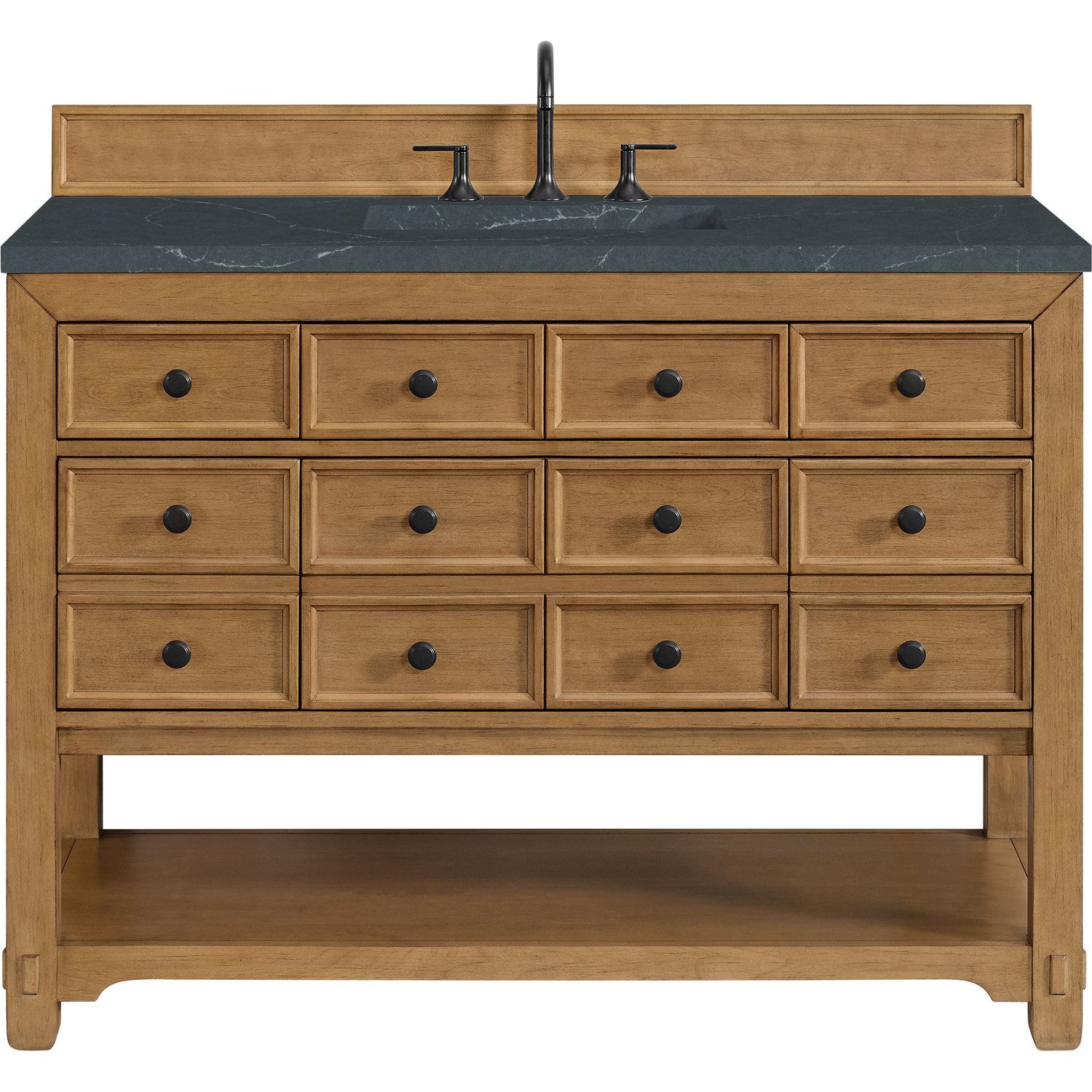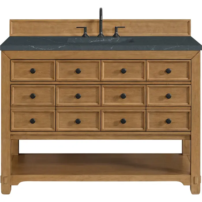 The Malibu 48" Single Vanity by James Martin Vanities features a warm Amber Birch finish and contemporary Matte Black hardware. Made from solid poplar with birch veneers, this vanity features five drawers (three are double-height), one top-row tip-out drawer, and a bottom shelf for additional storage. A matching decorative wooden backsplash is included. The look is completed with a 3cm eased-edge Charcoal Soapstone Silestone top with 8" widespread faucet holes.Single vanity with five drawers (three are double height) and one tip-out drawer; open bottom shelf for extra storageDrawer boxes feature English Dovetail joinery with premium, soft-close undermount drawer slidesCabinet is finished inside and out with a premium undercoat finish for superior moisture and UV resistanceAmber Birch finish with Matte Black hardwareCountertop is pre-drilled for an 8" widespread faucetOur 3cm eased edge countertops come with white porcelain rectangular sink(s) that ship separately and include mounting brackets for easy installationDrawers lined with our signature brushed aluminum laminate for easy cleaningFreestanding console-style vanityMatching decorative wood backsplash is includedFaucet sold separatelyRemovable Bamboo drawer organizer includedThe Malibu Collection effortlessly fuses classic charm with ample storage in the California Mission style. The warm wood tones of the Amber Birch finish create a timeless aesthetic, while the Modern Matte Black hardware complements the design and accentuates the practicality within its thoughtfully crafted drawers and an open shelf.1 year warranty against manufacturer's defects. We will repair or replace any defective product, if the product is defective in material or workmanship at our discretion. No warranty is expressed or implied regarding damages resulting from consumer misuse.