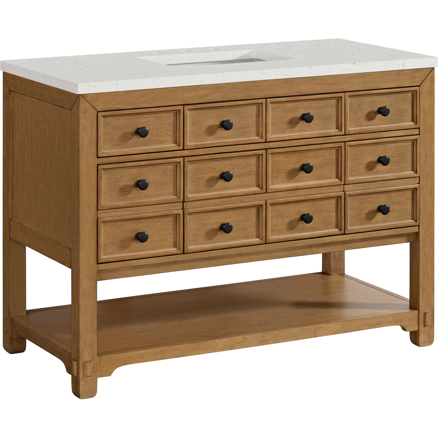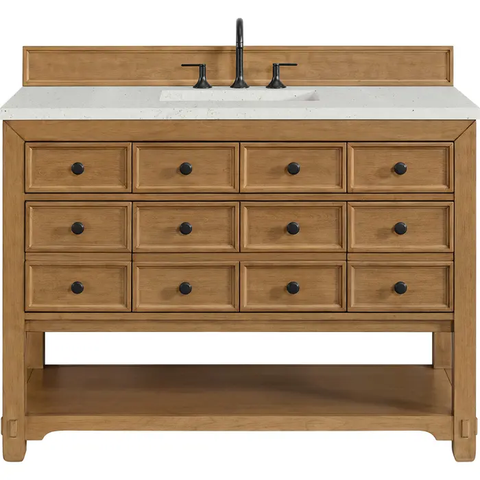 The Malibu 48" Single Vanity by James Martin Vanities features a warm Amber Birch finish and contemporary Matte Black hardware. Made from solid poplar with birch veneers, this vanity features five drawers (three are double-height), one top-row tip-out drawer, and a bottom shelf for additional storage. A matching decorative wooden backsplash is included. The look is completed with a 3cm eased-edge Lime Delight Silestone top with 8" widespread faucet holes.Single vanity with five drawers (three are double height) and one tip-out drawer; open bottom shelf for extra storageDrawer boxes feature English Dovetail joinery with premium, soft-close undermount drawer slidesCabinet is finished inside and out with a premium undercoat finish for superior moisture and UV resistanceAmber Birch finish with Matte Black hardwareCountertop is pre-drilled for an 8" widespread faucetOur 3cm eased edge countertops come with white porcelain rectangular sink(s) that ship separately and include mounting brackets for easy installationDrawers lined with our signature brushed aluminum laminate for easy cleaningFreestanding console-style vanityMatching decorative wood backsplash is includedFaucet sold separatelyRemovable Bamboo drawer organizer includedThe Malibu Collection effortlessly fuses classic charm with ample storage in the California Mission style. The warm wood tones of the Amber Birch finish create a timeless aesthetic, while the Modern Matte Black hardware complements the design and accentuates the practicality within its thoughtfully crafted drawers and an open shelf.1 year warranty against manufacturer's defects. We will repair or replace any defective product, if the product is defective in material or workmanship at our discretion. No warranty is expressed or implied regarding damages resulting from consumer misuse.