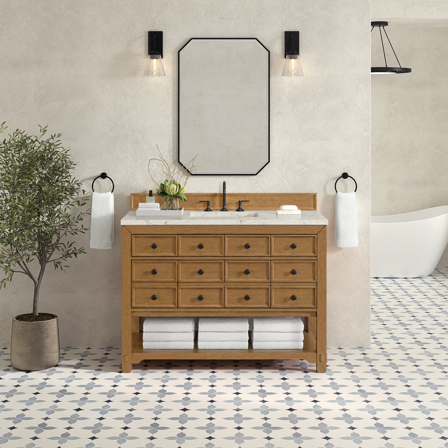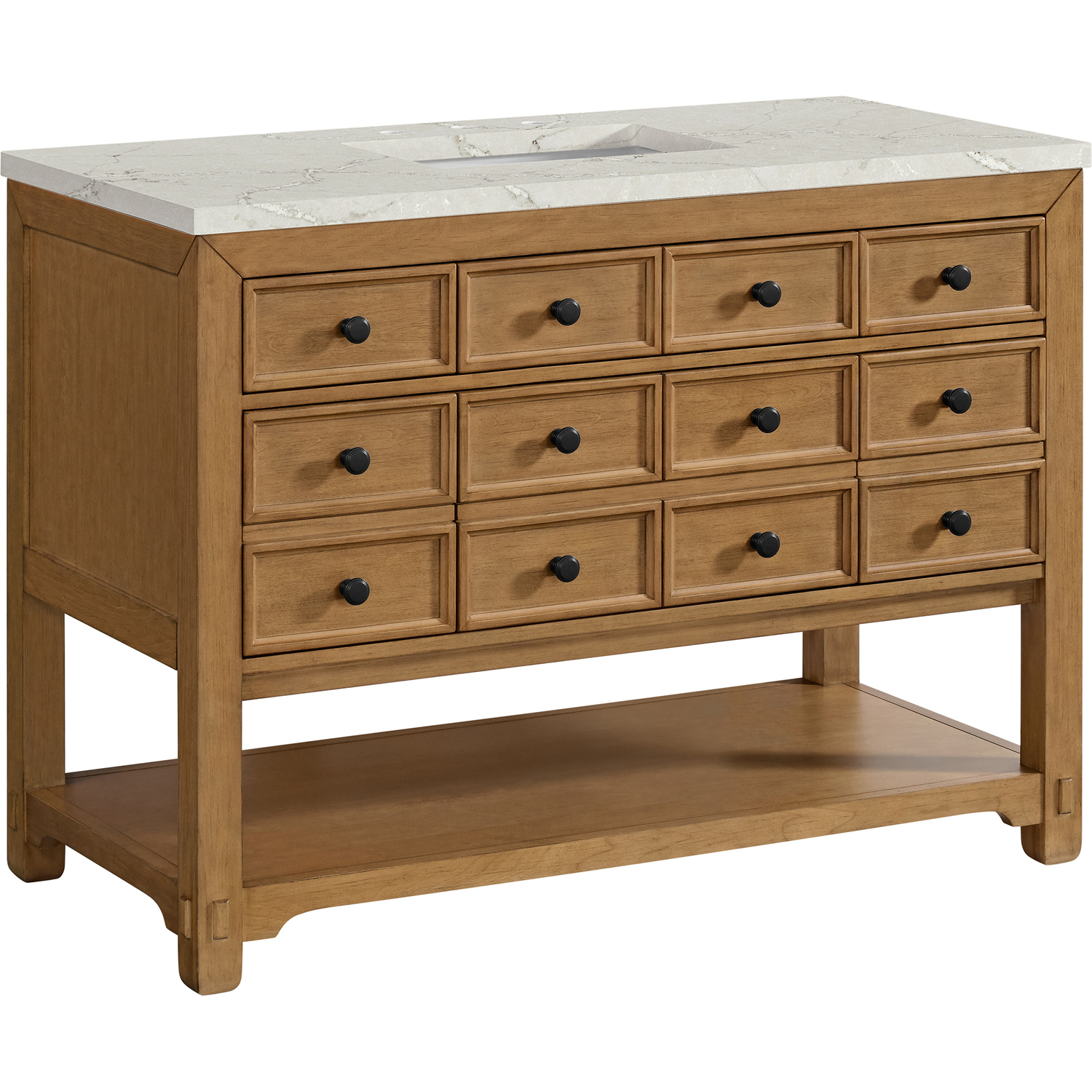 The Malibu 48" Single Vanity by James Martin Vanities features a warm Amber Birch finish and contemporary Matte Black hardware. Made from solid poplar with birch veneers, this vanity features five drawers (three are double-height), one top-row tip-out drawer, and a bottom shelf for additional storage. A matching decorative wooden backsplash is included. The look is completed with a 3cm eased-edge Victorian Silver Silestone top with 8" widespread faucet holes.Single vanity with five drawers (three are double height) and one tip-out drawer; open bottom shelf for extra storageDrawer boxes feature English Dovetail joinery with premium, soft-close undermount drawer slidesCabinet is finished inside and out with a premium undercoat finish for superior moisture and UV resistanceAmber Birch finish with Matte Black hardwareCountertop is pre-drilled for an 8" widespread faucetOur 3cm eased edge countertops come with white porcelain rectangular sink(s) that ship separately and include mounting brackets for easy installationDrawers lined with our signature brushed aluminum laminate for easy cleaningFreestanding console-style vanityMatching decorative wood backsplash is includedFaucet sold separatelyRemovable Bamboo drawer organizer includedThe Malibu Collection effortlessly fuses classic charm with ample storage in the California Mission style. The warm wood tones of the Amber Birch finish create a timeless aesthetic, while the Modern Matte Black hardware complements the design and accentuates the practicality within its thoughtfully crafted drawers and an open shelf.1 year warranty against manufacturer's defects. We will repair or replace any defective product, if the product is defective in material or workmanship at our discretion. No warranty is expressed or implied regarding damages resulting from consumer misuse.