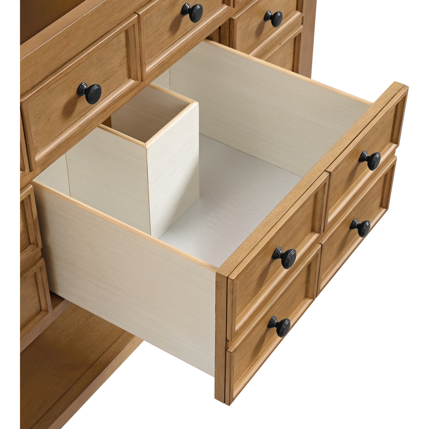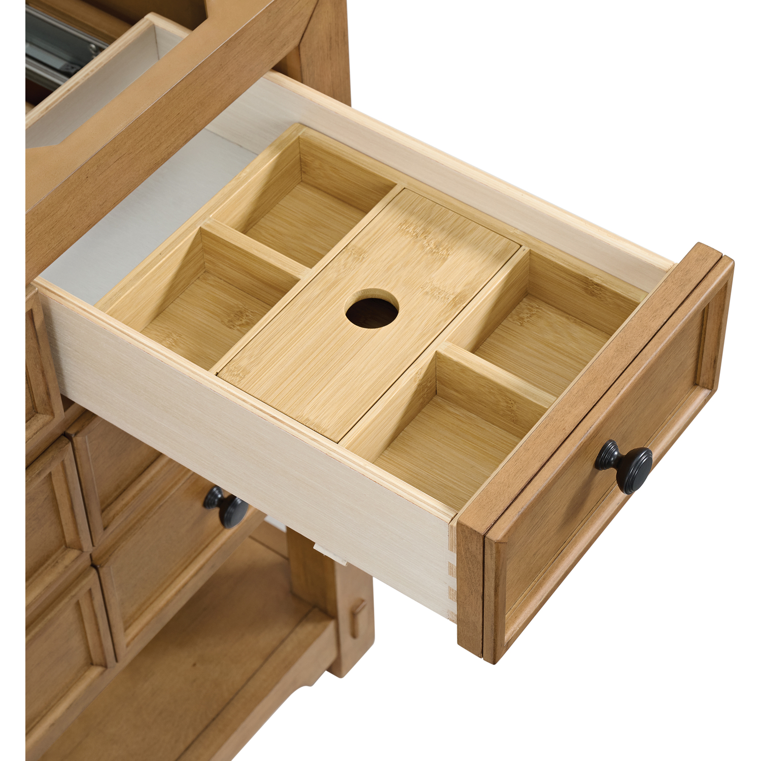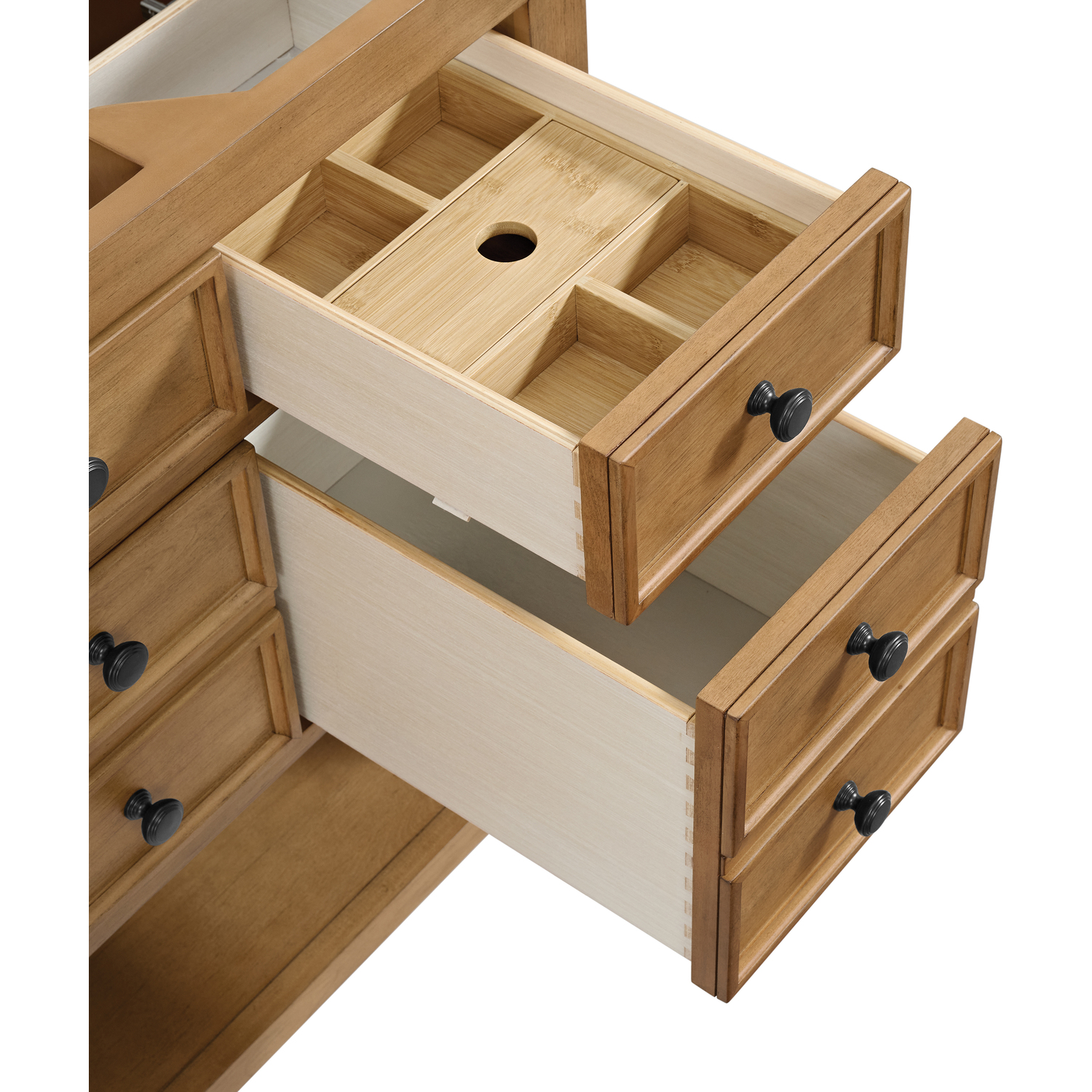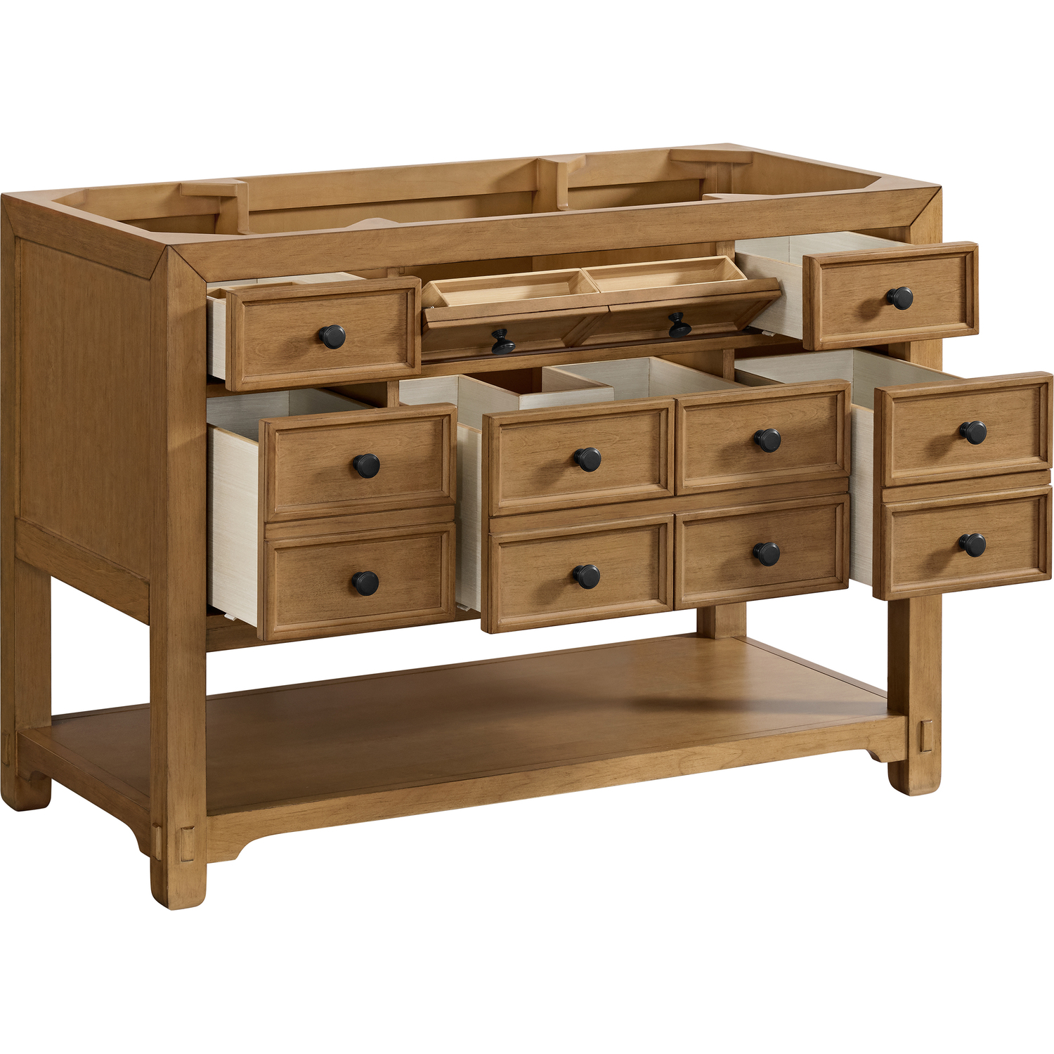 The Malibu 48" Single Vanity by James Martin Vanities features a warm Amber Birch finish and contemporary Matte Black hardware. Made from solid poplar with birch veneers, this vanity features five drawers (three are double-height), one top-row tip-out drawer, and a bottom shelf for additional storage. A matching decorative wooden backsplash is included. Complete the look with one of our 3cm countertops.Single vanity with five drawers (three are double height) and one tip-out drawer; open bottom shelf for extra storageDrawer boxes feature English Dovetail joinery with premium, soft-close undermount drawer slidesCabinet is finished inside and out with a premium undercoat finish for superior moisture and UV resistanceAmber Birch finish with Matte Black hardwareCabinet onlySelect one of our 3cm eased-edge countertops to complete the lookDrawers lined with our signature brushed aluminum laminate for easy cleaningRemovable Bamboo drawer organizer includedFreestanding console-style vanityFaucet sold separatelyMatching decorative wood backsplash is includedThe Malibu Collection effortlessly fuses classic charm with ample storage in the California Mission style. The warm wood tones of the Amber Birch finish create a timeless aesthetic, while the Modern Matte Black hardware complements the design and accentuates the practicality within its thoughtfully crafted drawers and an open shelf.1 year warranty against manufacturer's defects. We will repair or replace any defective product, if the product is defective in material or workmanship at our discretion. No warranty is expressed or implied regarding damages resulting from consumer misuse.