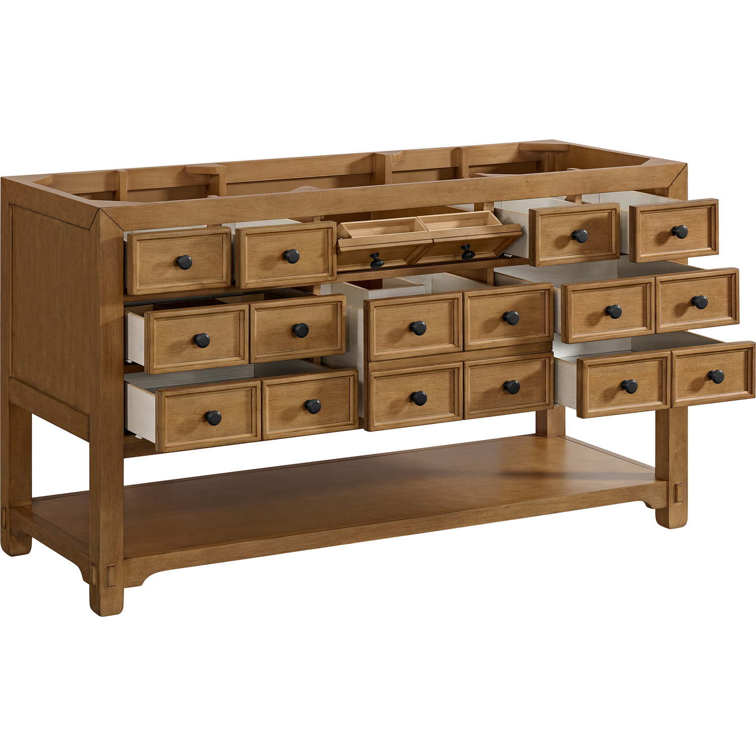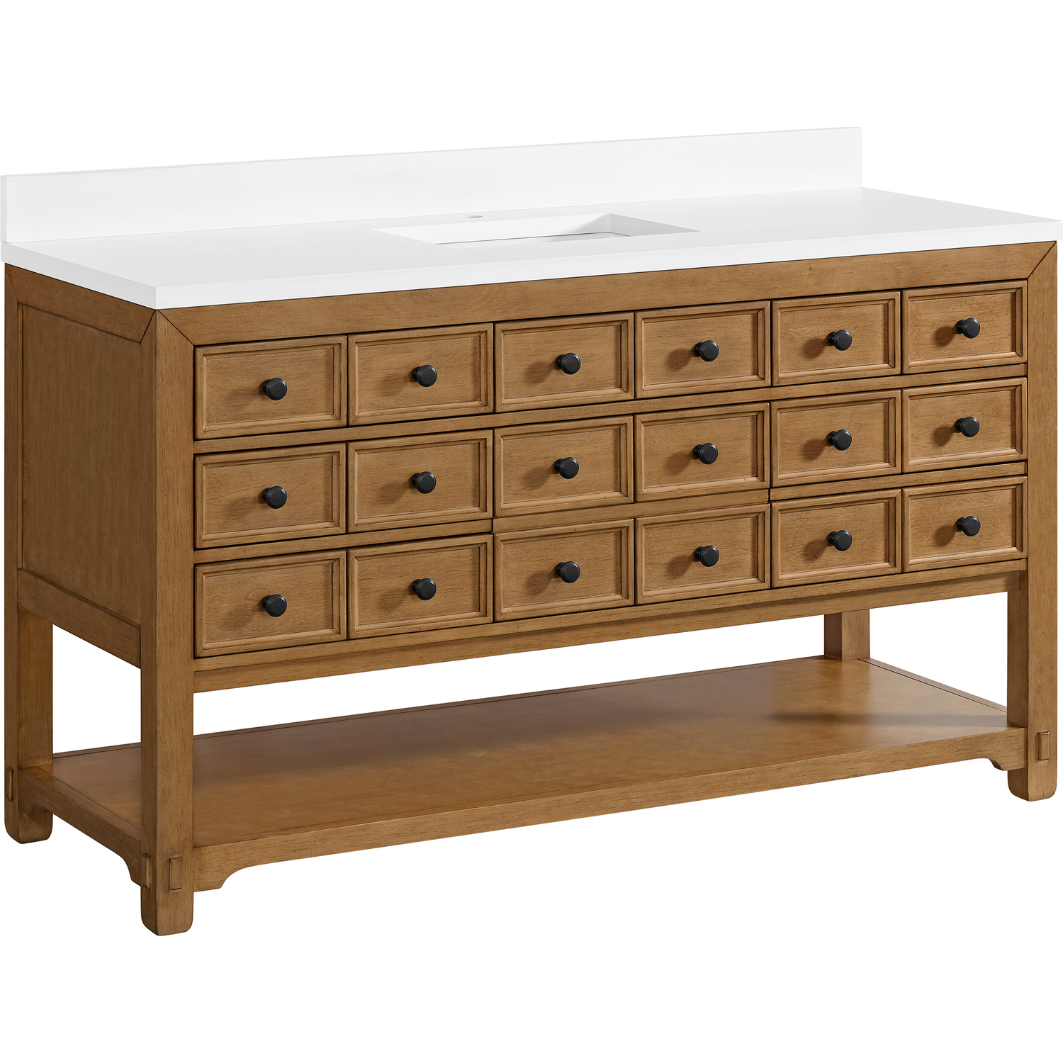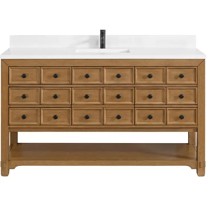 The Malibu 60" Single Vanity by James Martin Vanities features a warm Amber Birch finish and contemporary Matte Black hardware. Made from solid poplar with birch veneers, this vanity features nine drawers (one is double-height), one top-row tip-out drawer, and a bottom shelf for additional storage. A matching decorative wooden backsplash is included. The look is completed with a 3cm eased-edge White Zeus Silestone backsplash and top with a single-faucet hole.Single vanity with nine drawers (one is double-height) and one tip-out drawer; open bottom shelf for extra storageDrawer boxes feature English Dovetail joinery with premium, soft-close undermount drawer slidesCabinet is finished inside and out with a premium undercoat finish for superior moisture and UV resistanceAmber Birch finish with Matte Black hardwareWhite Zeus Silestone top is pre-drilled for a single-hole faucetOur 3cm eased edge countertops come with white porcelain rectangular sink(s) that ship separately and include mounting brackets for easy installationDrawers lined with our signature brushed aluminum laminate for easy cleaningFreestanding console-style vanityMatching White Zeus 3cm Silestone backsplash & decorative wood backsplash included.Faucet sold separatelyRemovable Bamboo drawer organizer includedThe Malibu Collection effortlessly fuses classic charm with ample storage in the California Mission style. The warm wood tones of the Amber Birch finish create a timeless aesthetic, while the Modern Matte Black hardware complements the design and accentuates the practicality within its thoughtfully crafted drawers and an open shelf.1 year warranty against manufacturer's defects. We will repair or replace any defective product, if the product is defective in material or workmanship at our discretion. No warranty is expressed or implied regarding damages resulting from consumer misuse.