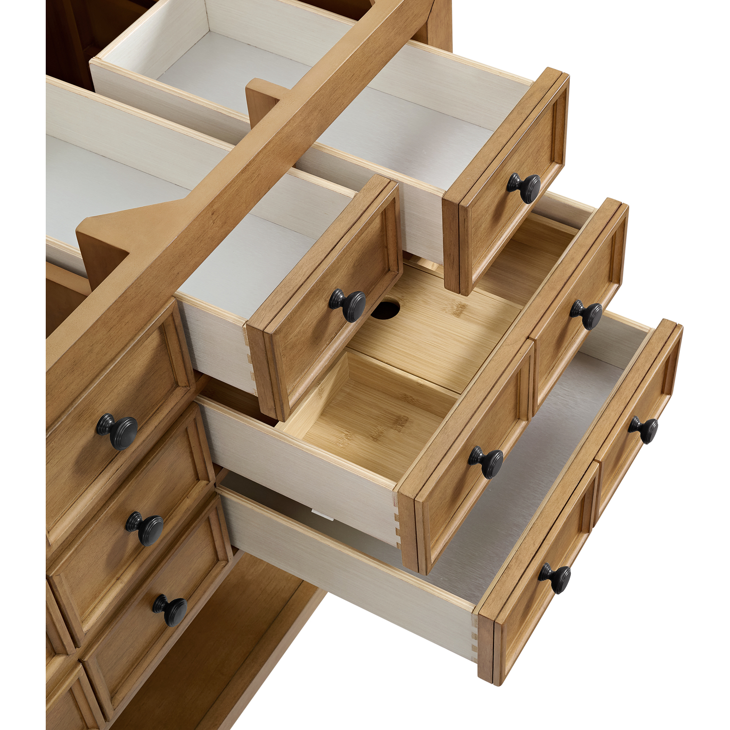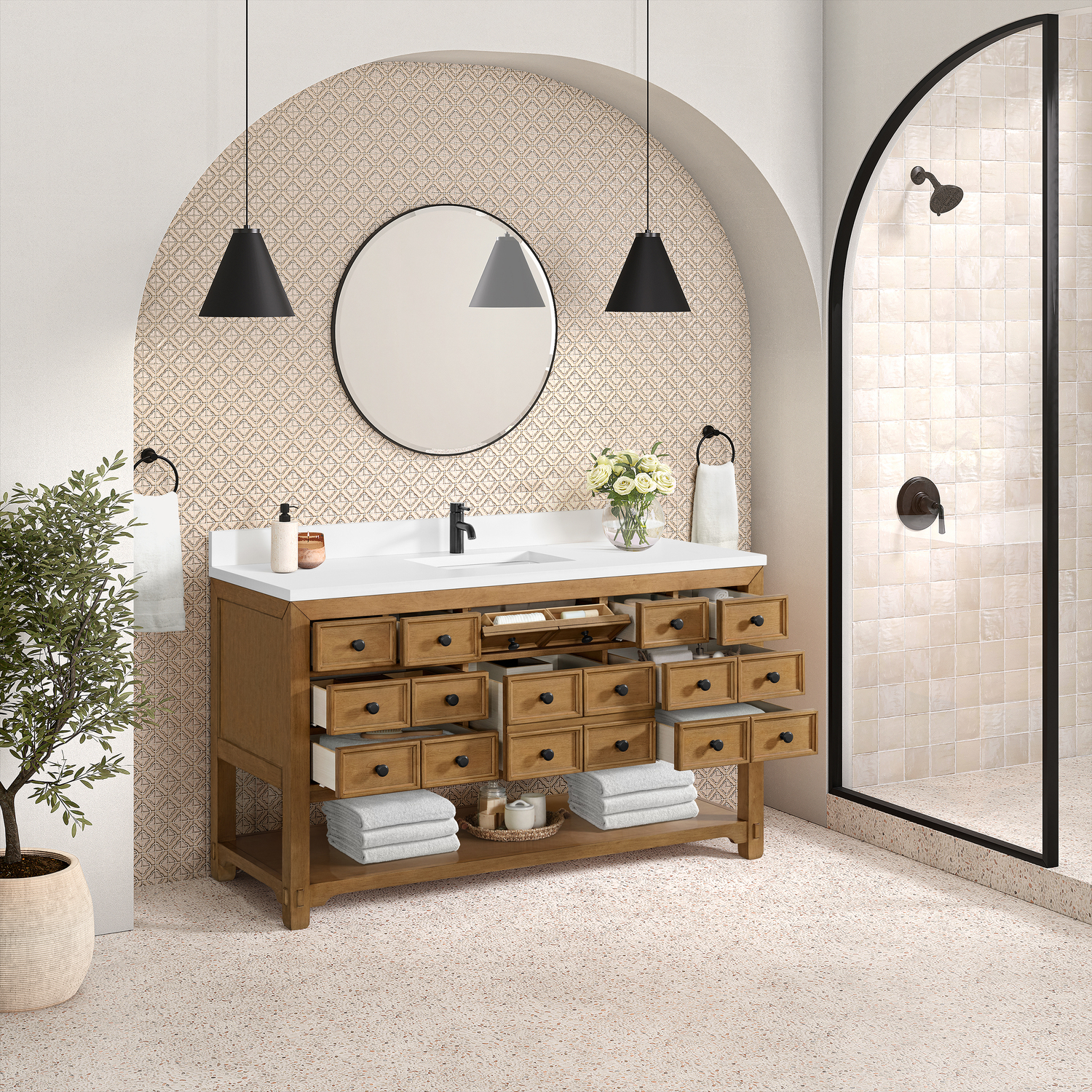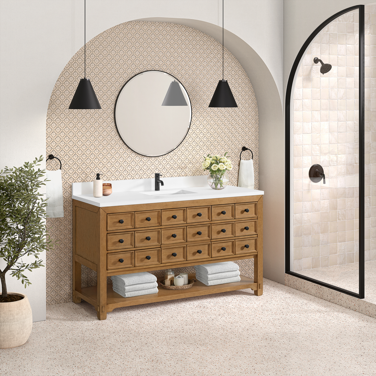 The Malibu 60" Single Vanity by James Martin Vanities features a warm Amber Birch finish and contemporary Matte Black hardware. Made from solid poplar with birch veneers, this vanity features nine drawers (one is double-height), one top-row tip-out drawer, and a bottom shelf for additional storage. A matching decorative wooden backsplash is included. The look is completed with a 3cm eased-edge White Zeus Silestone backsplash and top with a single-faucet hole.Single vanity with nine drawers (one is double-height) and one tip-out drawer; open bottom shelf for extra storageDrawer boxes feature English Dovetail joinery with premium, soft-close undermount drawer slidesCabinet is finished inside and out with a premium undercoat finish for superior moisture and UV resistanceAmber Birch finish with Matte Black hardwareWhite Zeus Silestone top is pre-drilled for a single-hole faucetOur 3cm eased edge countertops come with white porcelain rectangular sink(s) that ship separately and include mounting brackets for easy installationDrawers lined with our signature brushed aluminum laminate for easy cleaningFreestanding console-style vanityMatching White Zeus 3cm Silestone backsplash & decorative wood backsplash included.Faucet sold separatelyRemovable Bamboo drawer organizer includedThe Malibu Collection effortlessly fuses classic charm with ample storage in the California Mission style. The warm wood tones of the Amber Birch finish create a timeless aesthetic, while the Modern Matte Black hardware complements the design and accentuates the practicality within its thoughtfully crafted drawers and an open shelf.1 year warranty against manufacturer's defects. We will repair or replace any defective product, if the product is defective in material or workmanship at our discretion. No warranty is expressed or implied regarding damages resulting from consumer misuse.