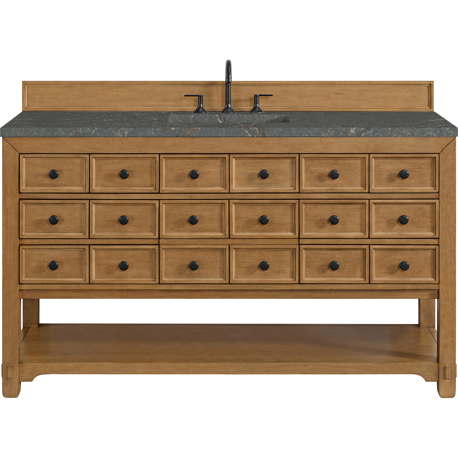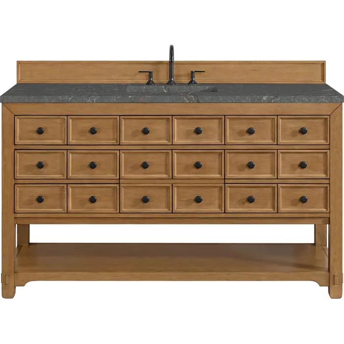 The Malibu 60" Single Vanity by James Martin Vanities features a warm Amber Birch finish and contemporary Matte Black hardware. Made from solid poplar with birch veneers, this vanity features nine drawers (one is double-height), one top-row tip-out drawer, and a bottom shelf for additional storage. A matching decorative wooden backsplash is included. The look is completed with a 3cm eased-edge Parisien Bleu Silestone top with 8" widespread faucet holes.Single vanity with nine drawers (one is double-height) and one tip-out drawer; open bottom shelf for extra storageDrawer boxes feature English Dovetail joinery with premium, soft-close undermount drawer slidesCabinet is finished inside and out with a premium undercoat finish for superior moisture and UV resistanceAmber Birch finish with Matte Black hardwareCountertop is pre-drilled for an 8" widespread faucetOur 3cm eased edge countertops come with white porcelain rectangular sink(s) that ship separately and include mounting brackets for easy installationDrawers lined with our signature brushed aluminum laminate for easy cleaningFreestanding console-style vanityMatching decorative wood backsplash is includedFaucet sold separatelyRemovable Bamboo drawer organizer includedThe Malibu Collection effortlessly fuses classic charm with ample storage in the California Mission style. The warm wood tones of the Amber Birch finish create a timeless aesthetic, while the Modern Matte Black hardware complements the design and accentuates the practicality within its thoughtfully crafted drawers and an open shelf.1 year warranty against manufacturer's defects. We will repair or replace any defective product, if the product is defective in material or workmanship at our discretion. No warranty is expressed or implied regarding damages resulting from consumer misuse.