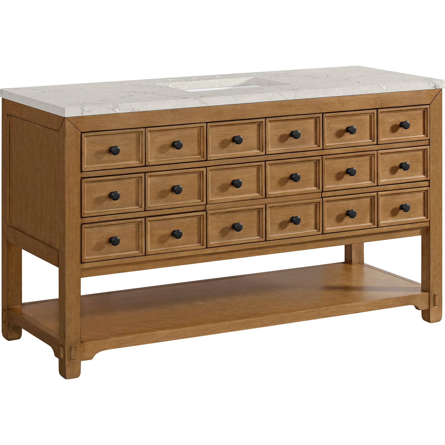 The Malibu 60" Single Vanity by James Martin Vanities features a warm Amber Birch finish and contemporary Matte Black hardware. Made from solid poplar with birch veneers, this vanity features nine drawers (one is double-height), one top-row tip-out drawer, and a bottom shelf for additional storage. A matching decorative wooden backsplash is included. The look is completed with a 3cm eased-edge Victorian Silver Silestone top with 8" widespread faucet holes.Single vanity with nine drawers (one is double-height) and one tip-out drawer; open bottom shelf for extra storageDrawer boxes feature English Dovetail joinery with premium, soft-close undermount drawer slidesCabinet is finished inside and out with a premium undercoat finish for superior moisture and UV resistanceAmber Birch finish with Matte Black hardwareCountertop is pre-drilled for an 8" widespread faucetOur 3cm eased edge countertops come with white porcelain rectangular sink(s) that ship separately and include mounting brackets for easy installationDrawers lined with our signature brushed aluminum laminate for easy cleaningFreestanding console-style vanityMatching decorative wood backsplash is includedFaucet sold separatelyRemovable Bamboo drawer organizer includedThe Malibu Collection effortlessly fuses classic charm with ample storage in the California Mission style. The warm wood tones of the Amber Birch finish create a timeless aesthetic, while the Modern Matte Black hardware complements the design and accentuates the practicality within its thoughtfully crafted drawers and an open shelf.1 year warranty against manufacturer's defects. We will repair or replace any defective product, if the product is defective in material or workmanship at our discretion. No warranty is expressed or implied regarding damages resulting from consumer misuse.