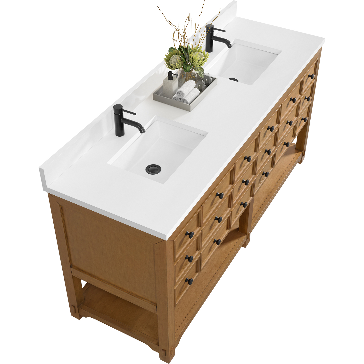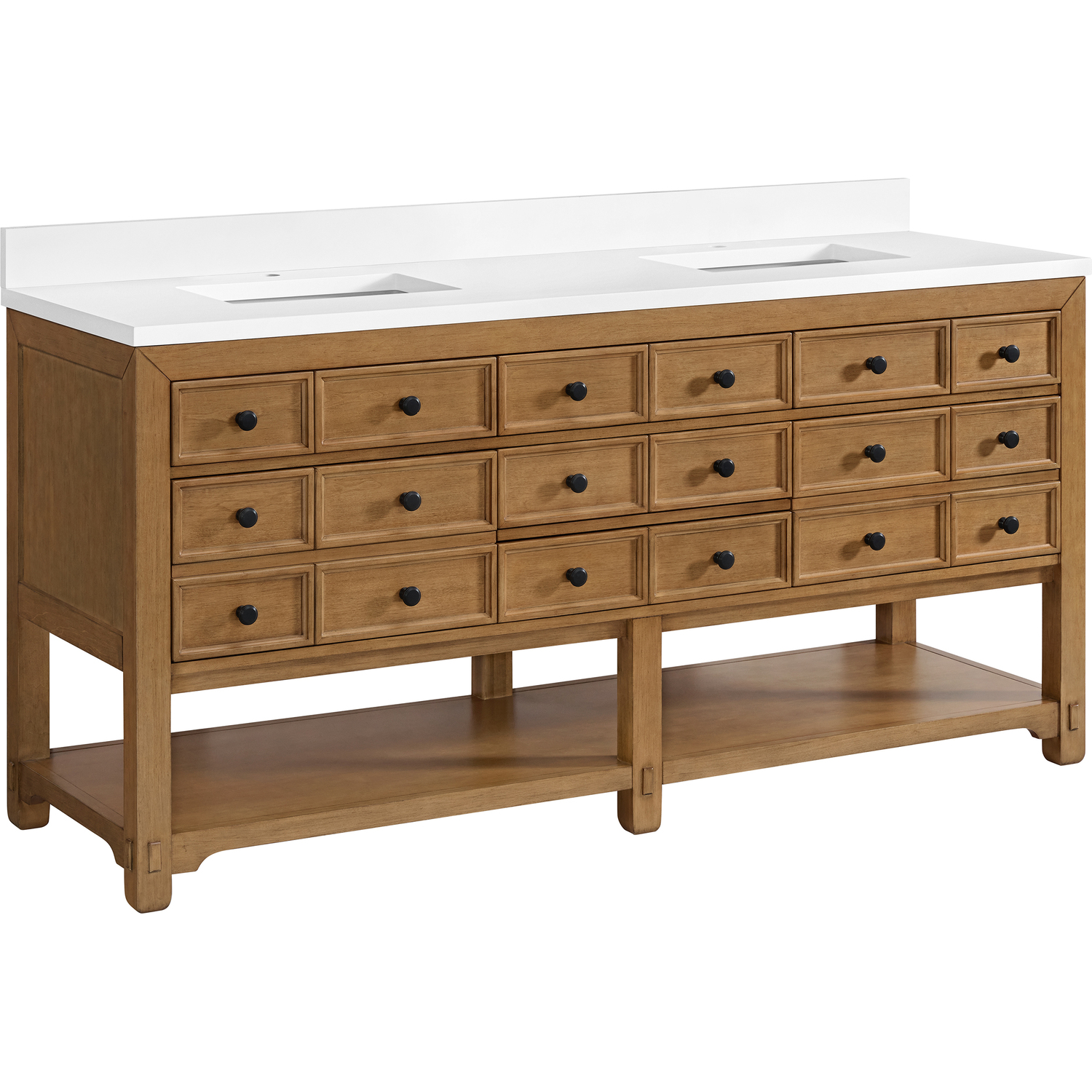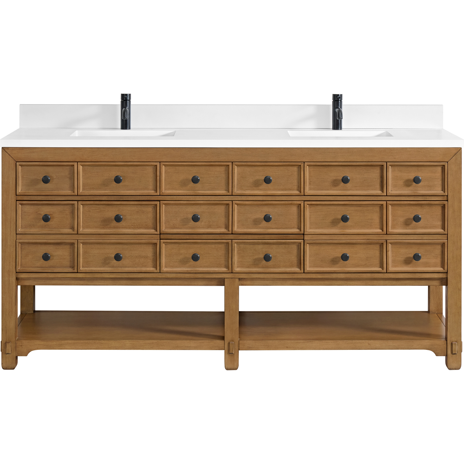 The Malibu 72" Double Vanity by James Martin Vanities features a warm Amber Birch finish and contemporary Matte Black hardware. Made from solid poplar with birch veneers, this vanity features five drawers (two are double-height), two top-row tip-out drawers, and a bottom shelf for additional storage. A matching decorative wooden backsplash is included. The look is completed with a 3cm eased-edge White Zeus Silestone backsplash and top with a single-faucet hole.Double vanity with five drawers (two are double height) and two tip-out drawers; open bottom shelf for extra storageDrawer boxes feature English Dovetail joinery with premium, soft-close undermount drawer slidesCabinet is finished inside and out with a premium undercoat finish for superior moisture and UV resistanceAmber Birch finish with Matte Black hardwareWhite Zeus Silestone top is pre-drilled for a single-hole faucetOur 3cm eased edge countertops come with white porcelain rectangular sink(s) that ship separately and include mounting brackets for easy installationDrawers lined with our signature brushed aluminum laminate for easy cleaningFreestanding console-style vanityMatching White Zeus 3cm Silestone backsplash & decorative wood backsplash included.Faucets sold separatelyRemovable Bamboo drawer organizer includedThe Malibu Collection effortlessly fuses classic charm with ample storage in the California Mission style. The warm wood tones of the Amber Birch finish create a timeless aesthetic, while the Modern Matte Black hardware complements the design and accentuates the practicality within its thoughtfully crafted drawers and an open shelf.1 year warranty against manufacturer's defects. We will repair or replace any defective product, if the product is defective in material or workmanship at our discretion. No warranty is expressed or implied regarding damages resulting from consumer misuse.