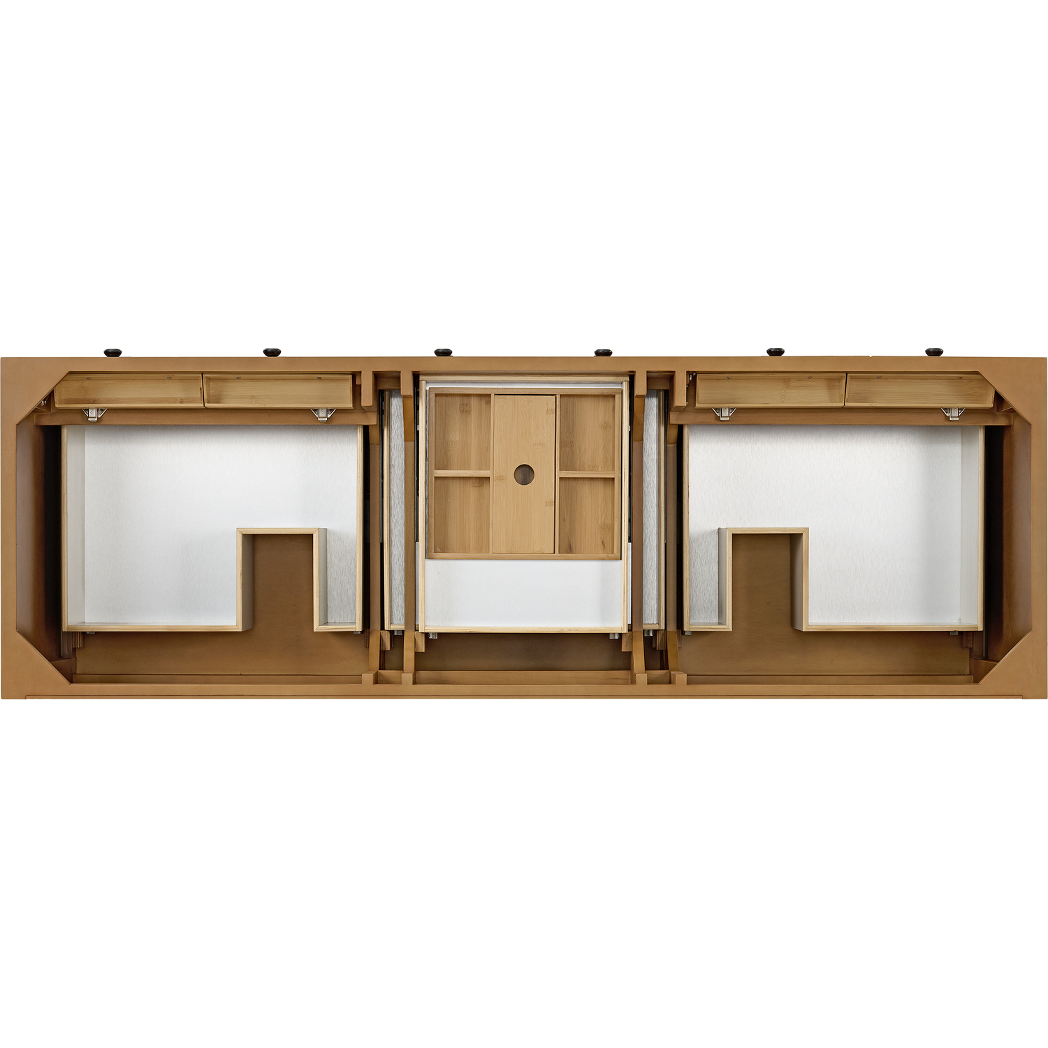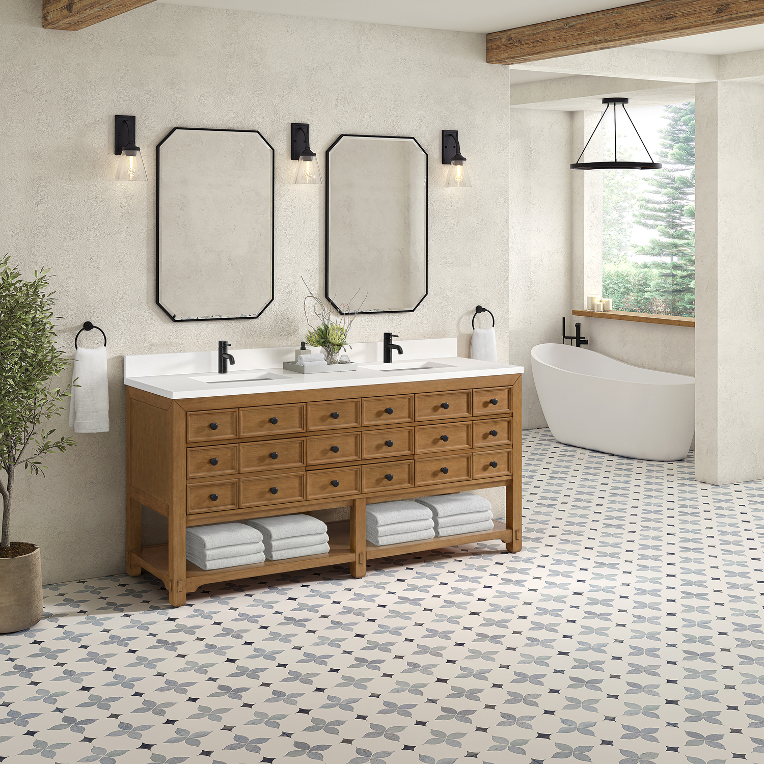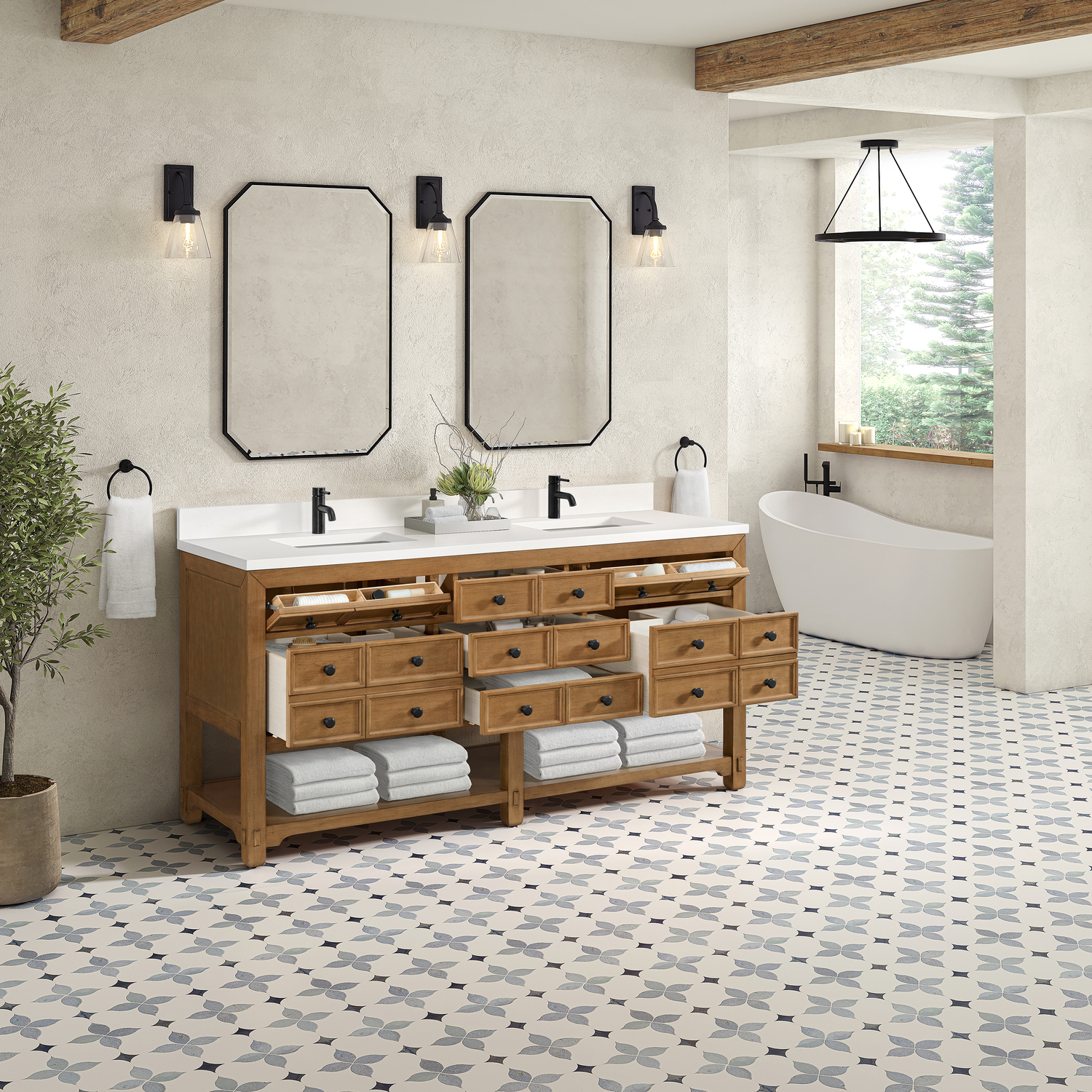 The Malibu 72" Double Vanity by James Martin Vanities features a warm Amber Birch finish and contemporary Matte Black hardware. Made from solid poplar with birch veneers, this vanity features five drawers (two are double-height), two top-row tip-out drawers, and a bottom shelf for additional storage. A matching decorative wooden backsplash is included. The look is completed with a 3cm eased-edge White Zeus Silestone backsplash and top with a single-faucet hole.Double vanity with five drawers (two are double height) and two tip-out drawers; open bottom shelf for extra storageDrawer boxes feature English Dovetail joinery with premium, soft-close undermount drawer slidesCabinet is finished inside and out with a premium undercoat finish for superior moisture and UV resistanceAmber Birch finish with Matte Black hardwareWhite Zeus Silestone top is pre-drilled for a single-hole faucetOur 3cm eased edge countertops come with white porcelain rectangular sink(s) that ship separately and include mounting brackets for easy installationDrawers lined with our signature brushed aluminum laminate for easy cleaningFreestanding console-style vanityMatching White Zeus 3cm Silestone backsplash & decorative wood backsplash included.Faucets sold separatelyRemovable Bamboo drawer organizer includedThe Malibu Collection effortlessly fuses classic charm with ample storage in the California Mission style. The warm wood tones of the Amber Birch finish create a timeless aesthetic, while the Modern Matte Black hardware complements the design and accentuates the practicality within its thoughtfully crafted drawers and an open shelf.1 year warranty against manufacturer's defects. We will repair or replace any defective product, if the product is defective in material or workmanship at our discretion. No warranty is expressed or implied regarding damages resulting from consumer misuse.
