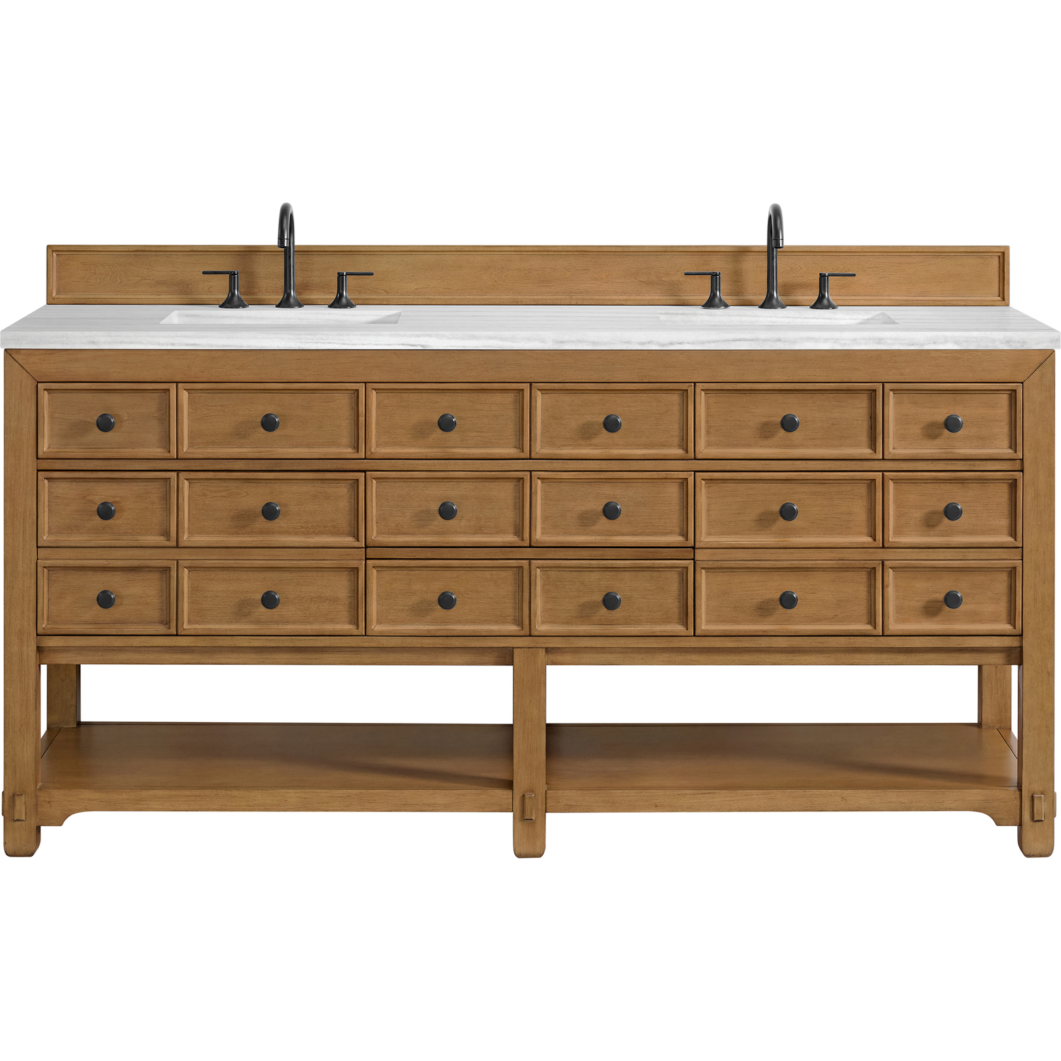 The Malibu 72" Double Vanity by James Martin Vanities features a warm Amber Birch finish and contemporary Matte Black hardware. Made from solid poplar with birch veneers, this vanity features five drawers (two are double-height), two top-row tip-out drawers, and a bottom shelf for additional storage. A matching decorative wooden backsplash is included. The look is completed with a 3cm eased-edge Arctic Fall Solid Surface top with 8" widespread faucet holes.Double vanity with five drawers (two are double height) and two tip-out drawers; open bottom shelf for extra storageDrawer boxes feature English Dovetail joinery with premium, soft-close undermount drawer slidesCabinet is finished inside and out with a premium undercoat finish for superior moisture and UV resistanceAmber Birch finish with Matte Black hardwareCountertop is pre-drilled for an 8" widespread faucetOur 3cm eased edge countertops come with white porcelain rectangular sink(s) that ship separately and include mounting brackets for easy installationDrawers lined with our signature brushed aluminum laminate for easy cleaningFreestanding console-style vanityMatching decorative wood backsplash is includedFaucets sold separatelyRemovable Bamboo drawer organizer includedThe Malibu Collection effortlessly fuses classic charm with ample storage in the California Mission style. The warm wood tones of the Amber Birch finish create a timeless aesthetic, while the Modern Matte Black hardware complements the design and accentuates the practicality within its thoughtfully crafted drawers and an open shelf.1 year warranty against manufacturer's defects. We will repair or replace any defective product, if the product is defective in material or workmanship at our discretion. No warranty is expressed or implied regarding damages resulting from consumer misuse.