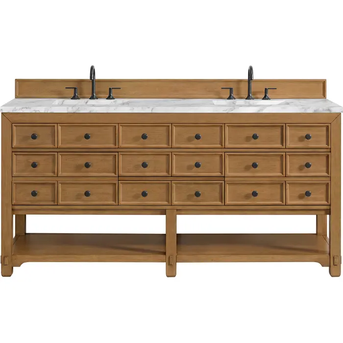 The Malibu 72" Double Vanity by James Martin Vanities features a warm Amber Birch finish and contemporary Matte Black hardware. Made from solid poplar with birch veneers, this vanity features five drawers (two are double-height), two top-row tip-out drawers, and a bottom shelf for additional storage. A matching decorative wooden backsplash is included. The look is completed with a 3cm eased-edge Carrara Marble top with 8" widespread faucet holes.Double vanity with five drawers (two are double height) and two tip-out drawers; open bottom shelf for extra storageDrawer boxes feature English Dovetail joinery with premium, soft-close undermount drawer slidesCabinet is finished inside and out with a premium undercoat finish for superior moisture and UV resistanceAmber Birch finish with Matte Black hardwareCountertop is pre-drilled for an 8" widespread faucetOur 3cm eased edge countertops come with white porcelain rectangular sink(s) that ship separately and include mounting brackets for easy installationDrawers lined with our signature brushed aluminum laminate for easy cleaningFreestanding console-style vanityMatching decorative wood backsplash is includedFaucets sold separatelyRemovable Bamboo drawer organizer includedThe Malibu Collection effortlessly fuses classic charm with ample storage in the California Mission style. The warm wood tones of the Amber Birch finish create a timeless aesthetic, while the Modern Matte Black hardware complements the design and accentuates the practicality within its thoughtfully crafted drawers and an open shelf.1 year warranty against manufacturer's defects. We will repair or replace any defective product, if the product is defective in material or workmanship at our discretion. No warranty is expressed or implied regarding damages resulting from consumer misuse.