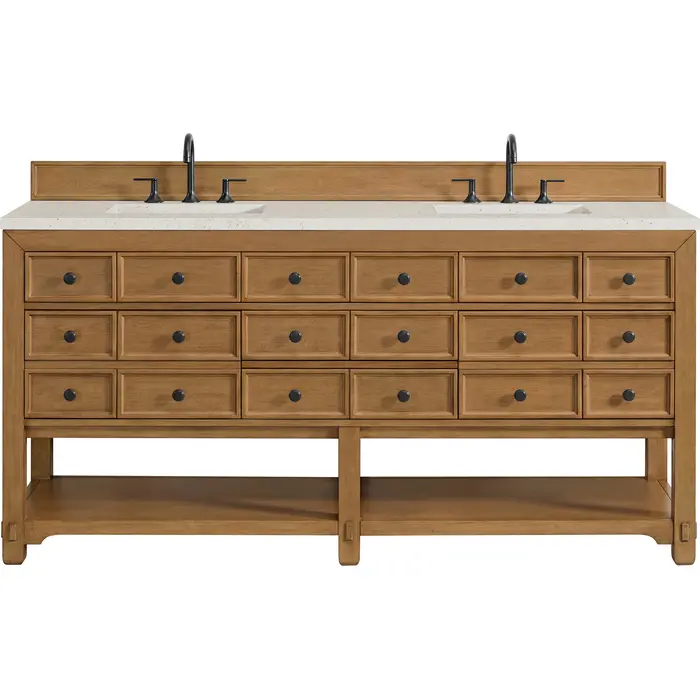 The Malibu 72" Double Vanity by James Martin Vanities features a warm Amber Birch finish and contemporary Matte Black hardware. Made from solid poplar with birch veneers, this vanity features five drawers (two are double-height), two top-row tip-out drawers, and a bottom shelf for additional storage. A matching decorative wooden backsplash is included. The look is completed with a 3cm eased-edge Lime Delight Silestone top with 8" widespread faucet holes.Double vanity with five drawers (two are double height) and two tip-out drawers; open bottom shelf for extra storageDrawer boxes feature English Dovetail joinery with premium, soft-close undermount drawer slidesCabinet is finished inside and out with a premium undercoat finish for superior moisture and UV resistanceAmber Birch finish with Matte Black hardwareCountertop is pre-drilled for an 8" widespread faucetOur 3cm eased edge countertops come with white porcelain rectangular sink(s) that ship separately and include mounting brackets for easy installationDrawers lined with our signature brushed aluminum laminate for easy cleaningFreestanding console-style vanityMatching decorative wood backsplash is includedFaucets sold separatelyRemovable Bamboo drawer organizer includedThe Malibu Collection effortlessly fuses classic charm with ample storage in the California Mission style. The warm wood tones of the Amber Birch finish create a timeless aesthetic, while the Modern Matte Black hardware complements the design and accentuates the practicality within its thoughtfully crafted drawers and an open shelf.1 year warranty against manufacturer's defects. We will repair or replace any defective product, if the product is defective in material or workmanship at our discretion. No warranty is expressed or implied regarding damages resulting from consumer misuse.
