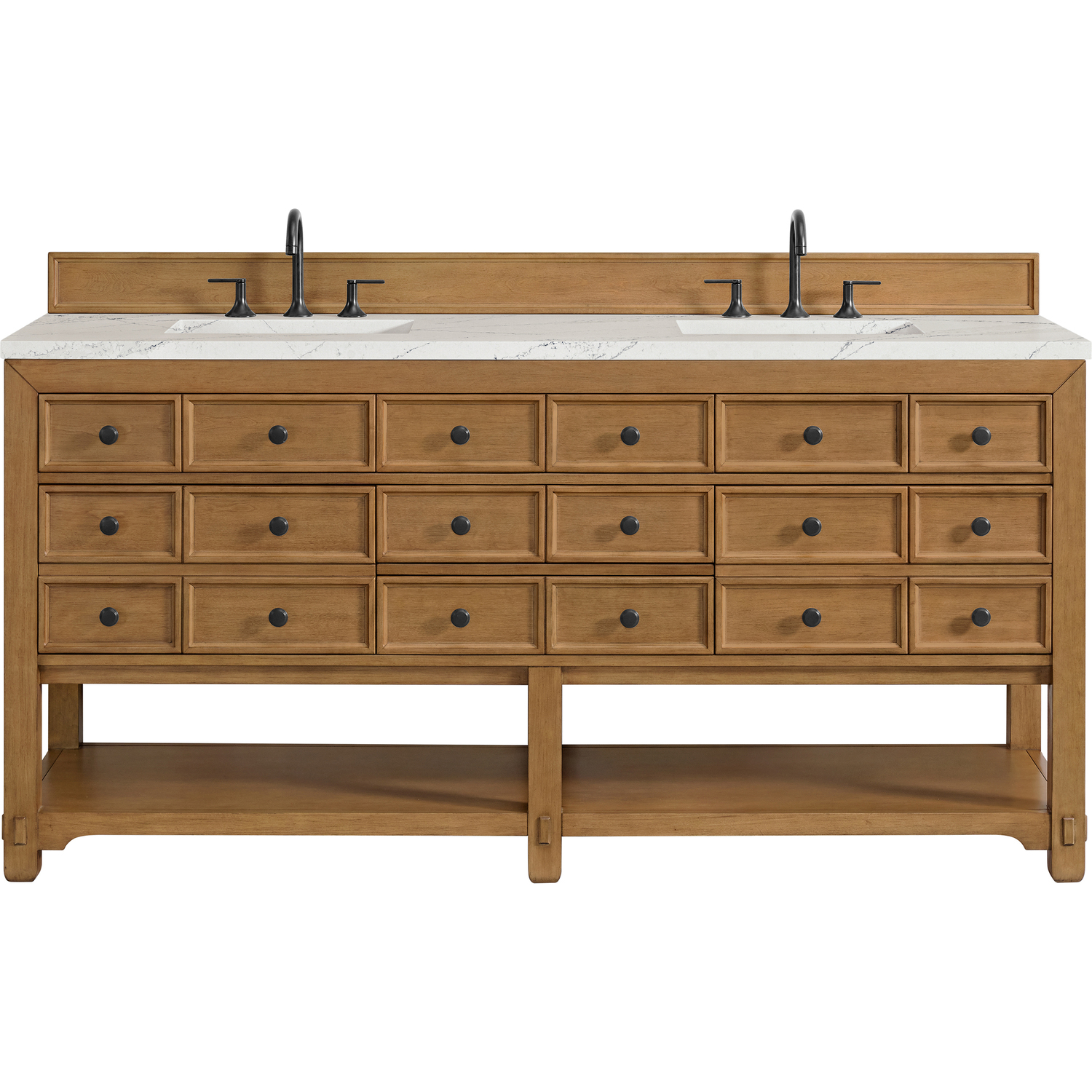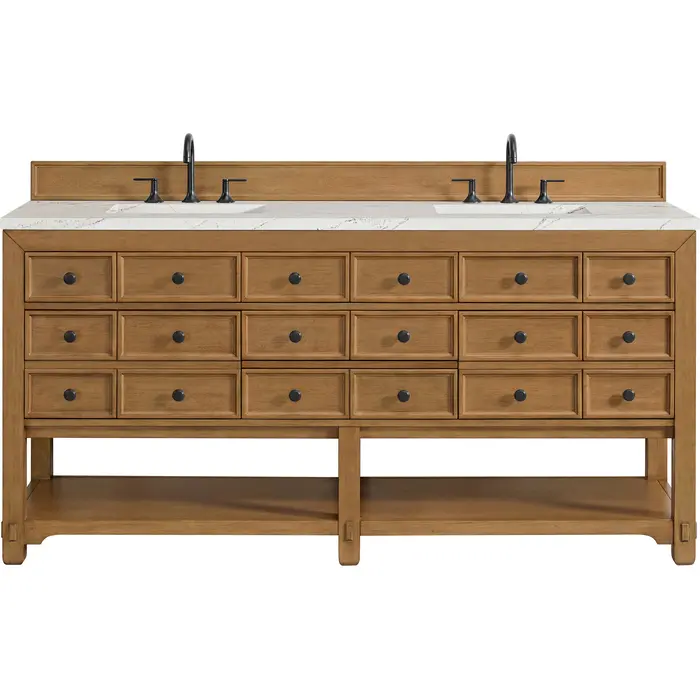 The Malibu 72" Double Vanity by James Martin Vanities features a warm Amber Birch finish and contemporary Matte Black hardware. Made from solid poplar with birch veneers, this vanity features five drawers (two are double-height), two top-row tip-out drawers, and a bottom shelf for additional storage. A matching decorative wooden backsplash is included. The look is completed with a 3cm eased-edge Ethereal Noctis Silestone top with 8" widespread faucet holes.Double vanity with five drawers (two are double height) and two tip-out drawers; open bottom shelf for extra storageDrawer boxes feature English Dovetail joinery with premium, soft-close undermount drawer slidesCabinet is finished inside and out with a premium undercoat finish for superior moisture and UV resistanceAmber Birch finish with Matte Black hardwareCountertop is pre-drilled for an 8" widespread faucetOur 3cm eased edge countertops come with white porcelain rectangular sink(s) that ship separately and include mounting brackets for easy installationDrawers lined with our signature brushed aluminum laminate for easy cleaningFreestanding console-style vanityMatching decorative wood backsplash is includedFaucets sold separatelyRemovable Bamboo drawer organizer includedThe Malibu Collection effortlessly fuses classic charm with ample storage in the California Mission style. The warm wood tones of the Amber Birch finish create a timeless aesthetic, while the Modern Matte Black hardware complements the design and accentuates the practicality within its thoughtfully crafted drawers and an open shelf.1 year warranty against manufacturer's defects. We will repair or replace any defective product, if the product is defective in material or workmanship at our discretion. No warranty is expressed or implied regarding damages resulting from consumer misuse.