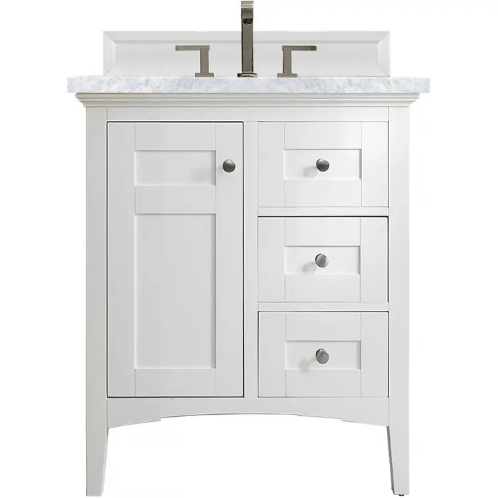The Palisades 30" Bright White Single Vanity features one door with interior shelf space, two drawers, and tapered legs. Interior space is ample with premium features including a bamboo drawer organizer. Shaker made modern, Palisades was designed to lend a modern flair to traditional Shaker-style cabinets. The look is completed with a 3 CM eased edge Carrara Marble top and one white ceramic rectangular sink.One door Bright White single vanity with two drawers and interior shelf space; top drawer is falseHardware Finish: Satin NickelSolid kiln-dried Grade A hardwoodCabinet is finished inside and out with a premium undercoat finish for superior moisture and UV resistanceSoft-close undermount drawer glides and soft-close door hingesDrawer bottoms are lined with our signature brushed aluminum laminateOne bamboo drawer organizerMatching decorative wood backsplash is included3 CM eased edge Carrara Marble top and one white porcelain rectangular sinkFaucet sold separatelyCountertop is pre-drilled for one 3-hole 8" spreadShaker made modern, Palisades was designed to lend a modern flair to traditional Shaker style cabinets. Hallmarks of Shaker style are simple panel doors and gracefully tapered legs. Our Palisades cabinets also have softly arched base valences. Cabinets are crafted from North American Birch solids and veneers. Electrical and USB outlets are featured on select size cabinets, starting with the 36" up to our 72" cabinet. Offered in six different widths and configurations: from a petite 30” cabinet, up to a generous 72” width. Two finish colors: Bright White and Silver Gray1 year warranty against manufacturer's defects. We will repair or replace any defective product, if the product is defective in material or workmanship at our discretion. No warranty is expressed or implied regarding damages resulting from consumer misuse.