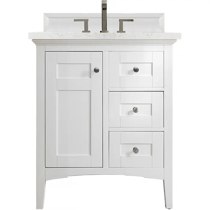 The Palisades 30" Bright White Single Vanity features one door with interior shelf space, two drawers, and tapered legs. Interior space is ample with premium features including a bamboo drawer organizer. Shaker made modern, Palisades was designed to lend a modern flair to traditional Shaker-style cabinets. The look is completed with a 3 CM eased edge Eternal Jasmine Pearl Silestone top and one white ceramic rectangular sink.One door Bright White single vanity with two drawers and interior shelf space; top drawer is falseHardware Finish: Satin NickelSolid kiln-dried Grade A hardwoodCabinet is finished inside and out with a premium undercoat finish for superior moisture and UV resistanceSoft-close undermount drawer glides and soft-close door hingesDrawer bottoms are lined with our signature brushed aluminum laminateOne bamboo drawer organizerMatching decorative wood backsplash is included3 CM eased edge Eternal Jasmine Pearl Silestone top and one white porcelain rectangular sinkFaucet sold separatelyCountertop is pre-drilled for one 3-hole 8" spreadShaker made modern, Palisades was designed to lend a modern flair to traditional Shaker style cabinets. Hallmarks of Shaker style are simple panel doors and gracefully tapered legs. Our Palisades cabinets also have softly arched base valences. Cabinets are crafted from North American Birch solids and veneers. Electrical and USB outlets are featured on select size cabinets, starting with the 36" up to our 72" cabinet. Offered in six different widths and configurations: from a petite 30” cabinet, up to a generous 72” width. Two finish colors: Bright White and Silver Gray1 year warranty against manufacturer's defects. We will repair or replace any defective product, if the product is defective in material or workmanship at our discretion. No warranty is expressed or implied regarding damages resulting from consumer misuse.