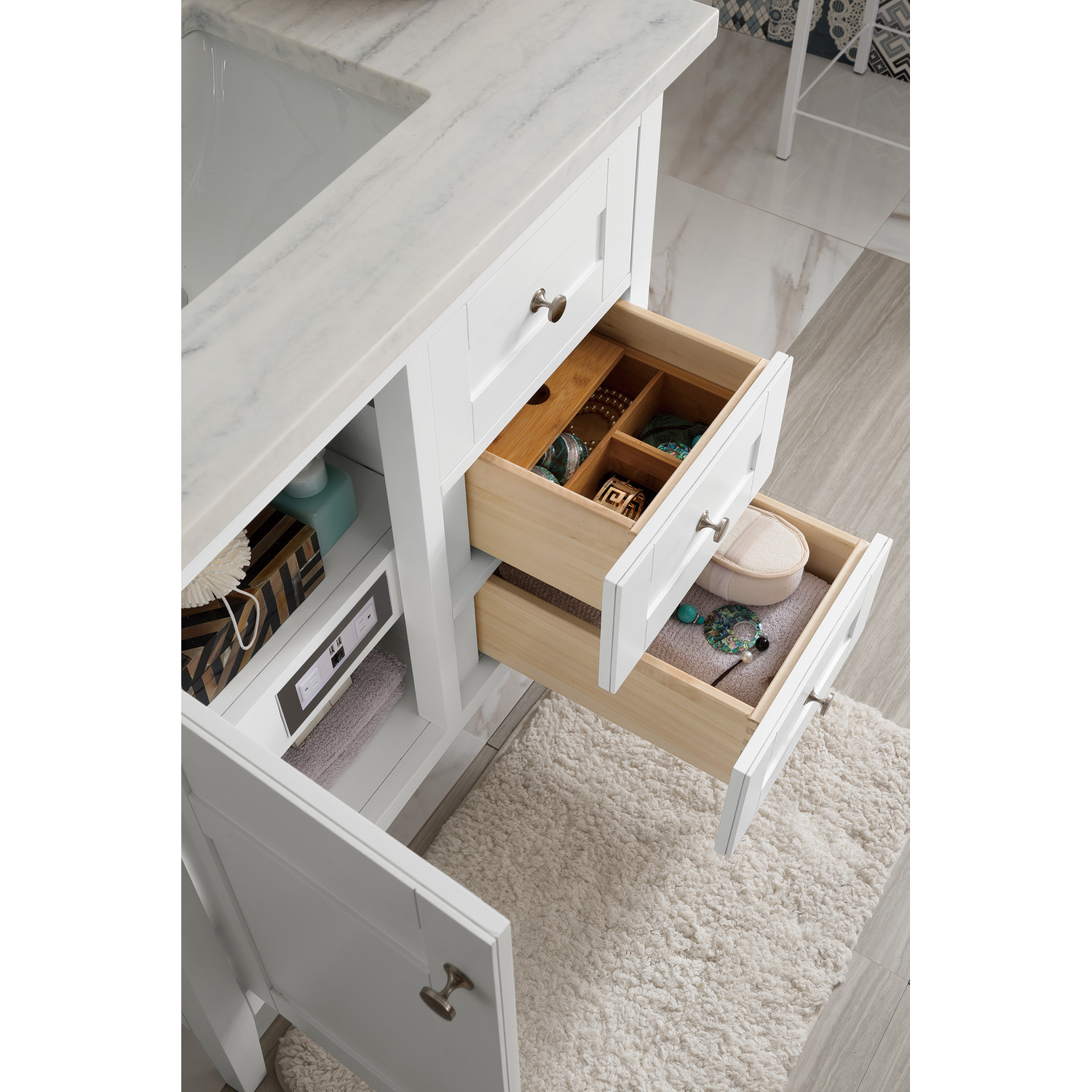 The Palisades 36" Bright White Single Vanity features one door with interior shelf space, two drawers, and tapered legs. Premium features include an electrical and USB outlet located on a custom designed shelf behind the door and a bamboo drawer organizer. Shaker made modern, Palisades was designed to lend a modern flair to traditional Shaker-style cabinets. The look is completed with a 3 CM eased edge Arctic Fall Solid Surface top and one white ceramic rectangular sink.One door Bright White single vanity with two drawers and interior shelf space; top drawer is falseHardware Finish: Satin NickelSolid kiln-dried Grade A hardwoodCabinet is finished inside and out with a premium undercoat finish for superior moisture and UV resistanceSoft-close undermount drawer glides and soft-close door hingesDrawer bottoms are lined with our signature brushed aluminum laminateOne 120 Volt UL rated electrical component with two electrical and two USB (2.0) outletsOne bamboo drawer organizerMatching decorative wood backsplash is includedCountertop is pre-drilled for one 3-hole 8" spread3 CM eased edge Arctic Fall Solid Surface top and one white porcelain rectangular sinkFaucet sold separatelyShaker made modern, Palisades was designed to lend a modern flair to traditional Shaker style cabinets. Hallmarks of Shaker style are simple panel doors and gracefully tapered legs. Our Palisades cabinets also have softly arched base valences. Cabinets are crafted from North American Birch solids and veneers. Electrical and USB outlets are featured on select size cabinets, starting with the 36" up to our 72" cabinet. Offered in six different widths and configurations: from a petite 30” cabinet, up to a generous 72” width. Two finish colors: Bright White and Silver Gray1 year warranty against manufacturer's defects. We will repair or replace any defective product, if the product is defective in material or workmanship at our discretion. No warranty is expressed or implied regarding damages resulting from consumer misuse.