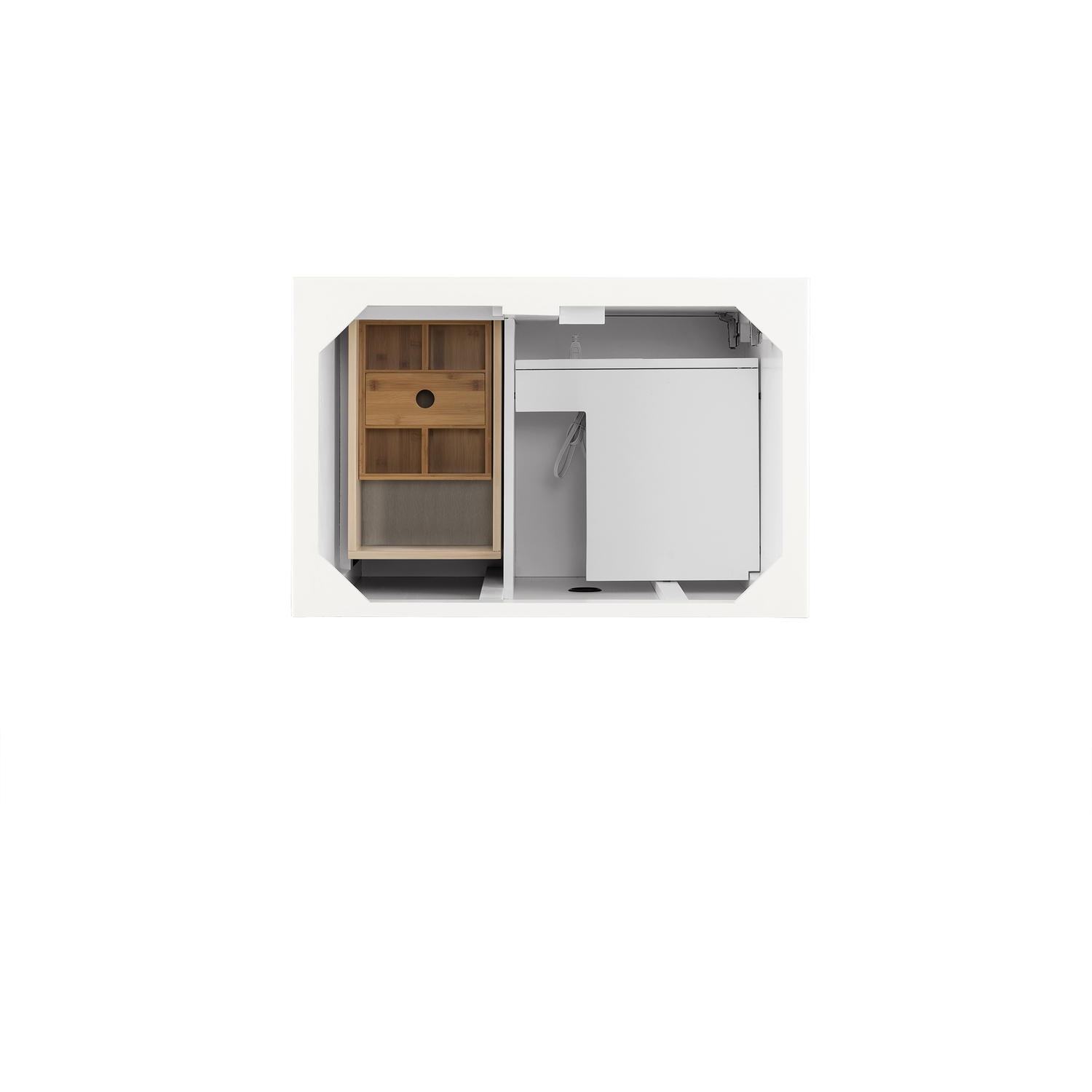 - One door Bright White single vanity cabinet with two drawers and interior shelf space; top drawer is false