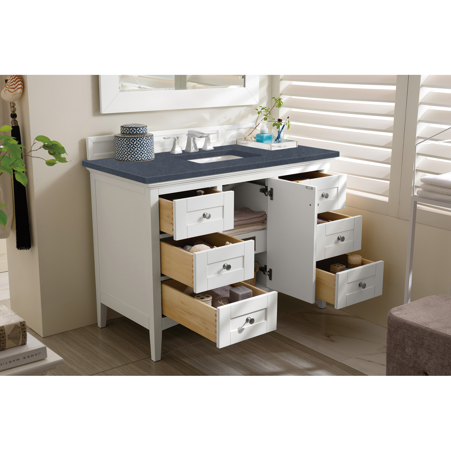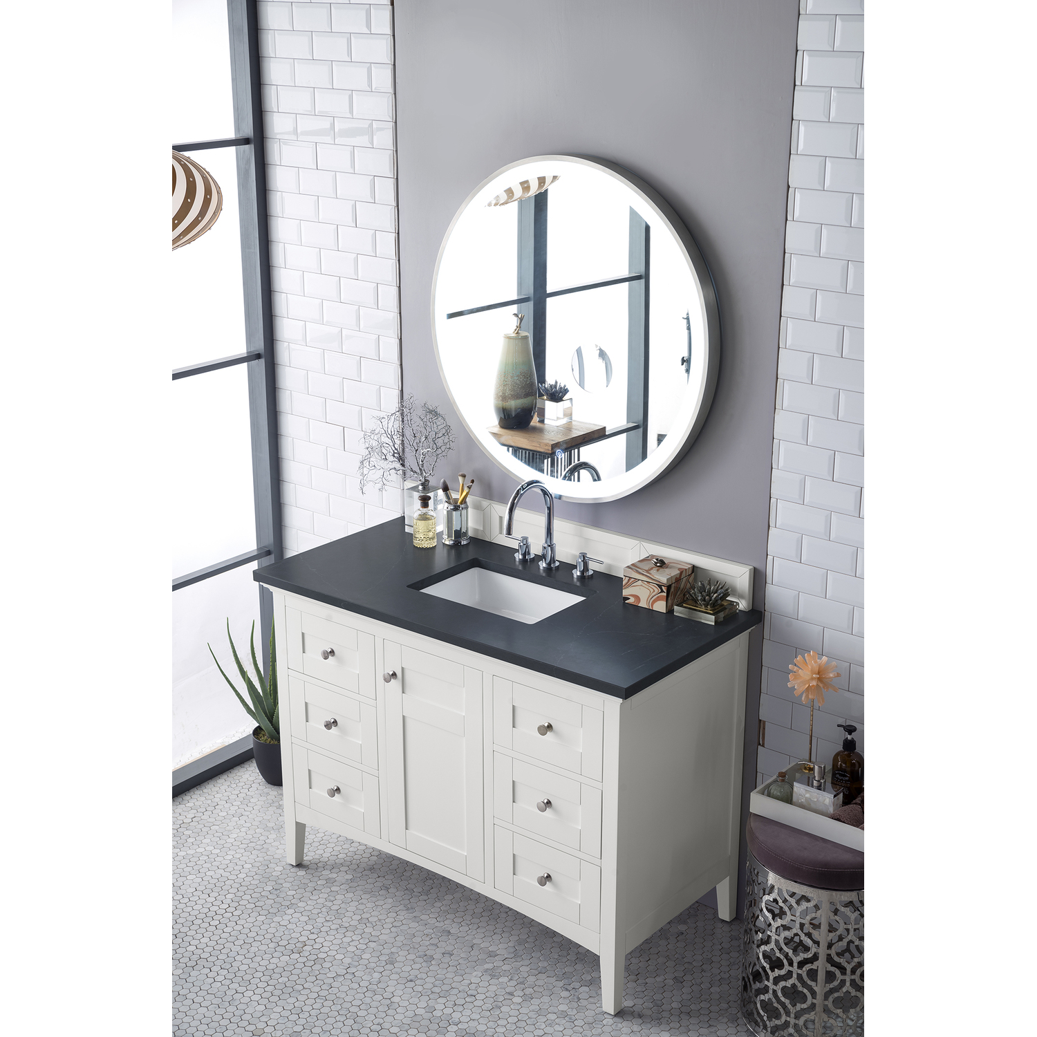 James Martin Palisades 48 inch Single Bathroom Vanity, Bright White w/ 3 CM Charcoal Soapstone Quartz Top 527-V48-BW-3CSP