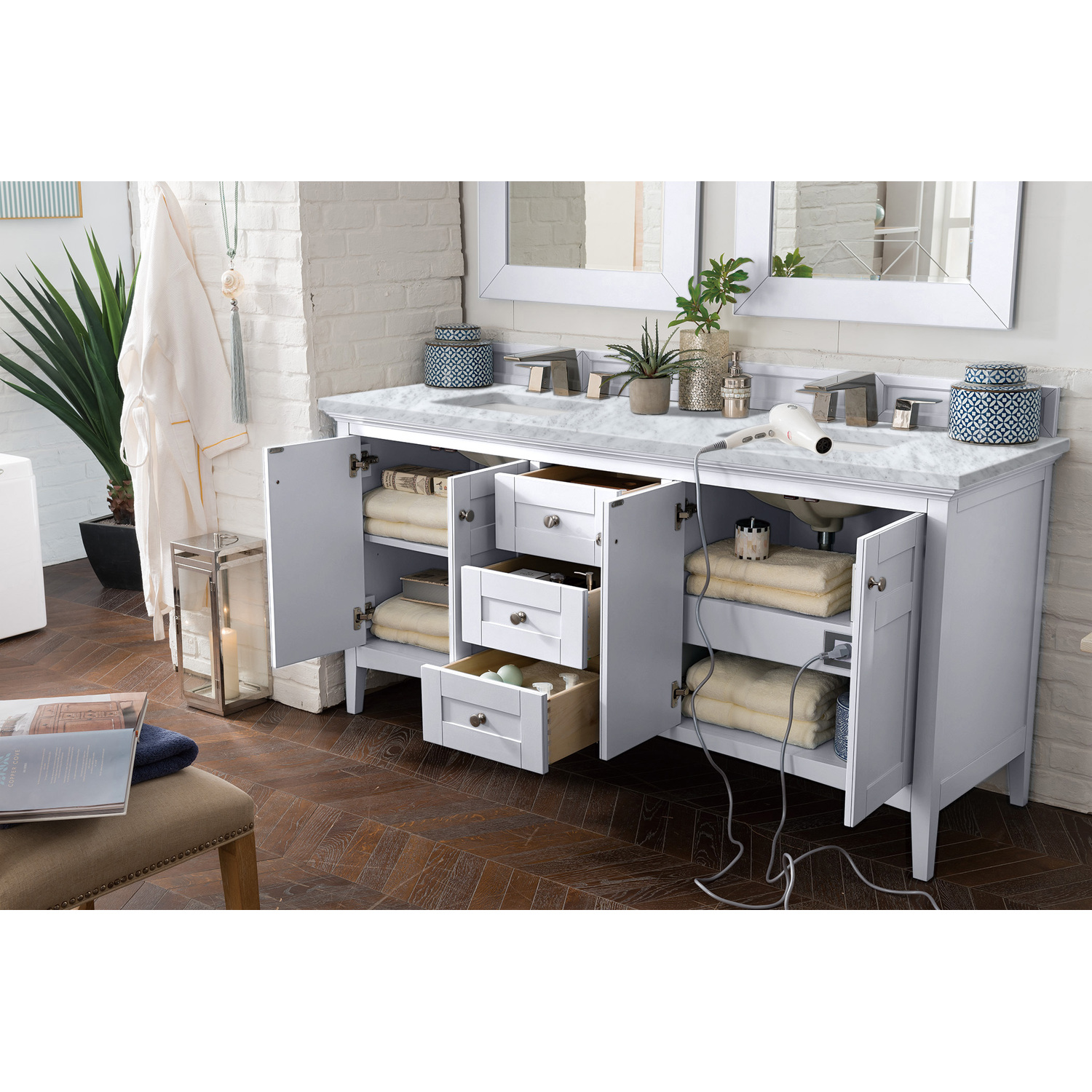 James Martin Palisades 72 inch Double Bathroom Vanity, Bright White w/ 3 CM Carrara Marble Top 527-V72-BW-3CAR