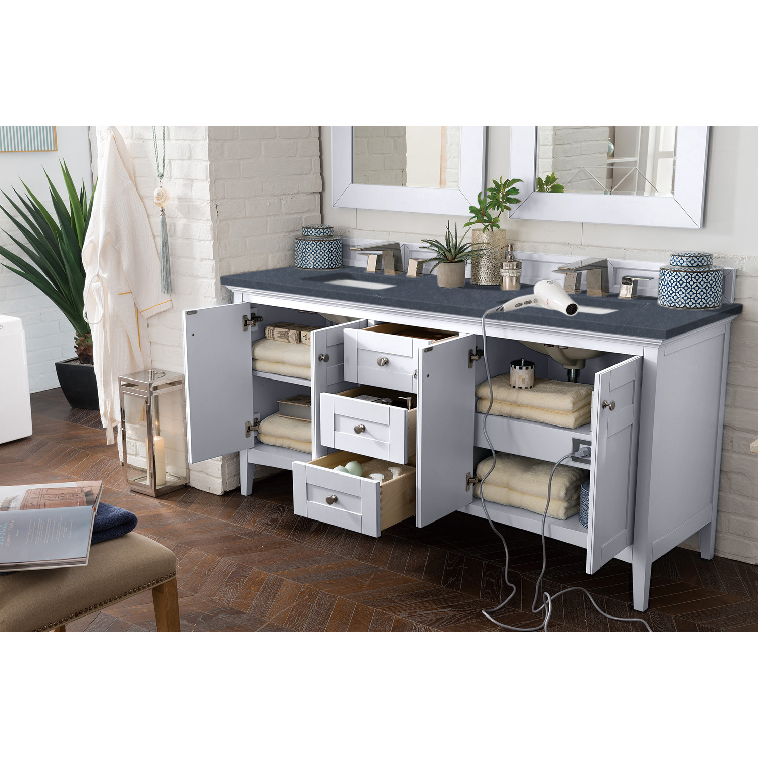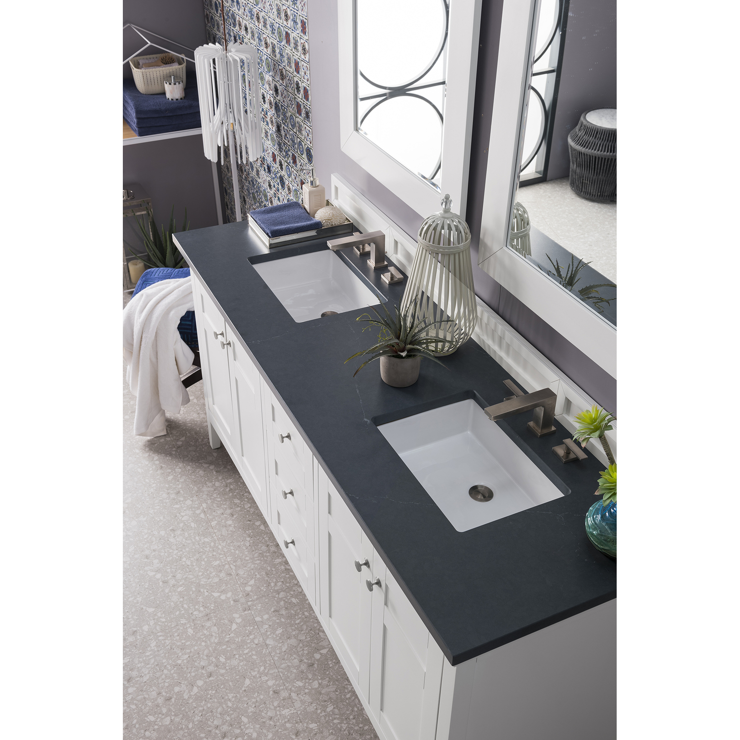 James Martin Palisades 72 inch Double Bathroom Vanity, Bright White w/ 3 CM Charcoal Soapstone Quartz Top 527-V72-BW-3CSP