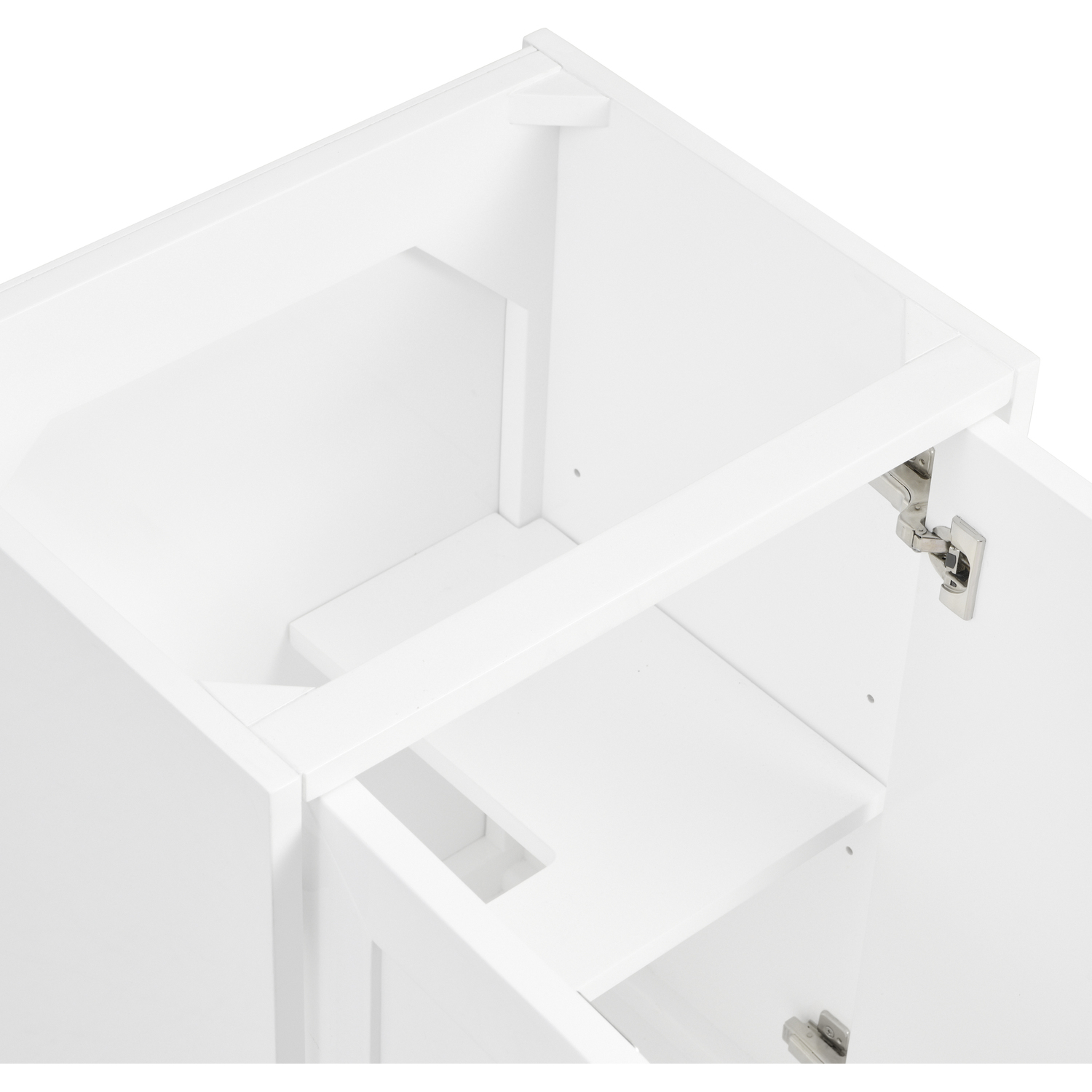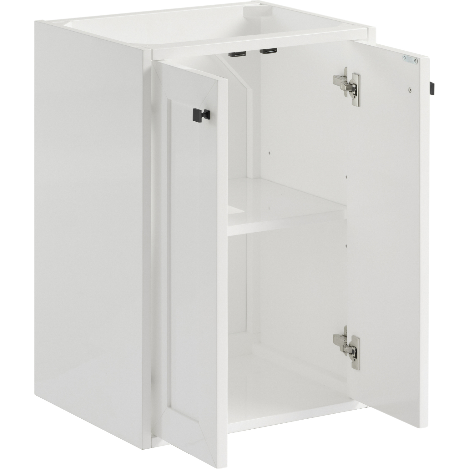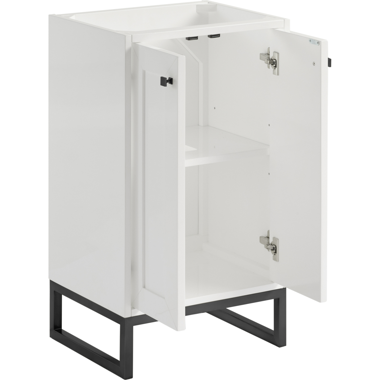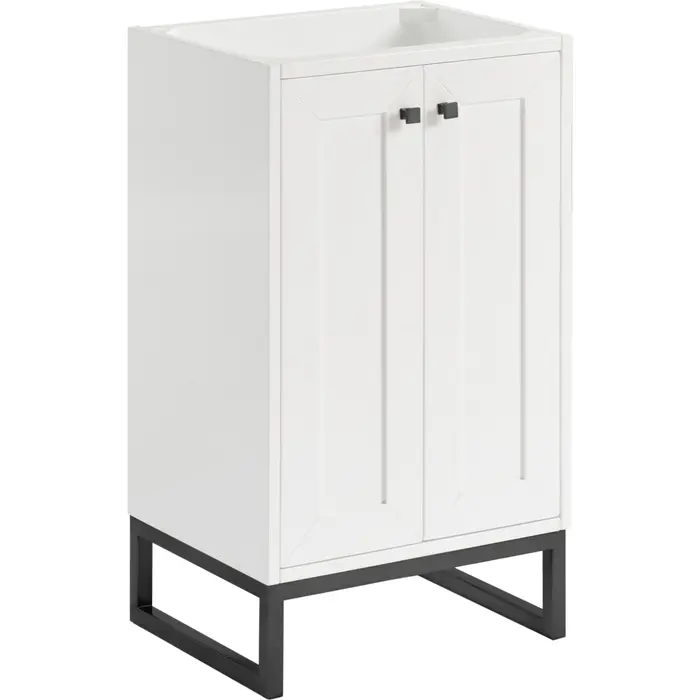 Upgrade your bathroom with the modern simplicity of the Chianti 20" Single Vanity by James Martin Vanities. Crafted from solid hardwoods with a sleek Glossy White finish, this compact vanity combines style with functionality. Designed for versatility, the Chianti comes with a Matte Black stainless-steel base, or opt to wall-mount for a contemporary, space-saving look. Perfect for smaller spaces like powder rooms or half baths, the streamlined design provides ample storage in a compact footprint. Square knobs in all three metal finishes are included to complete the look, seamlessly coordinating with the base options.Two-door cabinet with interior shelfDoors feature soft-close, adjustable door hingesCabinet features a multi-stage premium finish coat to offer UV and moisture resistanceGlossy White cabinet finish with Matte Black baseCabinet and base only; complete the vanity with our White Glossy composite stone sinkEach cabinet comes with square hardware knobs in all three metal finishes that match the coordinating basesDual-mounted: can be installed freestanding or floatingWith its streamlined, minimalistic look and versatile staging, Chianti’s compact design provides storage and style for any powder room or half bath; and its simple, yet elegant silhouette pairs effortlessly with a variety of different decors. This small-space solution can be wall-mounted for a more modern look or installed freestanding with a sleek stainless-steel base. The Chianti vanity is available in two finishes. Each cabinet is completed with square hardware knobs, available in three metal finishes that match the optional bases.1 year warranty against manufacturer's defects. We will repair or replace any defective product, if the product is defective in material or workmanship at our discretion. No warranty is expressed or implied regarding damages resulting from consumer misuse.