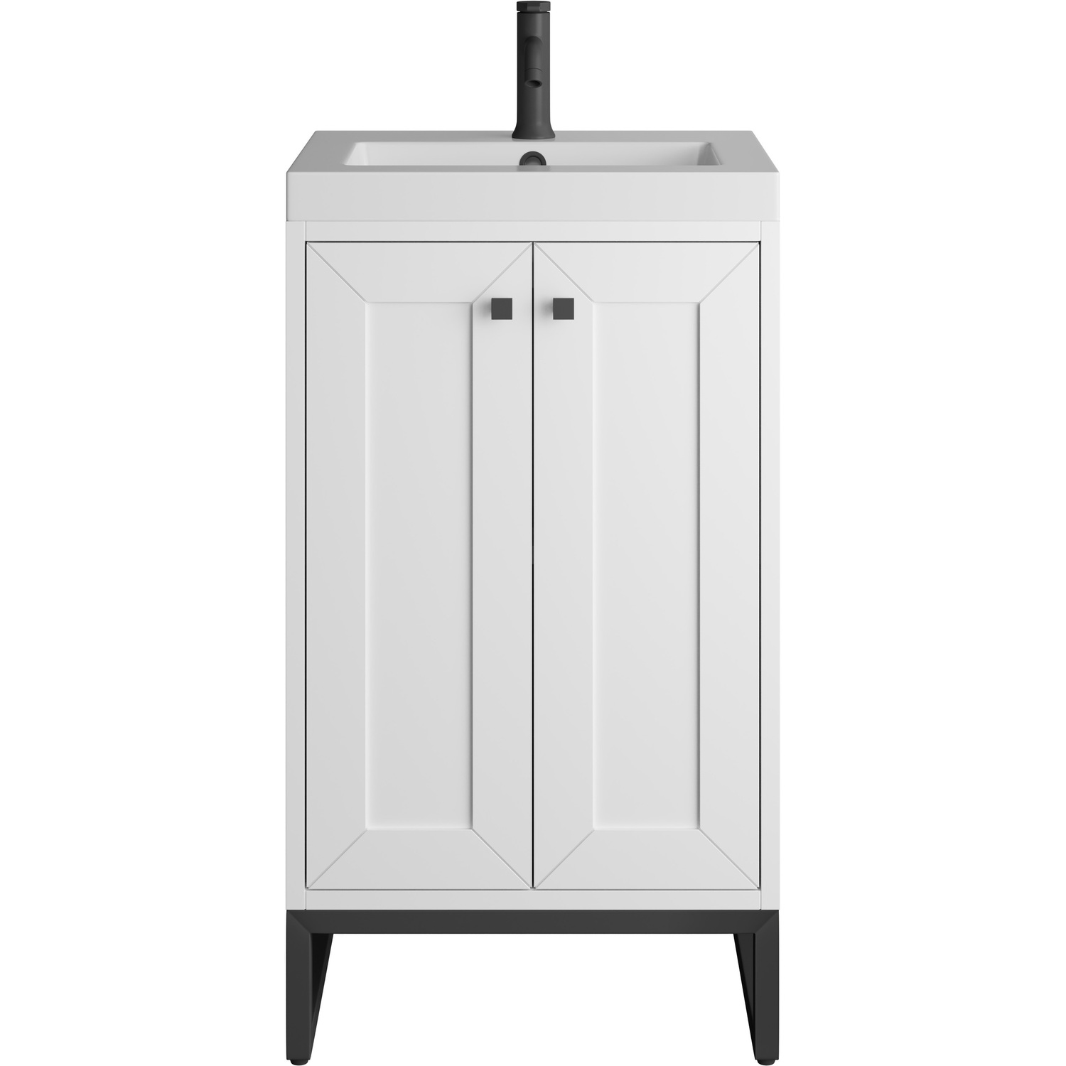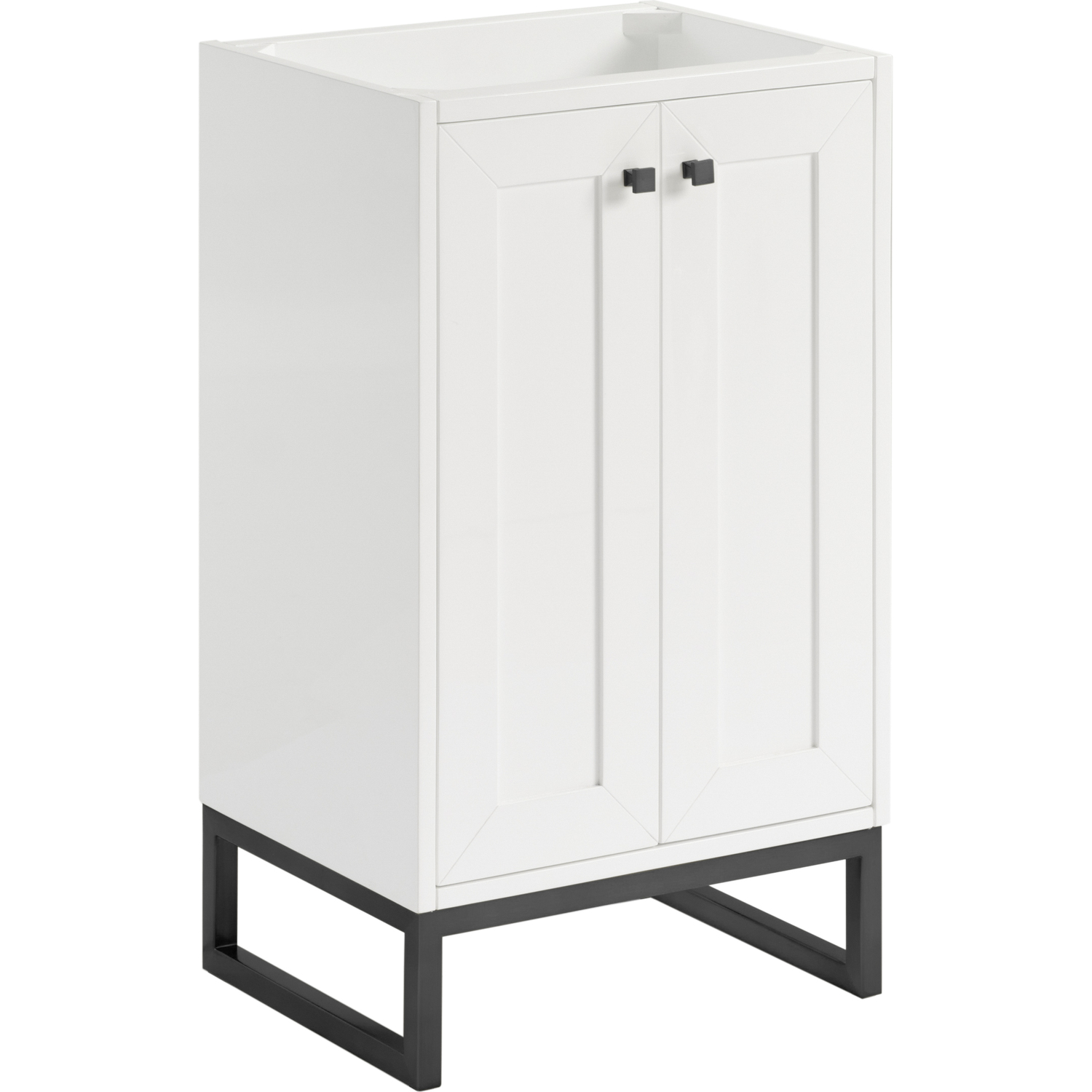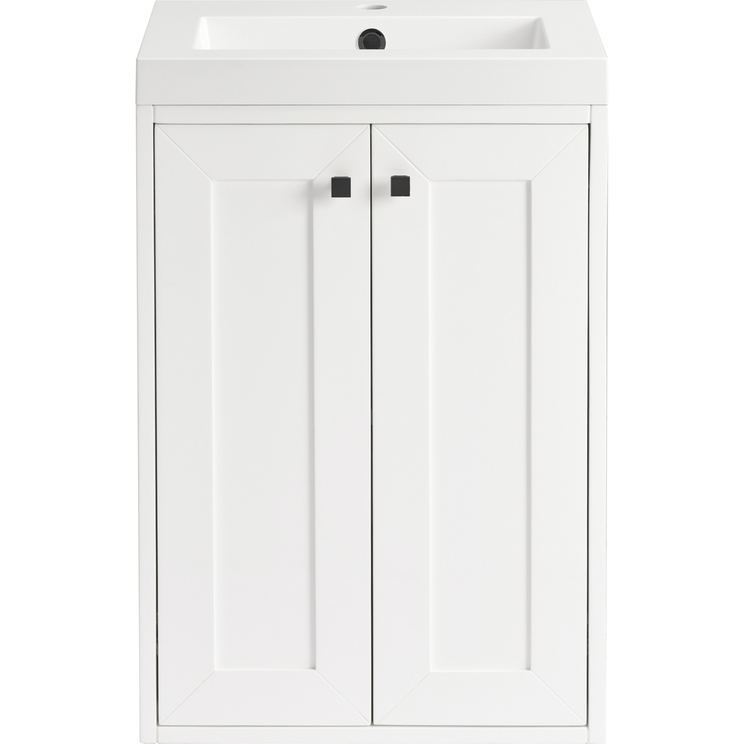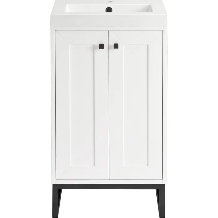 Upgrade your bathroom with the modern simplicity of the Chianti 20" Single Vanity by James Martin Vanities. Crafted from solid hardwoods with a sleek Glossy White finish and topped with a White Glossy Composite Stone countertop, this compact vanity combines style with functionality. Designed for versatility, the Chianti comes with a Matte Black stainless-steel base, or opt to wall-mount for a contemporary, space-saving look. Perfect for smaller spaces like powder rooms or half baths, the streamlined design provides ample storage in a compact footprint. Square knobs in all three metal finishes are included to complete the look, seamlessly coordinating with the base options.Two-door cabinet with interior shelfDoors feature soft-close, adjustable door hingesCabinet features a multi-stage premium finish coat to offer UV and moisture resistanceGlossy White cabinet finish with Matte Black baseWhite Glossy Composite Stone Top with integrated sink includedCountertop is pre-drilled for one single-hole faucetEach cabinet comes with square hardware knobs in all three metal finishes that match the coordinating basesDual-mounted: can be installed freestanding or floatingIncludes matching decorative overflow cover; drain and faucet sold separately.With its streamlined, minimalistic look and versatile staging, Chianti’s compact design provides storage and style for any powder room or half bath; and its simple, yet elegant silhouette pairs effortlessly with a variety of different decors. This small-space solution can be wall-mounted for a more modern look or installed freestanding with a sleek stainless-steel base. The Chianti vanity is available in two finishes. Each cabinet is completed with square hardware knobs, available in three metal finishes that match the optional bases.1 year warranty against manufacturer's defects. We will repair or replace any defective product, if the product is defective in material or workmanship at our discretion. No warranty is expressed or implied regarding damages resulting from consumer misuse.
