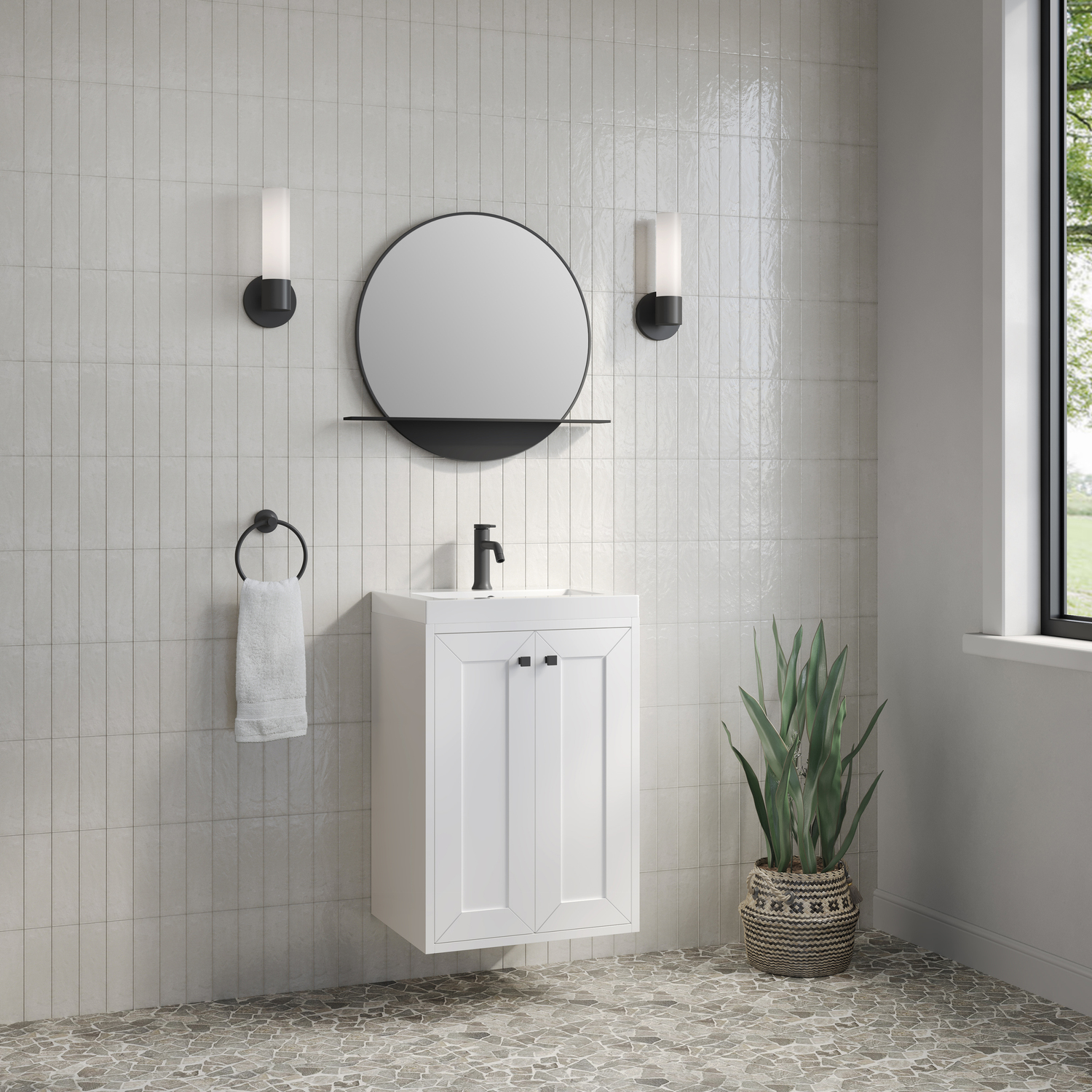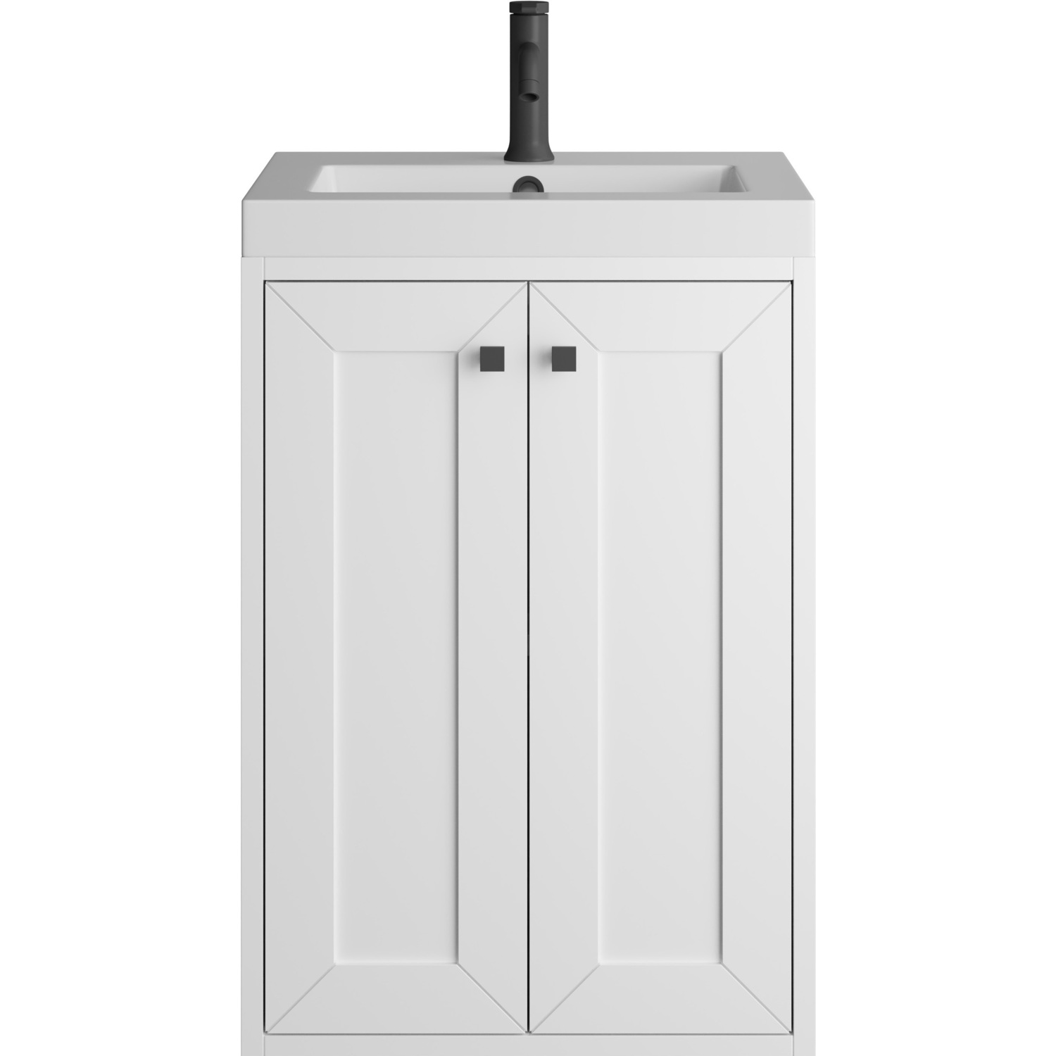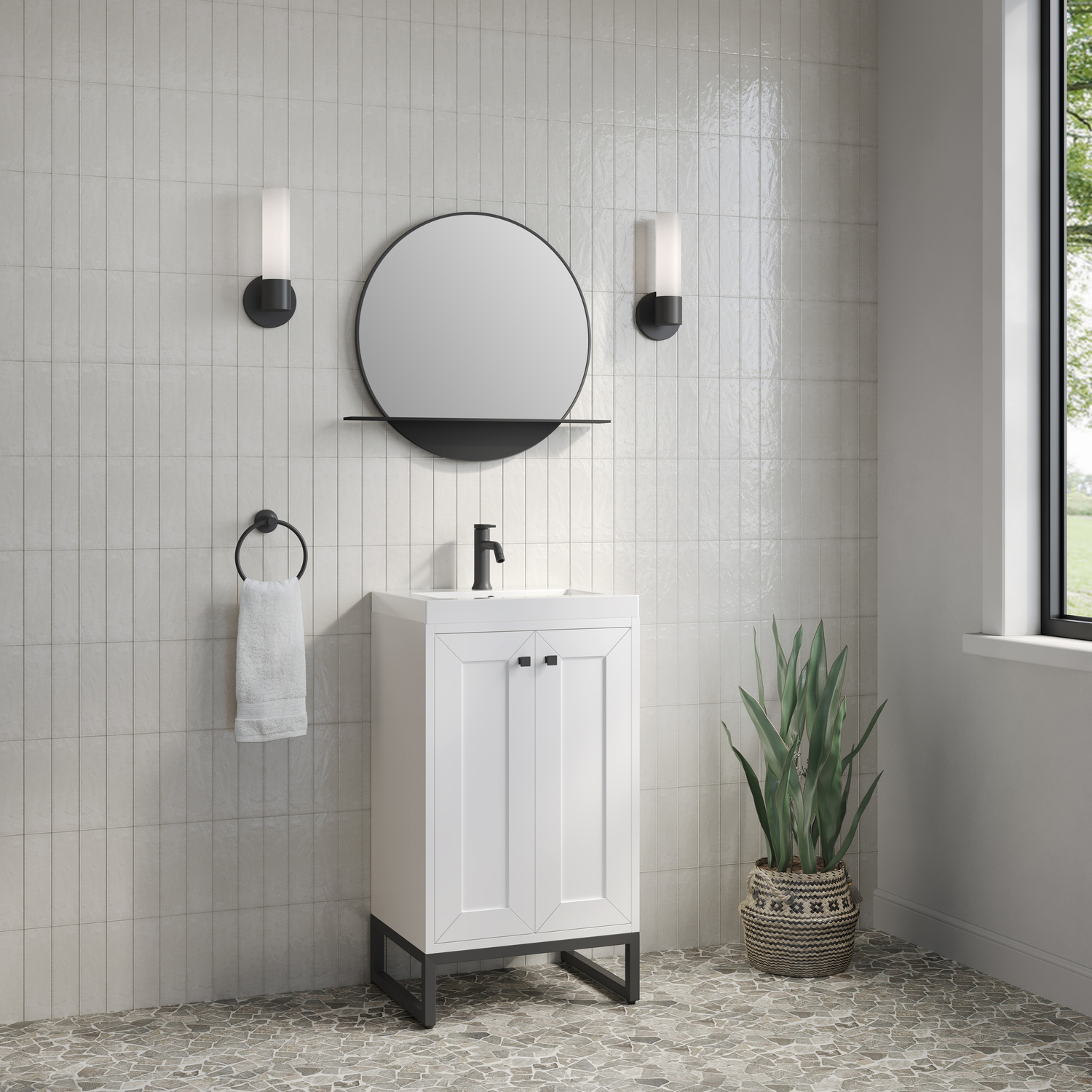 Upgrade your bathroom with the modern simplicity of the Chianti 20" Single Vanity by James Martin Vanities. Crafted from solid hardwoods with a sleek Glossy White finish and topped with a White Glossy Composite Stone countertop, this compact vanity combines style with functionality. Designed for versatility, the Chianti comes with a Matte Black stainless-steel base, or opt to wall-mount for a contemporary, space-saving look. Perfect for smaller spaces like powder rooms or half baths, the streamlined design provides ample storage in a compact footprint. Square knobs in all three metal finishes are included to complete the look, seamlessly coordinating with the base options.Two-door cabinet with interior shelfDoors feature soft-close, adjustable door hingesCabinet features a multi-stage premium finish coat to offer UV and moisture resistanceGlossy White cabinet finish with Matte Black baseWhite Glossy Composite Stone Top with integrated sink includedCountertop is pre-drilled for one single-hole faucetEach cabinet comes with square hardware knobs in all three metal finishes that match the coordinating basesDual-mounted: can be installed freestanding or floatingIncludes matching decorative overflow cover; drain and faucet sold separately.With its streamlined, minimalistic look and versatile staging, Chianti’s compact design provides storage and style for any powder room or half bath; and its simple, yet elegant silhouette pairs effortlessly with a variety of different decors. This small-space solution can be wall-mounted for a more modern look or installed freestanding with a sleek stainless-steel base. The Chianti vanity is available in two finishes. Each cabinet is completed with square hardware knobs, available in three metal finishes that match the optional bases.1 year warranty against manufacturer's defects. We will repair or replace any defective product, if the product is defective in material or workmanship at our discretion. No warranty is expressed or implied regarding damages resulting from consumer misuse.
