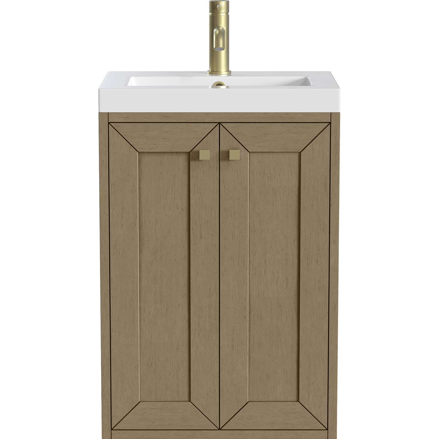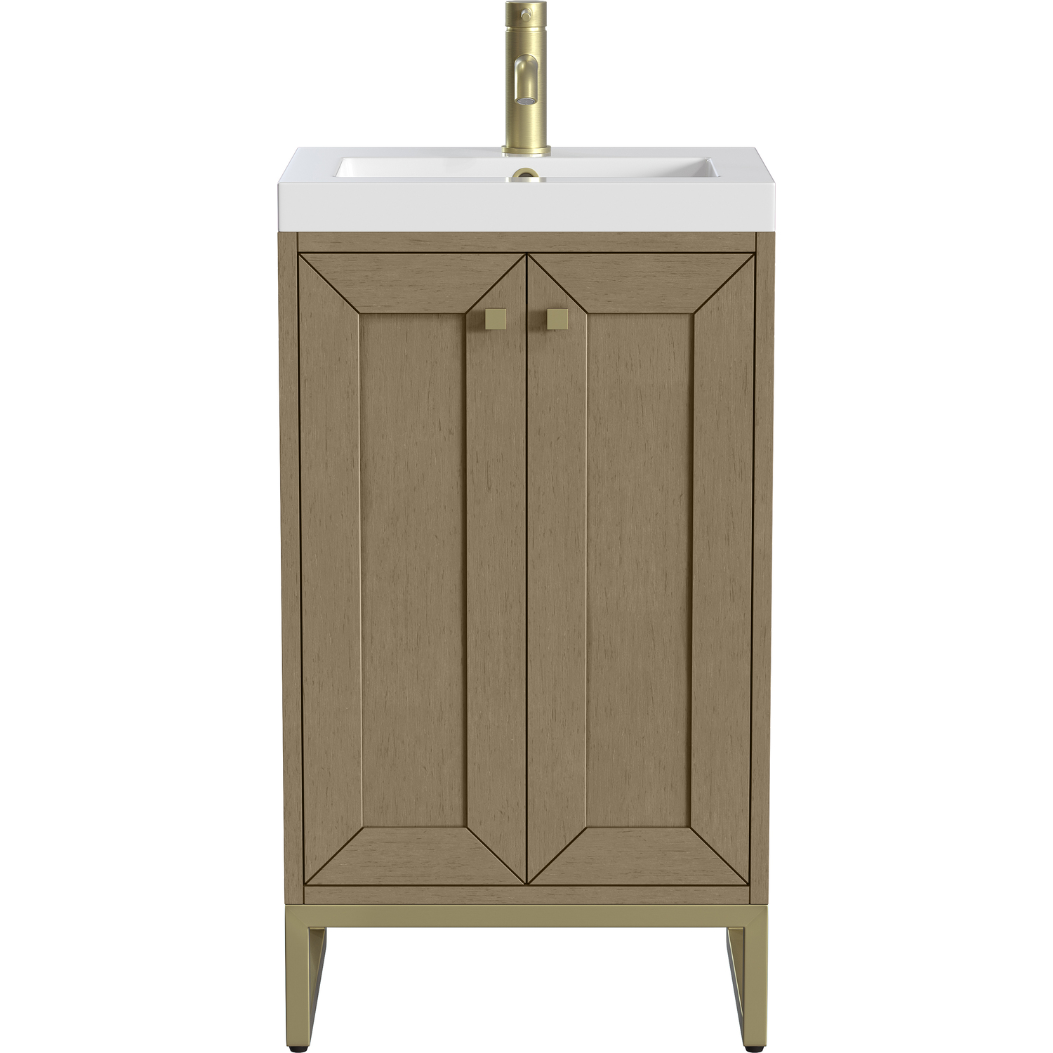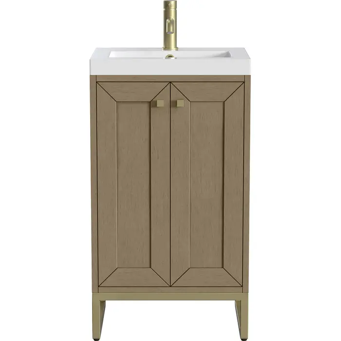 Upgrade your bathroom with the modern simplicity of the Chianti 20" Single Vanity by James Martin Vanities. Crafted from solid hardwoods with a classic Walnut Whisper finish and topped with a White Glossy Composite Stone countertop, this compact vanity combines style with functionality. Designed for versatility, the Chianti comes with a Champagne Brass stainless-steel base, or opt to wall-mount for a contemporary, space-saving look. Perfect for smaller spaces like powder rooms or half baths, the streamlined design provides ample storage in a compact footprint. Square knobs in all three metal finishes are included to complete the look, seamlessly coordinating with the base options.Two-door cabinet with interior shelfDoors feature soft-close, adjustable door hingesCabinet features a multi-stage premium finish coat to offer UV and moisture resistanceWalnut Whisper cabinet finish with Champagne Brass baseWhite Glossy Composite Stone Top with integrated sink includedCountertop is pre-drilled for one single-hole faucetEach cabinet comes with square hardware knobs in all three metal finishes that match the coordinating basesDual-mounted: can be installed freestanding or floatingIncludes matching decorative overflow cover; drain and faucet sold separately.With its streamlined, minimalistic look and versatile staging, Chianti’s compact design provides storage and style for any powder room or half bath; and its simple, yet elegant silhouette pairs effortlessly with a variety of different decors. This small-space solution can be wall-mounted for a more modern look or installed freestanding with a sleek stainless-steel base. The Chianti vanity is available in two finishes. Each cabinet is completed with square hardware knobs, available in three metal finishes that match the optional bases.1 year warranty against manufacturer's defects. We will repair or replace any defective product, if the product is defective in material or workmanship at our discretion. No warranty is expressed or implied regarding damages resulting from consumer misuse.