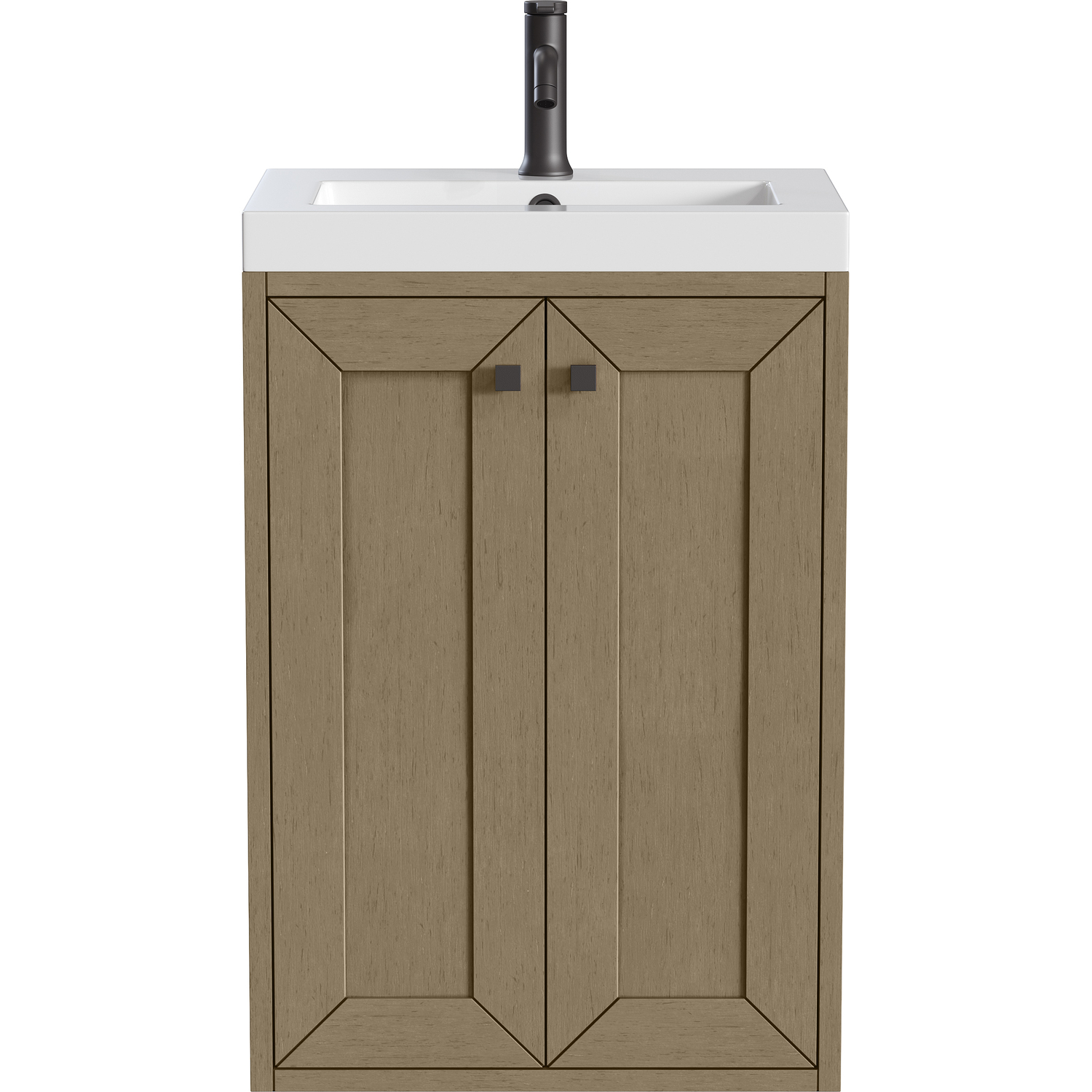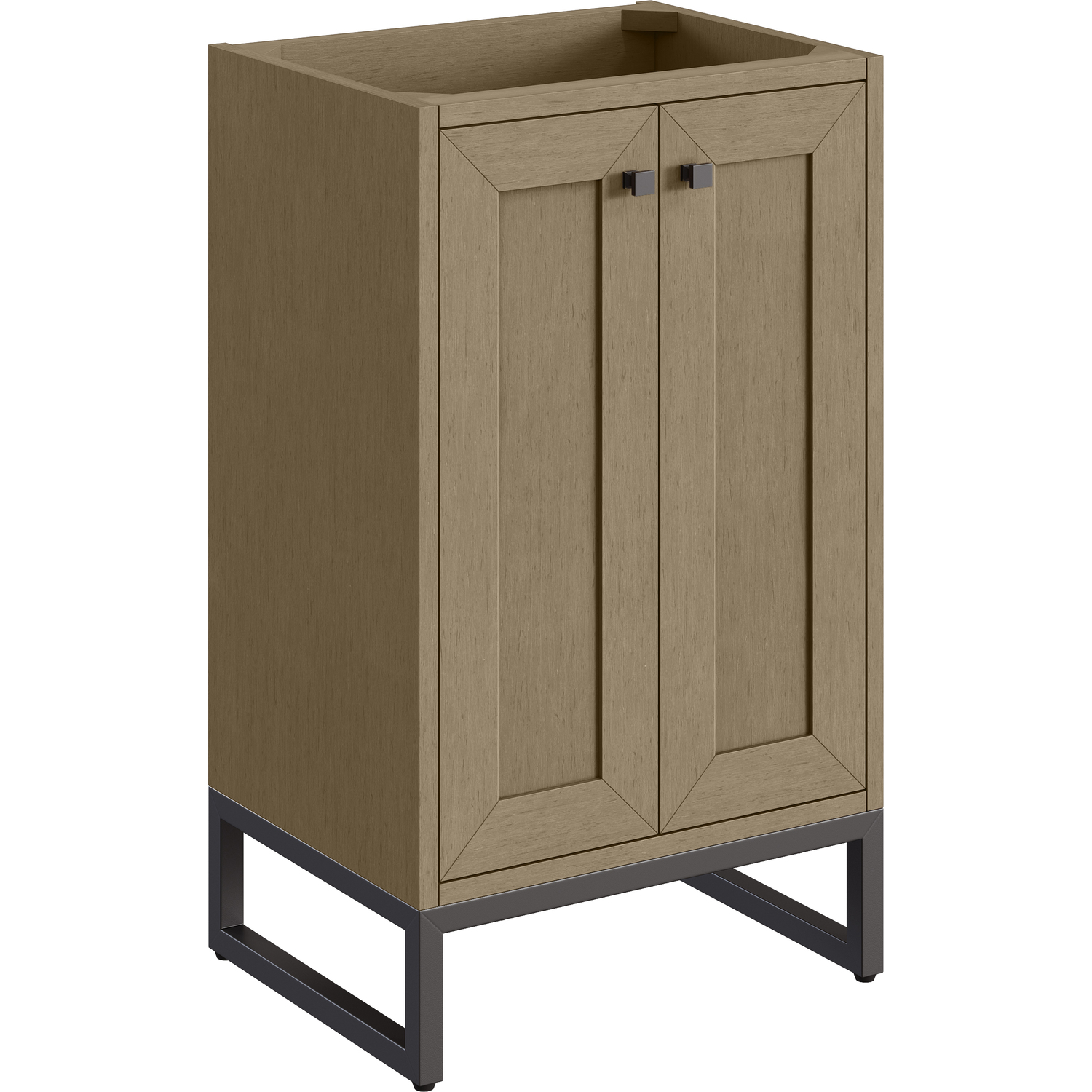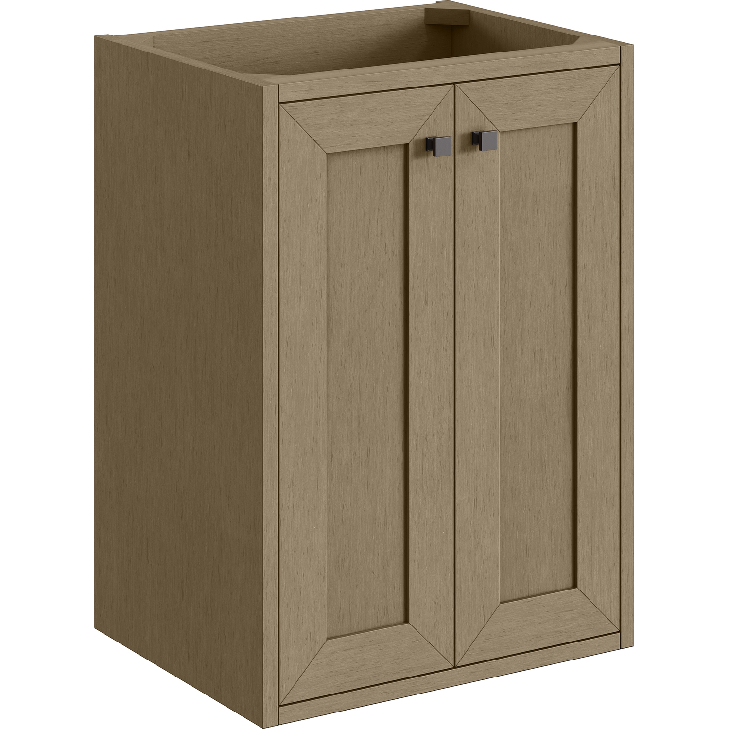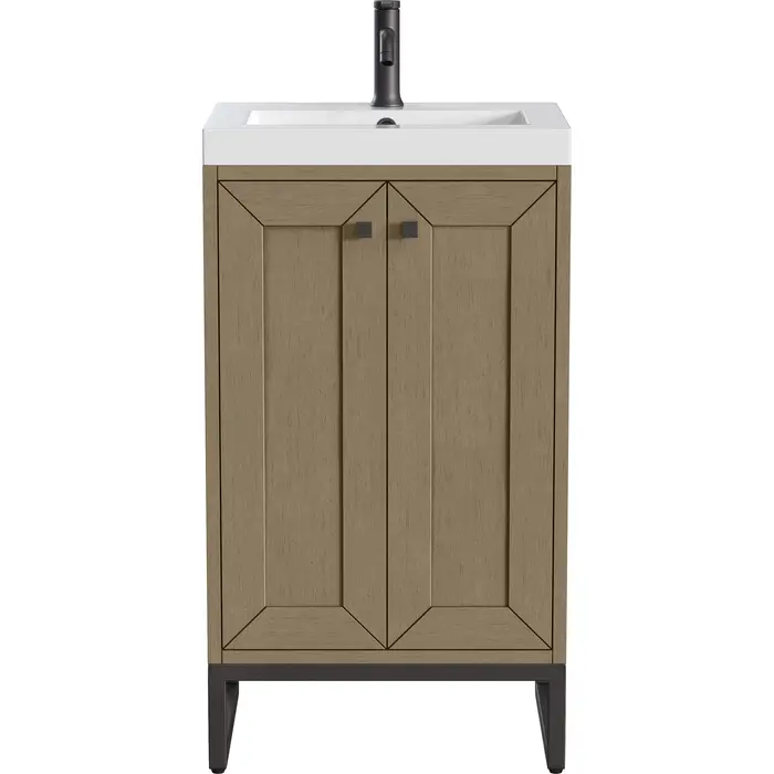Upgrade your bathroom with the modern simplicity of the Chianti 20" Single Vanity by James Martin Vanities. Crafted from solid hardwoods with a classic Walnut Whisper finish and topped with a White Glossy Composite Stone countertop, this compact vanity combines style with functionality. Designed for versatility, the Chianti comes with a Matte Black stainless-steel base, or opt to wall-mount for a contemporary, space-saving look. Perfect for smaller spaces like powder rooms or half baths, the streamlined design provides ample storage in a compact footprint. Square knobs in all three metal finishes are included to complete the look, seamlessly coordinating with the base options.Two-door cabinet with interior shelfDoors feature soft-close, adjustable door hingesCabinet features a multi-stage premium finish coat to offer UV and moisture resistanceWalnut Whisper cabinet finish with Matte Black baseWhite Glossy Composite Stone Top with integrated sink includedCountertop is pre-drilled for one single-hole faucetEach cabinet comes with square hardware knobs in all three metal finishes that match the coordinating basesDual-mounted: can be installed freestanding or floatingIncludes matching decorative overflow cover; drain and faucet sold separately.With its streamlined, minimalistic look and versatile staging, Chianti’s compact design provides storage and style for any powder room or half bath; and its simple, yet elegant silhouette pairs effortlessly with a variety of different decors. This small-space solution can be wall-mounted for a more modern look or installed freestanding with a sleek stainless-steel base. The Chianti vanity is available in two finishes. Each cabinet is completed with square hardware knobs, available in three metal finishes that match the optional bases.1 year warranty against manufacturer's defects. We will repair or replace any defective product, if the product is defective in material or workmanship at our discretion. No warranty is expressed or implied regarding damages resulting from consumer misuse.