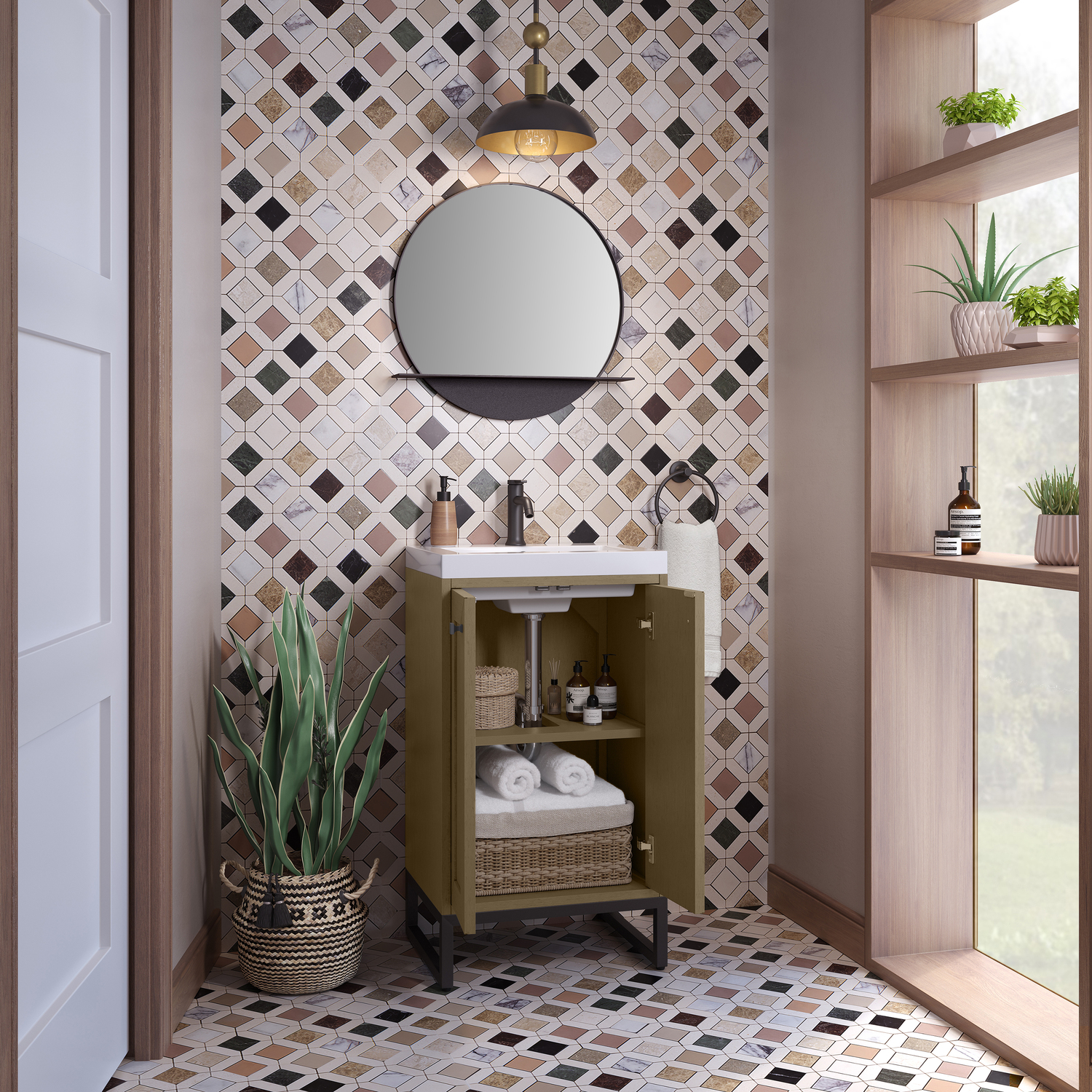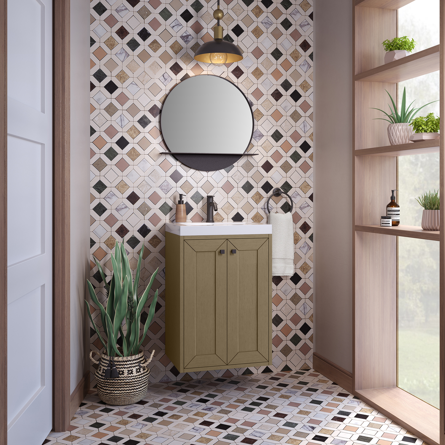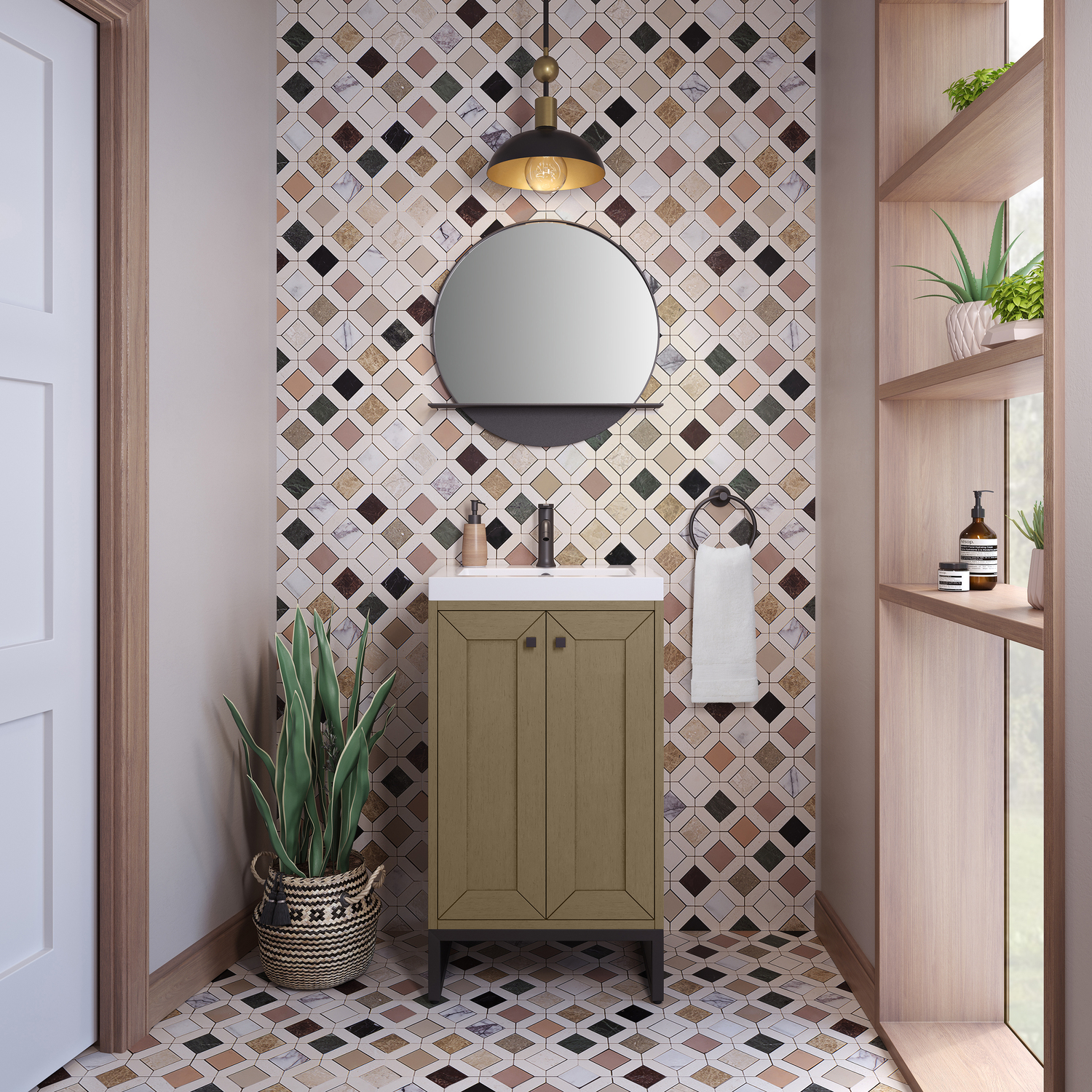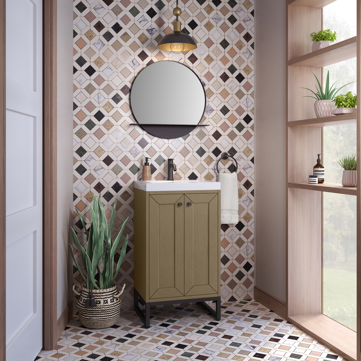 Upgrade your bathroom with the modern simplicity of the Chianti 20" Single Vanity by James Martin Vanities. Crafted from solid hardwoods with a classic Walnut Whisper finish and topped with a White Glossy Composite Stone countertop, this compact vanity combines style with functionality. Designed for versatility, the Chianti comes with a Matte Black stainless-steel base, or opt to wall-mount for a contemporary, space-saving look. Perfect for smaller spaces like powder rooms or half baths, the streamlined design provides ample storage in a compact footprint. Square knobs in all three metal finishes are included to complete the look, seamlessly coordinating with the base options.Two-door cabinet with interior shelfDoors feature soft-close, adjustable door hingesCabinet features a multi-stage premium finish coat to offer UV and moisture resistanceWalnut Whisper cabinet finish with Matte Black baseWhite Glossy Composite Stone Top with integrated sink includedCountertop is pre-drilled for one single-hole faucetEach cabinet comes with square hardware knobs in all three metal finishes that match the coordinating basesDual-mounted: can be installed freestanding or floatingIncludes matching decorative overflow cover; drain and faucet sold separately.With its streamlined, minimalistic look and versatile staging, Chianti’s compact design provides storage and style for any powder room or half bath; and its simple, yet elegant silhouette pairs effortlessly with a variety of different decors. This small-space solution can be wall-mounted for a more modern look or installed freestanding with a sleek stainless-steel base. The Chianti vanity is available in two finishes. Each cabinet is completed with square hardware knobs, available in three metal finishes that match the optional bases.1 year warranty against manufacturer's defects. We will repair or replace any defective product, if the product is defective in material or workmanship at our discretion. No warranty is expressed or implied regarding damages resulting from consumer misuse.