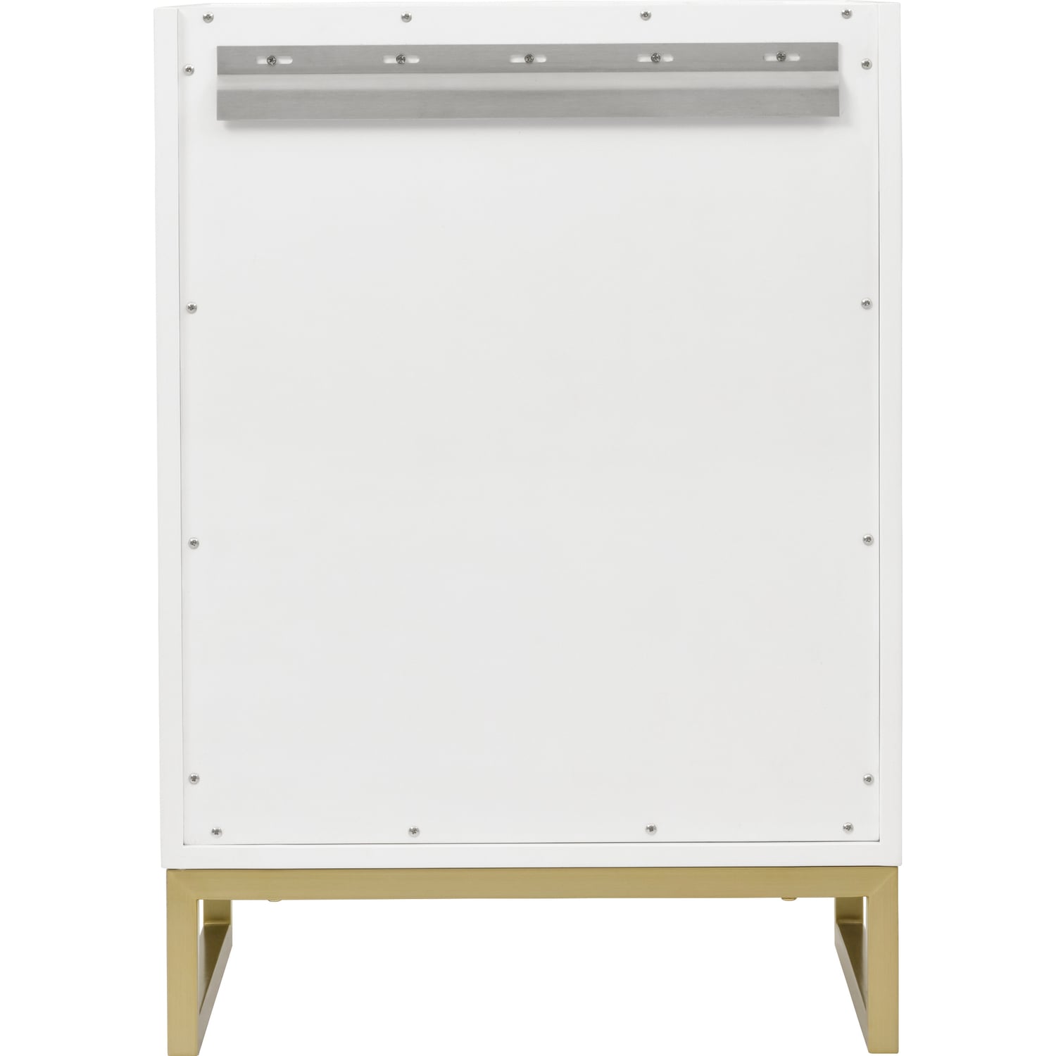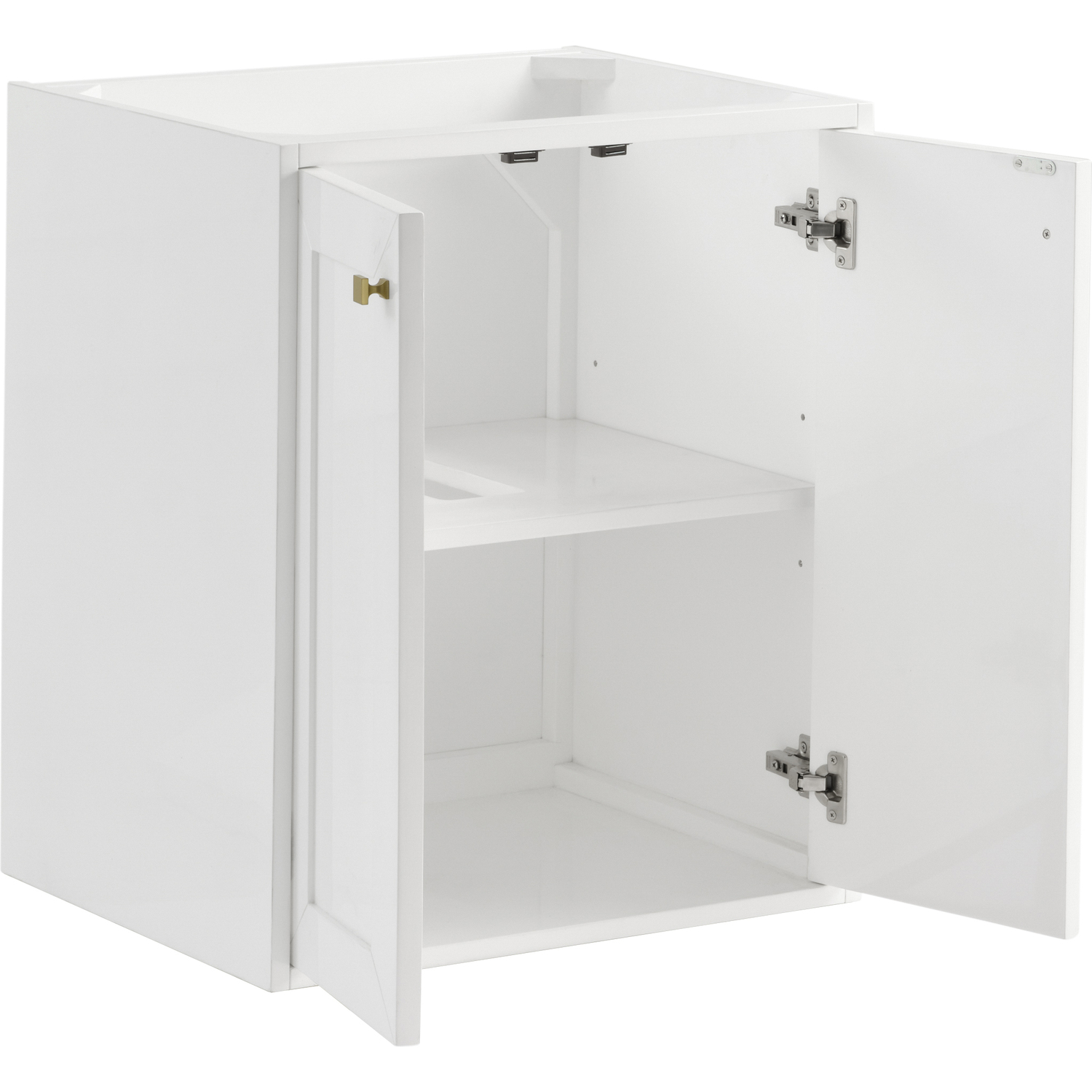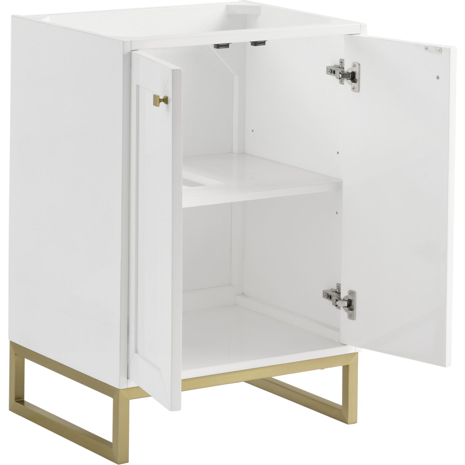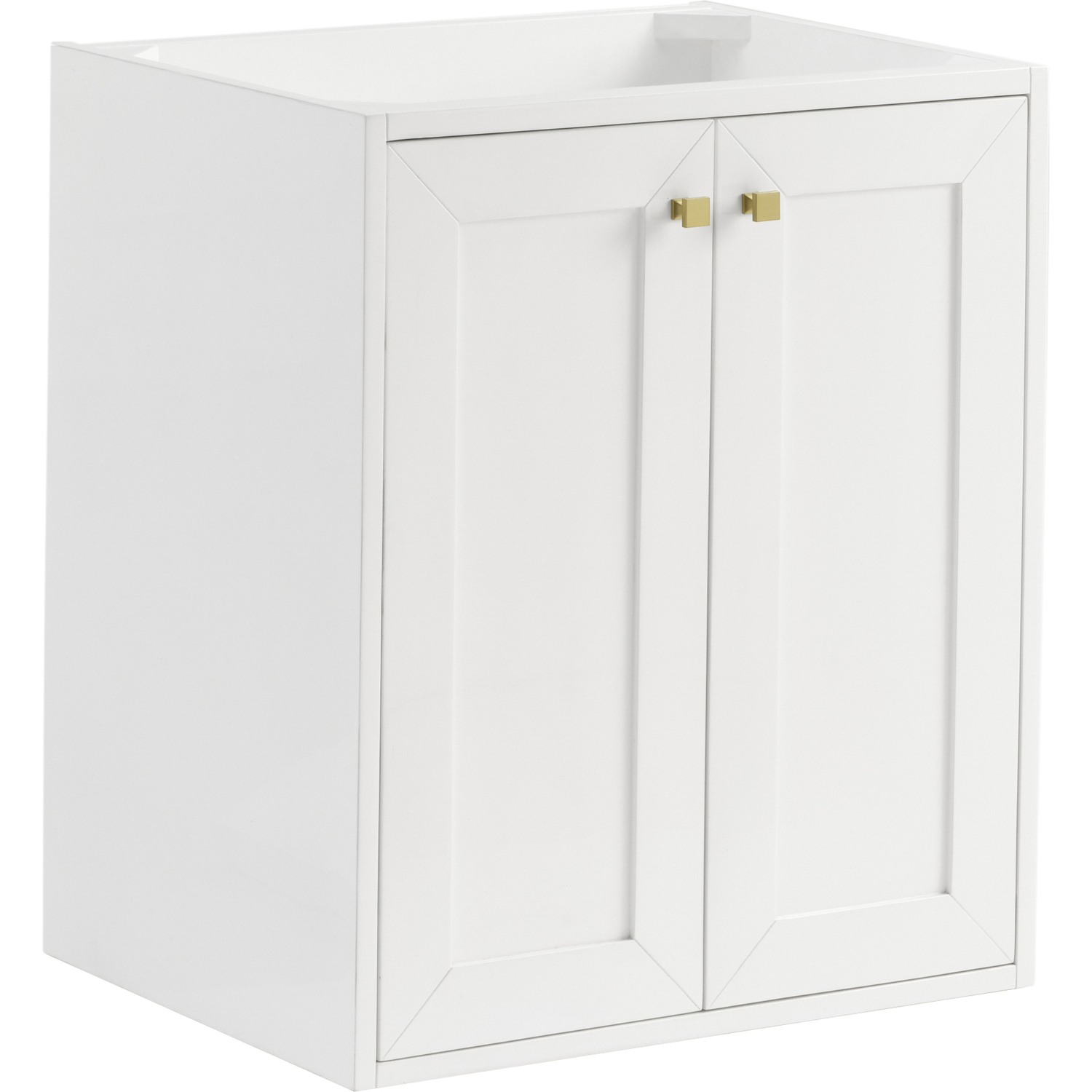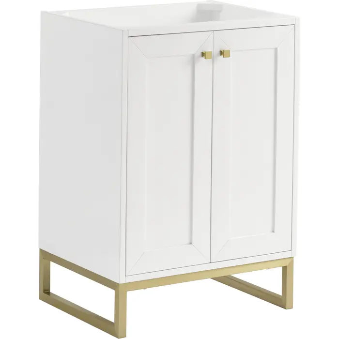 Upgrade your bathroom with the modern simplicity of the Chianti 24" Single Vanity by James Martin Vanities. Crafted from solid hardwoods with a sleek Glossy White finish, this compact vanity combines style with functionality. Designed for versatility, the Chianti comes with a Champagne Brass stainless-steel base, or opt to wall-mount for a contemporary, space-saving look. Perfect for smaller spaces like powder rooms or half baths, the streamlined design provides ample storage in a compact footprint. Square knobs in all three metal finishes are included to complete the look, seamlessly coordinating with the base options.Two-door cabinet with interior shelfDoors feature soft-close, adjustable door hingesCabinet features a multi-stage premium finish coat to offer UV and moisture resistanceGlossy White cabinet finish with Champagne Brass baseCabinet and base only; complete the vanity with our White Glossy composite stone sinkEach cabinet comes with square hardware knobs in all three metal finishes that match the coordinating basesDual-mounted: can be installed freestanding or floatingWith its streamlined, minimalistic look and versatile staging, Chianti’s compact design provides storage and style for any powder room or half bath; and its simple, yet elegant silhouette pairs effortlessly with a variety of different decors. This small-space solution can be wall-mounted for a more modern look or installed freestanding with a sleek stainless-steel base. The Chianti vanity is available in two finishes. Each cabinet is completed with square hardware knobs, available in three metal finishes that match the optional bases.1 year warranty against manufacturer's defects. We will repair or replace any defective product, if the product is defective in material or workmanship at our discretion. No warranty is expressed or implied regarding damages resulting from consumer misuse.