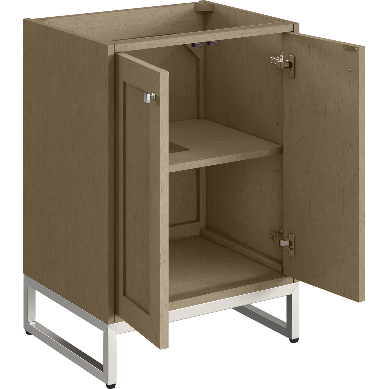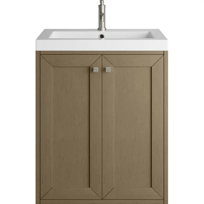 Upgrade your bathroom with the modern simplicity of the Chianti 24" Single Vanity by James Martin Vanities. Crafted from solid hardwoods with a classic Walnut Whisper finish and topped with a White Glossy Composite Stone countertop, this compact vanity combines style with functionality. Designed for versatility, the Chianti can be wall-mounted for a space-saving and contemporary feel, or paired with an optional stainless-steel base in one of three finishes. Perfect for smaller spaces like powder rooms or half baths, the streamlined design provides ample storage in a compact footprint. Square knobs in all three metal finishes are included to complete the look, seamlessly coordinating with the optional bases.Two-door cabinet with interior shelfDoors feature soft-close, adjustable door hingesCabinet features a multi-stage premium finish coat to offer UV and moisture resistanceWalnut Whisper cabinet finishWhite Glossy Composite Stone Top with integrated sink includedCountertop is pre-drilled for one single-hole faucetEach cabinet comes with square hardware knobs in all three metal finishes that match the coordinating basesFloating vanityIncludes matching decorative overflow cover; drain and faucet sold separately.Optional base sold separatelyWith its streamlined, minimalistic look and versatile staging, Chianti’s compact design provides storage and style for any powder room or half bath; and its simple, yet elegant silhouette pairs effortlessly with a variety of different decors. This small-space solution can be wall-mounted for a more modern look or installed freestanding with a sleek stainless-steel base. The Chianti vanity is available in two finishes. Each cabinet is completed with square hardware knobs, available in three metal finishes that match the optional bases.1 year warranty against manufacturer's defects. We will repair or replace any defective product, if the product is defective in material or workmanship at our discretion. No warranty is expressed or implied regarding damages resulting from consumer misuse.