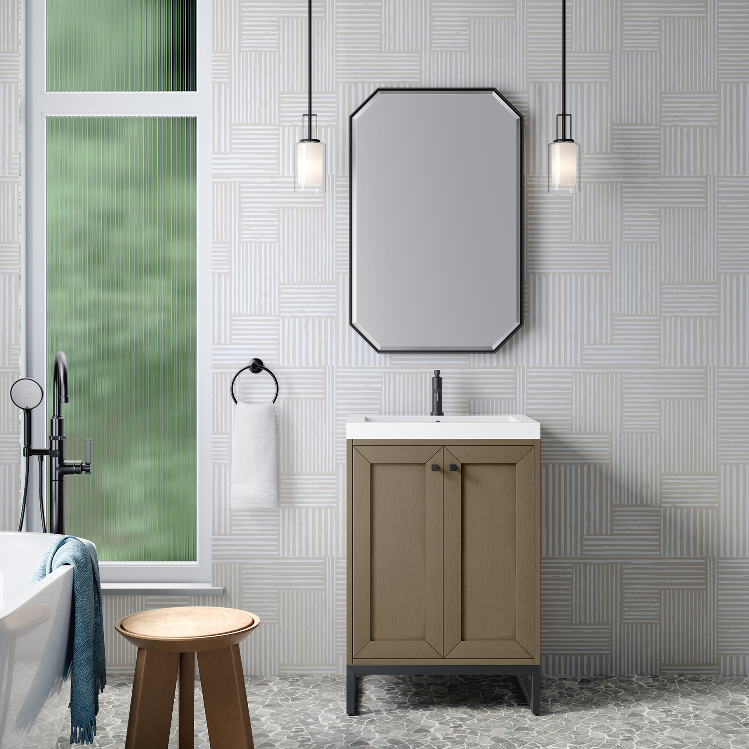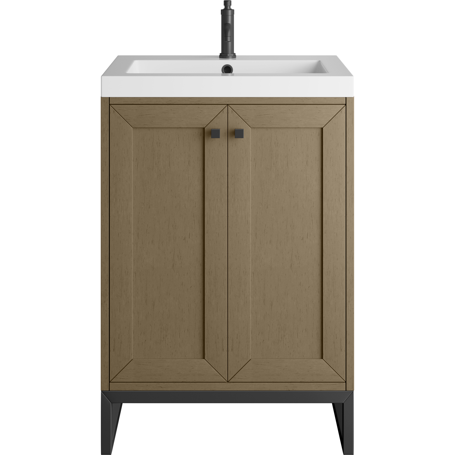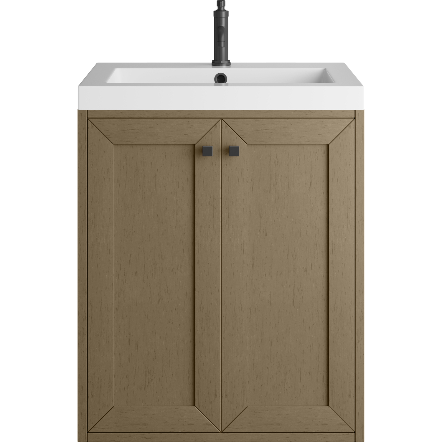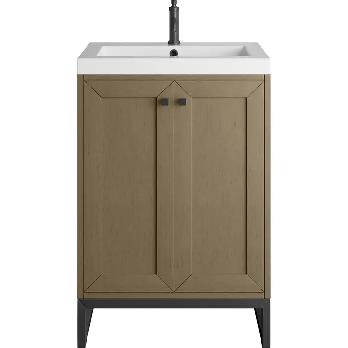 Upgrade your bathroom with the modern simplicity of the Chianti 24" Single Vanity by James Martin Vanities. Crafted from solid hardwoods with a classic Walnut Whisper finish and topped with a White Glossy Composite Stone countertop, this compact vanity combines style with functionality. Designed for versatility, the Chianti comes with a Matte Black stainless-steel base, or opt to wall-mount for a contemporary, space-saving look. Perfect for smaller spaces like powder rooms or half baths, the streamlined design provides ample storage in a compact footprint. Square knobs in all three metal finishes are included to complete the look, seamlessly coordinating with the base options.Two-door cabinet with interior shelfDoors feature soft-close, adjustable door hingesCabinet features a multi-stage premium finish coat to offer UV and moisture resistanceWalnut Whisper cabinet finish with Matte Black baseWhite Glossy Composite Stone Top with integrated sink includedCountertop is pre-drilled for one single-hole faucetEach cabinet comes with square hardware knobs in all three metal finishes that match the coordinating basesDual-mounted: can be installed freestanding or floatingIncludes matching decorative overflow cover; drain and faucet sold separately.With its streamlined, minimalistic look and versatile staging, Chianti’s compact design provides storage and style for any powder room or half bath; and its simple, yet elegant silhouette pairs effortlessly with a variety of different decors. This small-space solution can be wall-mounted for a more modern look or installed freestanding with a sleek stainless-steel base. The Chianti vanity is available in two finishes. Each cabinet is completed with square hardware knobs, available in three metal finishes that match the optional bases.1 year warranty against manufacturer's defects. We will repair or replace any defective product, if the product is defective in material or workmanship at our discretion. No warranty is expressed or implied regarding damages resulting from consumer misuse.