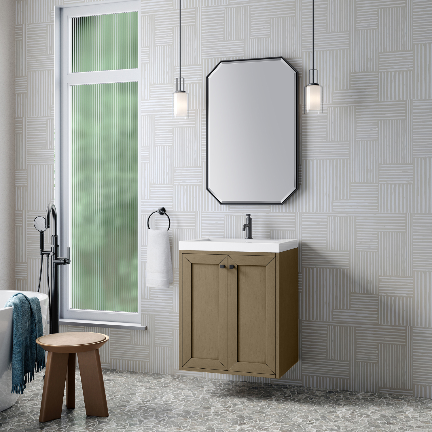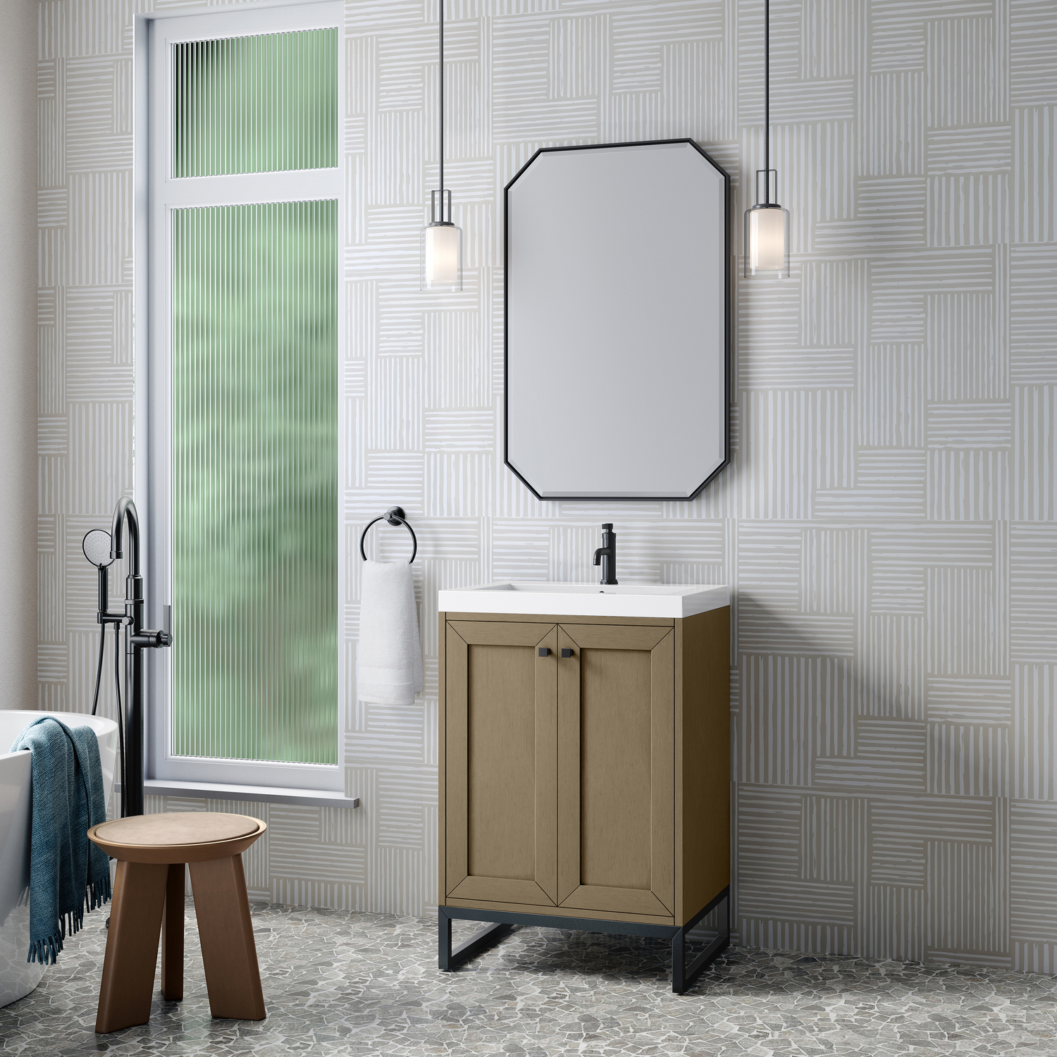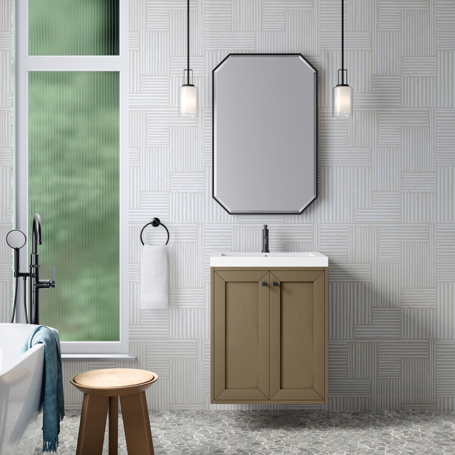 Upgrade your bathroom with the modern simplicity of the Chianti 24" Single Vanity by James Martin Vanities. Crafted from solid hardwoods with a classic Walnut Whisper finish and topped with a White Glossy Composite Stone countertop, this compact vanity combines style with functionality. Designed for versatility, the Chianti comes with a Matte Black stainless-steel base, or opt to wall-mount for a contemporary, space-saving look. Perfect for smaller spaces like powder rooms or half baths, the streamlined design provides ample storage in a compact footprint. Square knobs in all three metal finishes are included to complete the look, seamlessly coordinating with the base options.Two-door cabinet with interior shelfDoors feature soft-close, adjustable door hingesCabinet features a multi-stage premium finish coat to offer UV and moisture resistanceWalnut Whisper cabinet finish with Matte Black baseWhite Glossy Composite Stone Top with integrated sink includedCountertop is pre-drilled for one single-hole faucetEach cabinet comes with square hardware knobs in all three metal finishes that match the coordinating basesDual-mounted: can be installed freestanding or floatingIncludes matching decorative overflow cover; drain and faucet sold separately.With its streamlined, minimalistic look and versatile staging, Chianti’s compact design provides storage and style for any powder room or half bath; and its simple, yet elegant silhouette pairs effortlessly with a variety of different decors. This small-space solution can be wall-mounted for a more modern look or installed freestanding with a sleek stainless-steel base. The Chianti vanity is available in two finishes. Each cabinet is completed with square hardware knobs, available in three metal finishes that match the optional bases.1 year warranty against manufacturer's defects. We will repair or replace any defective product, if the product is defective in material or workmanship at our discretion. No warranty is expressed or implied regarding damages resulting from consumer misuse.