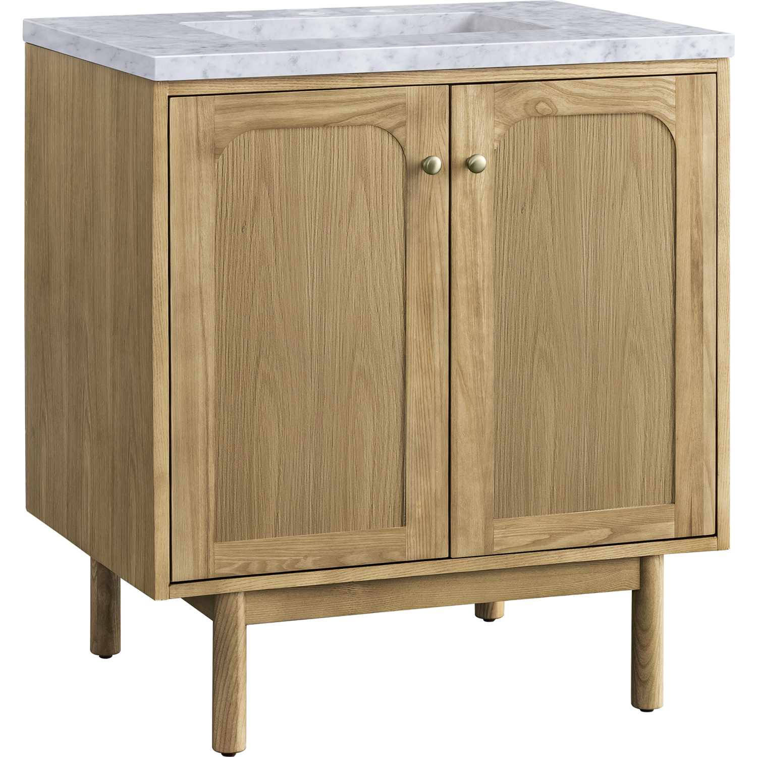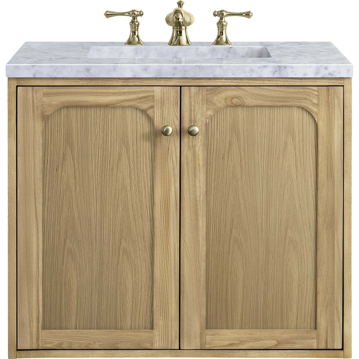 A modern interpretation of mid-century design, the Laurent 30" Single Vanity features organic charm with soft, rounded picture-frame details. Its Light Natural Oak finish over cathedral grain Ash veneers highlights the beautiful, natural wood texture, while Champagne Brass knobs lend a touch of elegance. Designed for versatility, this vanity cabinet features two doors with an adjustable shelf, a conveniently integrated USB/120V power unit, and the option to install as a freestanding or floating vanity. Perfectly crafted and beautifully appointed, Laurent brings an understated elegance to any bathroom. A timeless Carrara Marble top completes the look.Two-door cabinet with one internal shelfDoors feature soft-close, adjustable door hingesCabinet features a multi-stage premium finish coat to offer UV and moisture resistanceLight Natural Oak finish with Champagne Brass hardwareCountertop is pre-drilled for an 8" widespread faucet; our 3cm eased edge countertops come with white porcelain curved basin sink that ships separately and includes mounting brackets for easy installationIntegrated 120V outlet with USB portsDual-mounted: can be installed freestanding or floatingFaucet sold separatelyDesigned with a contemporary appeal, the Laurent Collection is a modern interpretation of mid-century design, featuring rounded picture-frame detailing in a beautiful Light Natural Oak finish over cathedral grain Ash veneers. Available in six sizes, the Laurent can be installed as a floating vanity or can remain freestanding. Let the beautiful natural wood and elegant design create a beautiful focal point for any bathroom space.1 year warranty against manufacturer's defects. We will repair or replace any defective product, if the product is defective in material or workmanship at our discretion. No warranty is expressed or implied regarding damages resulting from consumer misuse.